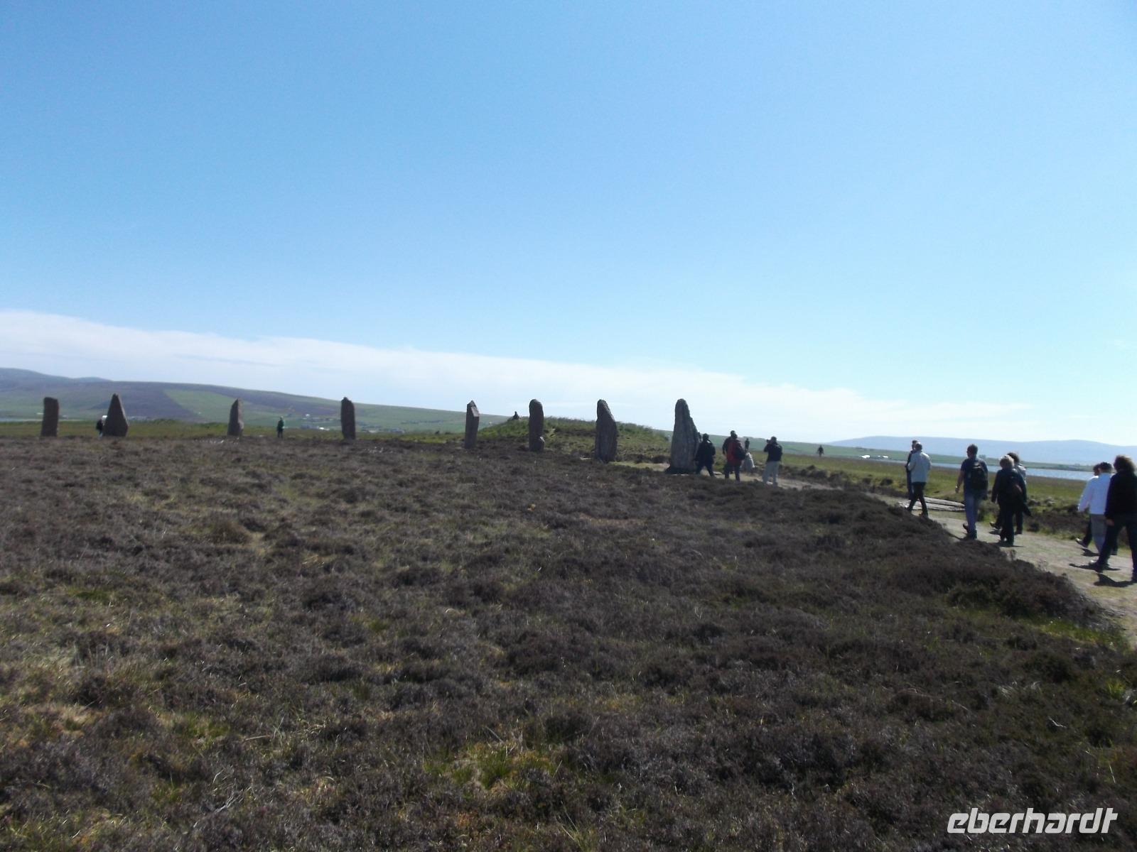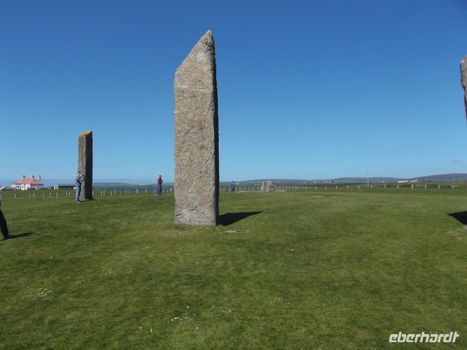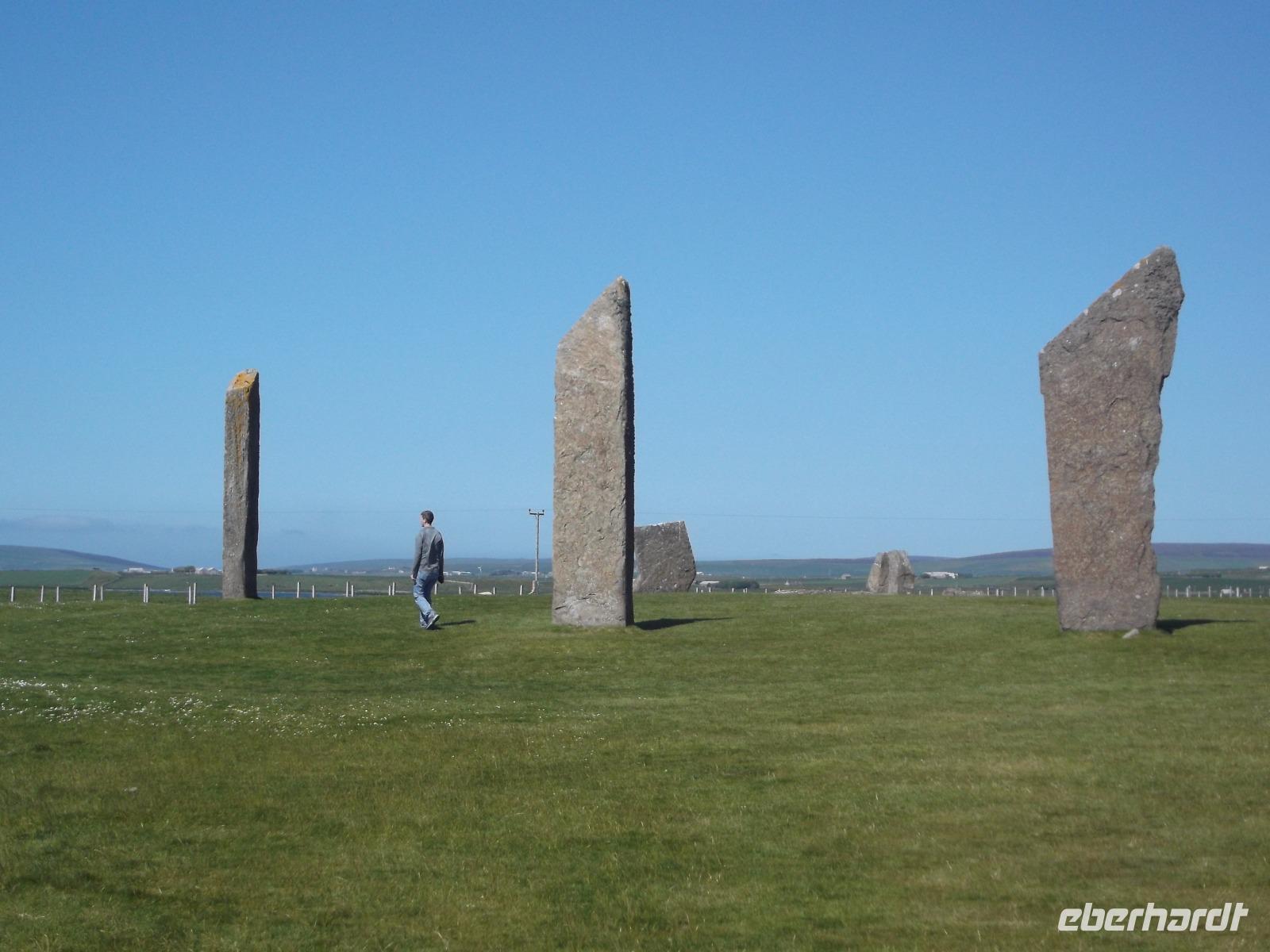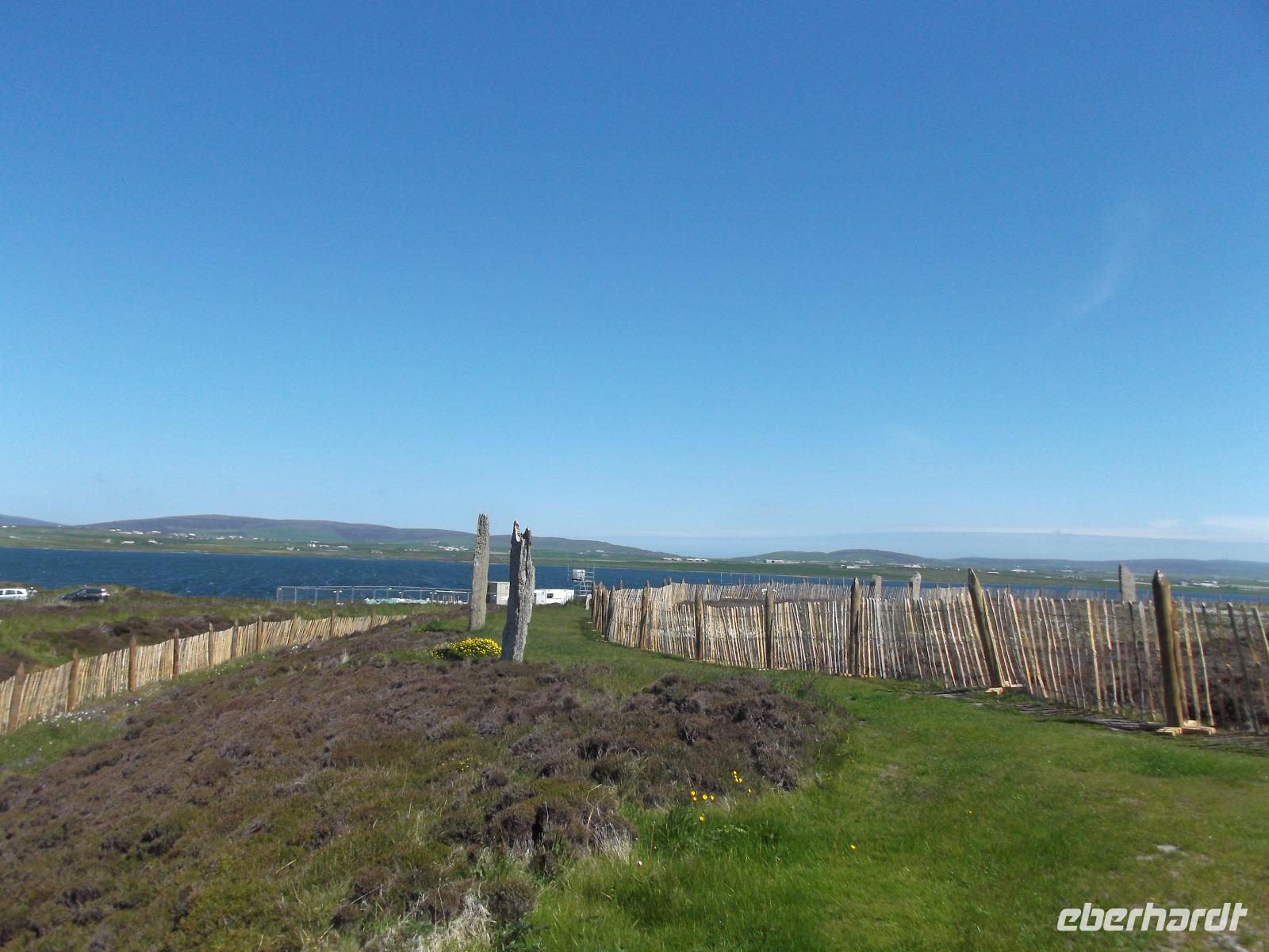 Ein echter Höhepunkt auf den Orkneys, auf denen wir - ungewöhnlich für diese nördliche Inselgruppe - den ganzen Tag strahlenden Sonnenschein hatten - ist die Besichtigung des Steinzeitdorfes Scara Brae. Die Überreste einer der ältesten menschlichen Siedlungen in Europa zeigen in einer gut und anschaulich präsentierten Ausgrabung die Bauten und die Lebensweise der Bewohner vor über fünftausend Jahren - also einer Siedlung, die weit älter ist als die ägyptischen Pyramiden. Nach dem Besuch des Steinzeitdorfes und des benachbarten Herrensitzes „Scull House" fuhren wir weiter zum Steinkreis „Ring of Brodgar", der gerade „restauriert" - also gesichert und befestigt wird. Dieser megalithische Steinkreis ist einer der größten bekannten und gut erhaltenen Steinkreise mit über 100 Metern Durchmesser. Er ist wesentlich größer als der von Callanish, den wir auf Lewis besucht hatten. Auf der Weiterfahrt hielten wir natürlich auch an den „Standing Stones of Stenness". Das war auch einst ein Steinkreis, aber von dessen Bestand sind nur noch vier Megalithen erhalten.