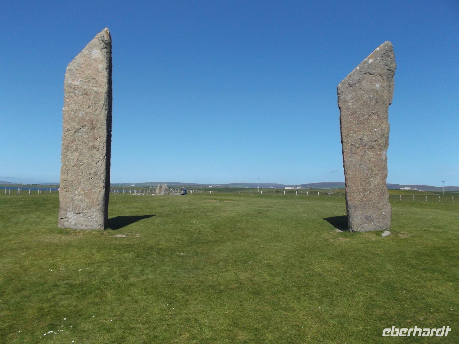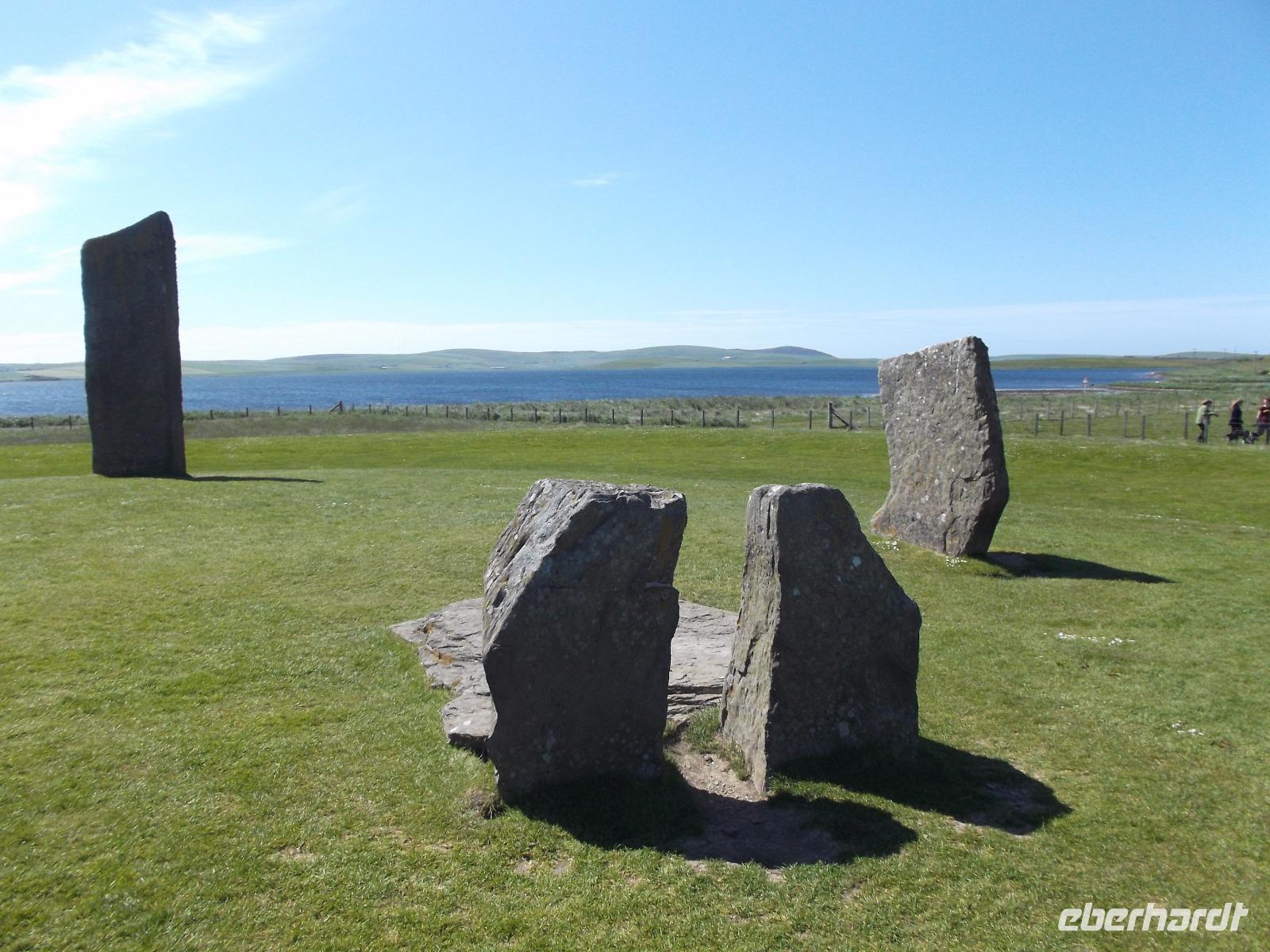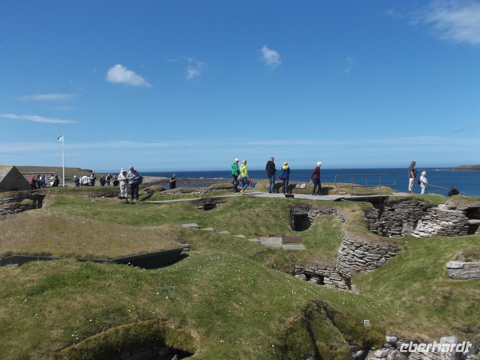 Ein echter Höhepunkt auf den Orkneys, auf denen wir - ungewöhnlich für diese nördliche Inselgruppe - den ganzen Tag strahlenden Sonnenschein hatten - ist die Besichtigung des Steinzeitdorfes Scara Brae. Die Überreste einer der ältesten menschlichen Siedlungen in Europa zeigen in einer gut und anschaulich präsentierten Ausgrabung die Bauten und die Lebensweise der Bewohner vor über fünftausend Jahren - also einer Siedlung, die weit älter ist als die ägyptischen Pyramiden. Nach dem Besuch des Steinzeitdorfes und des benachbarten Herrensitzes „Scull House" fuhren wir weiter zum Steinkreis „Ring of Brodgar", der gerade „restauriert" - also gesichert und befestigt wird. Dieser megalithische Steinkreis ist einer der größten bekannten und gut erhaltenen Steinkreise mit über 100 Metern Durchmesser. Er ist wesentlich größer als der von Callanish, den wir auf Lewis besucht hatten. Auf der Weiterfahrt hielten wir natürlich auch an den „Standing Stones of Stenness". Das war auch einst ein Steinkreis, aber von dessen Bestand sind nur noch vier Megalithen erhalten.
