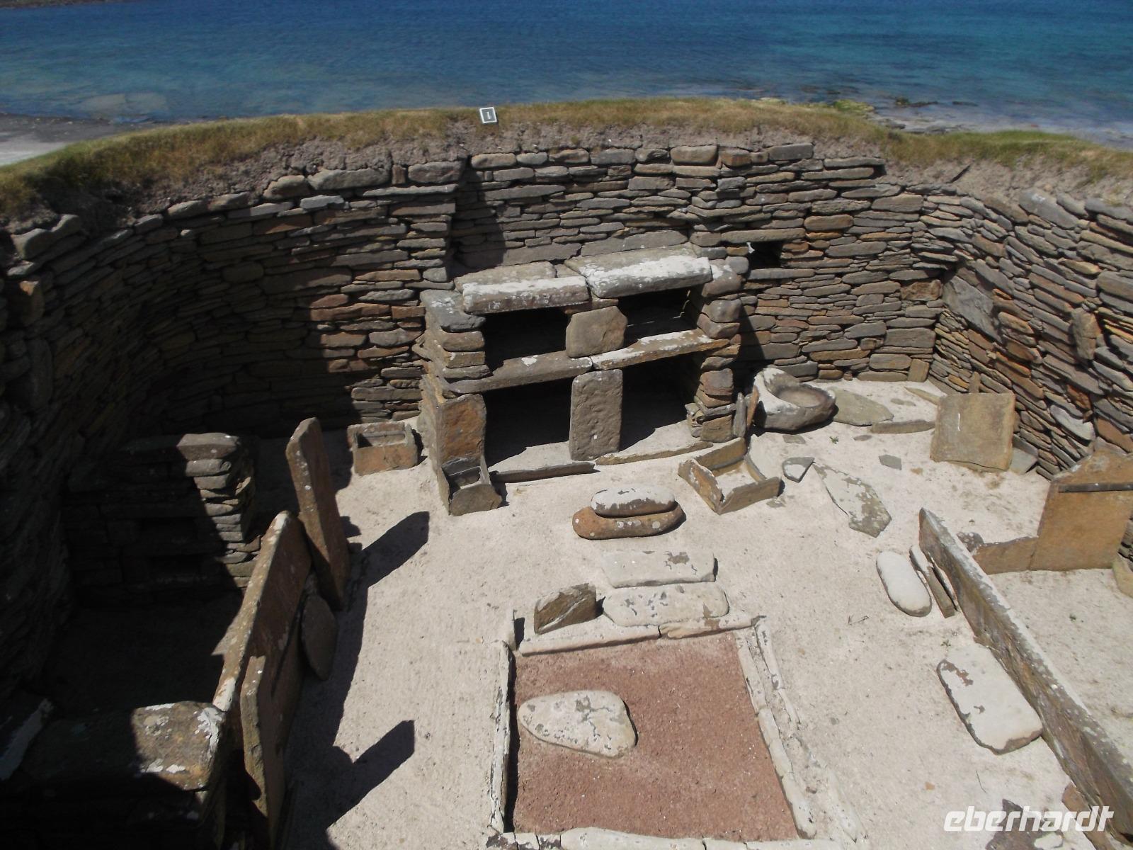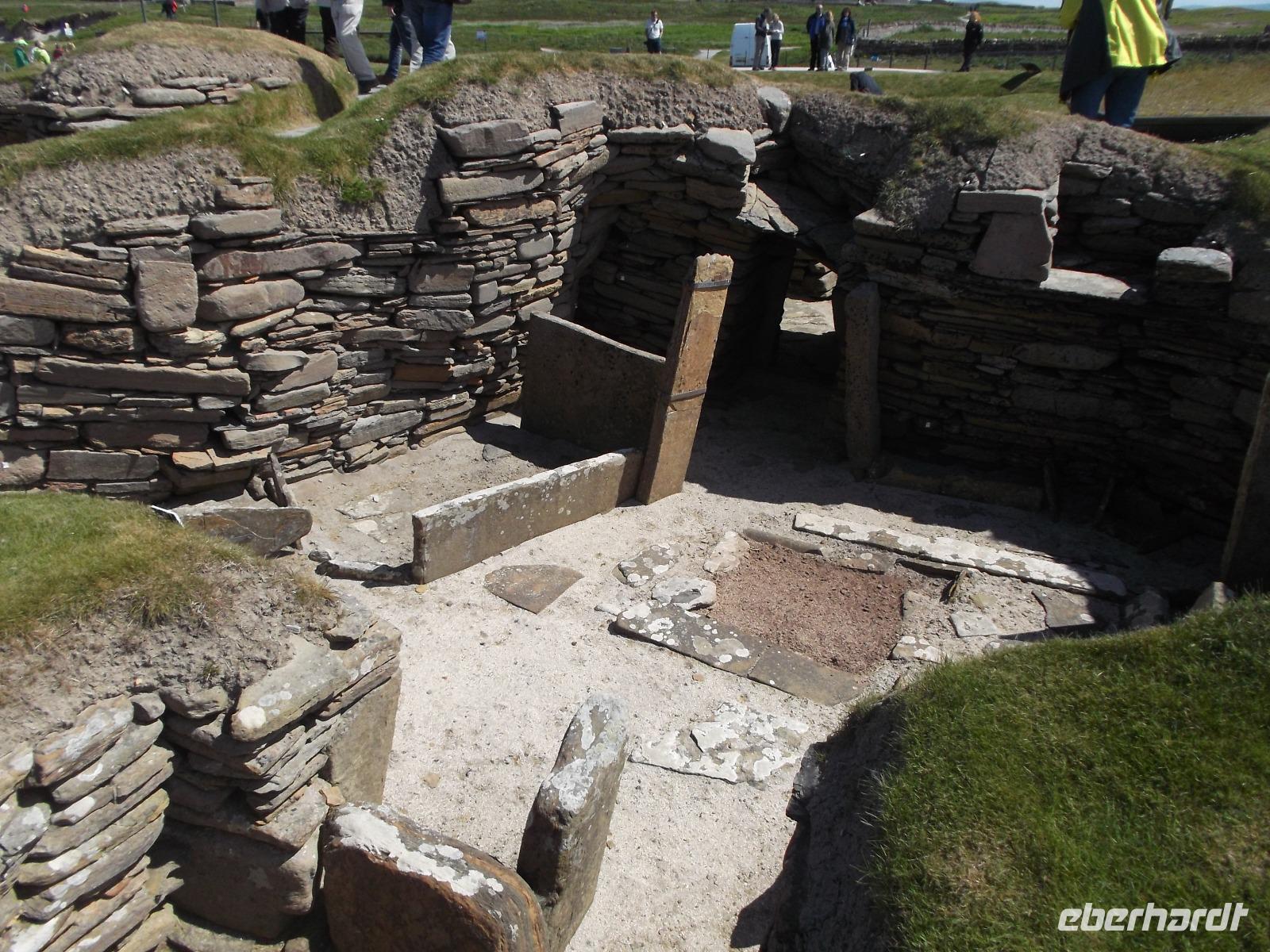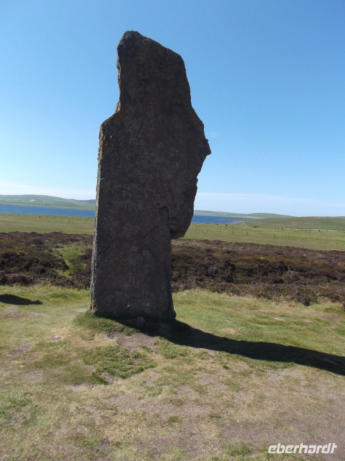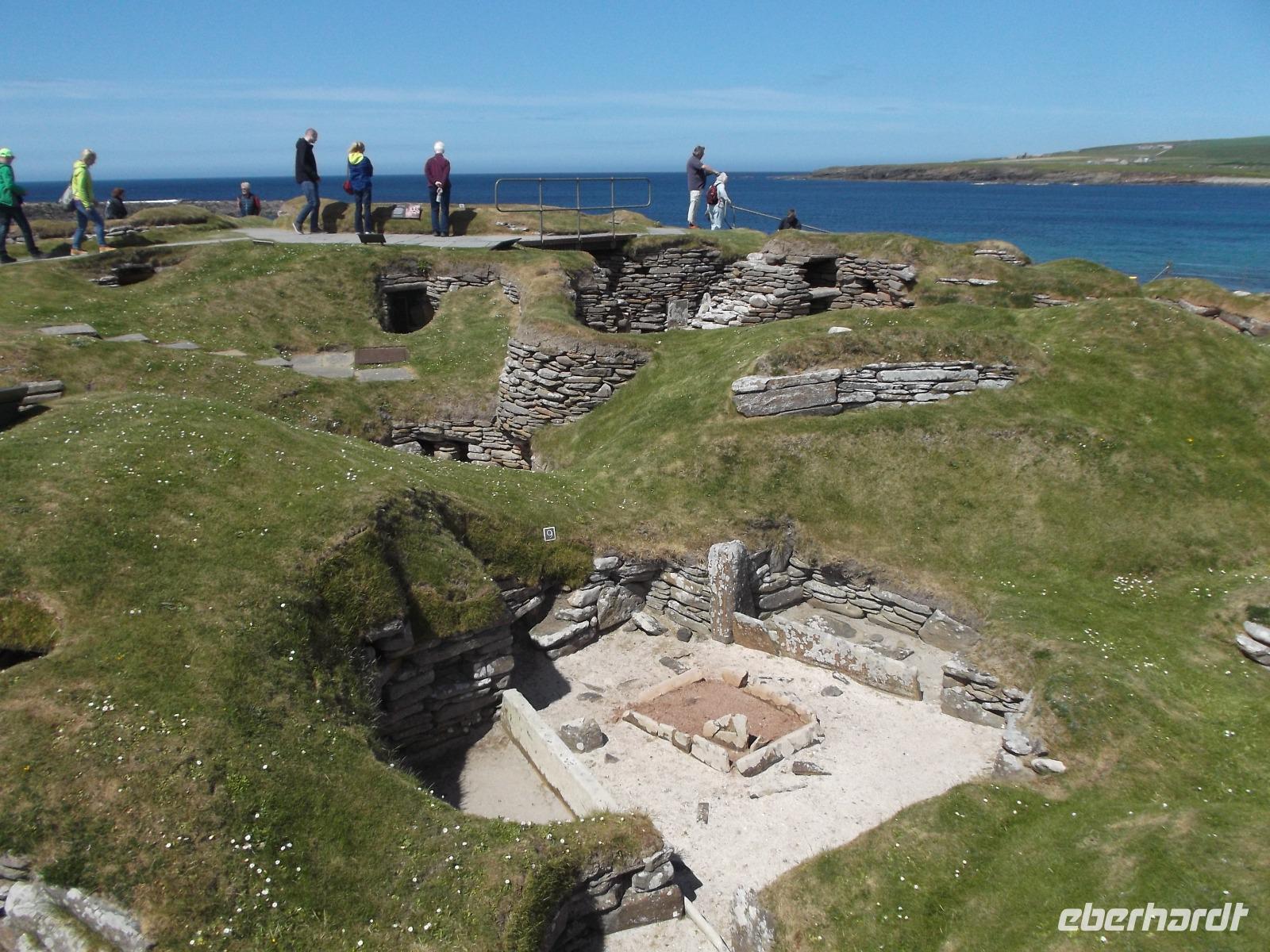 Ein echter Höhepunkt auf den Orkneys, auf denen wir - ungewöhnlich für diese nördliche Inselgruppe - den ganzen Tag strahlenden Sonnenschein hatten - ist die Besichtigung des Steinzeitdorfes Scara Brae. Die Überreste einer der ältesten menschlichen Siedlungen in Europa zeigen in einer gut und anschaulich präsentierten Ausgrabung die Bauten und die Lebensweise der Bewohner vor über fünftausend Jahren - also einer Siedlung, die weit älter ist als die ägyptischen Pyramiden. Nach dem Besuch des Steinzeitdorfes und des benachbarten Herrensitzes „Scull House" fuhren wir weiter zum Steinkreis „Ring of Brodgar", der gerade „restauriert" - also gesichert und befestigt wird. Dieser megalithische Steinkreis ist einer der größten bekannten und gut erhaltenen Steinkreise mit über 100 Metern Durchmesser. Er ist wesentlich größer als der von Callanish, den wir auf Lewis besucht hatten. Auf der Weiterfahrt hielten wir natürlich auch an den „Standing Stones of Stenness". Das war auch einst ein Steinkreis, aber von dessen Bestand sind nur noch vier Megalithen erhalten.