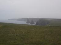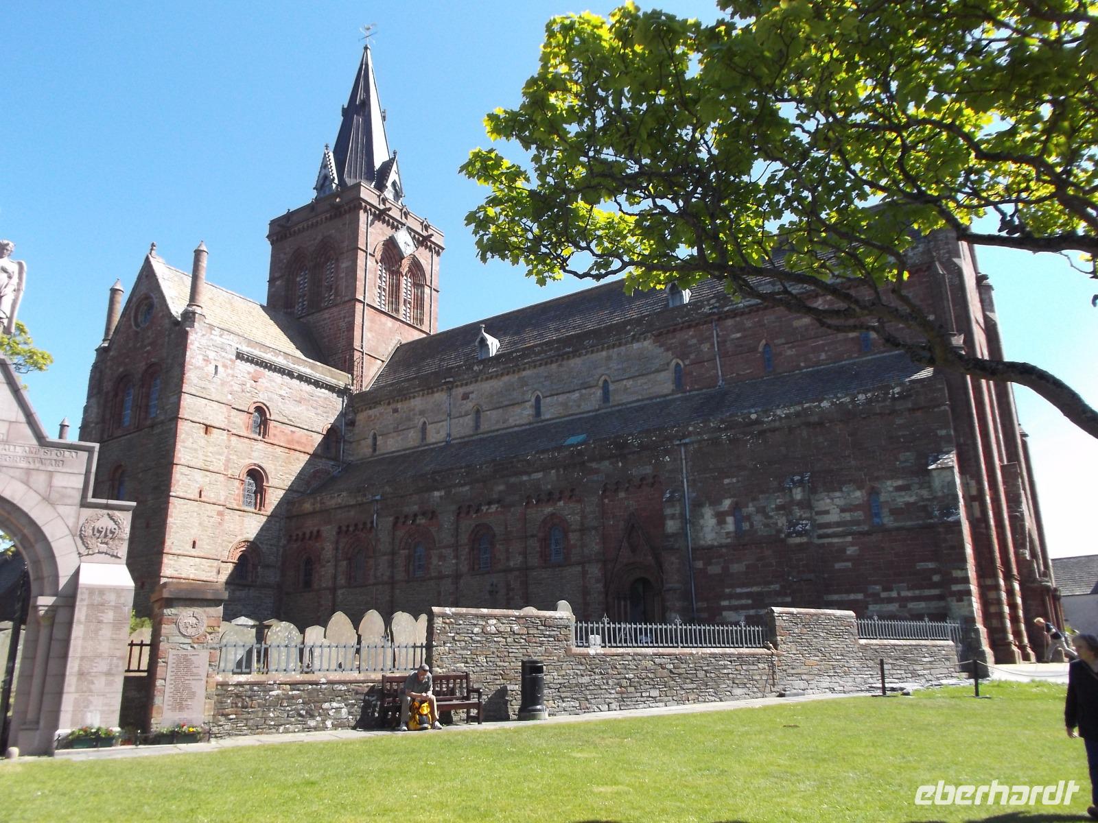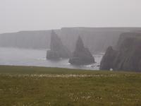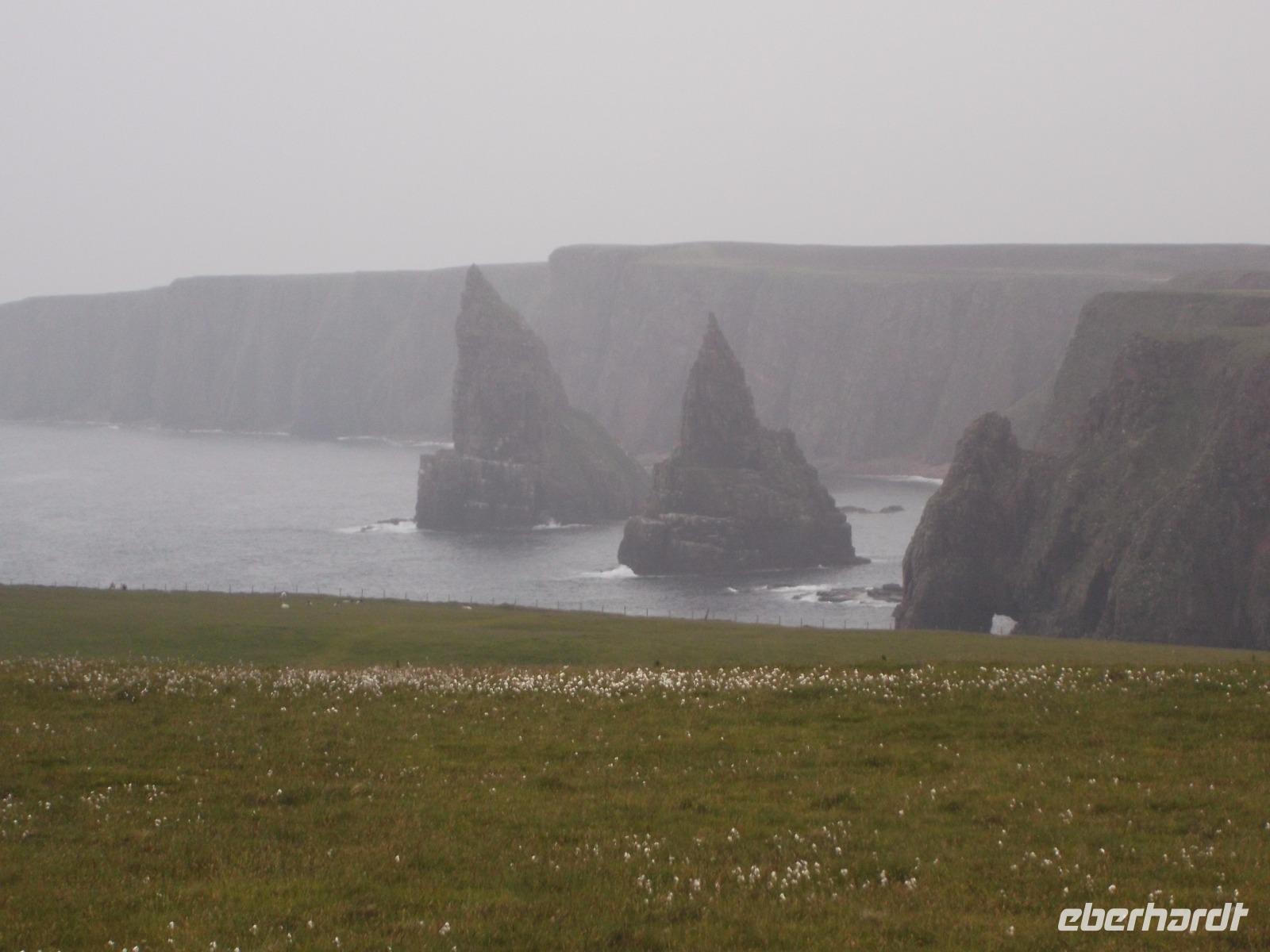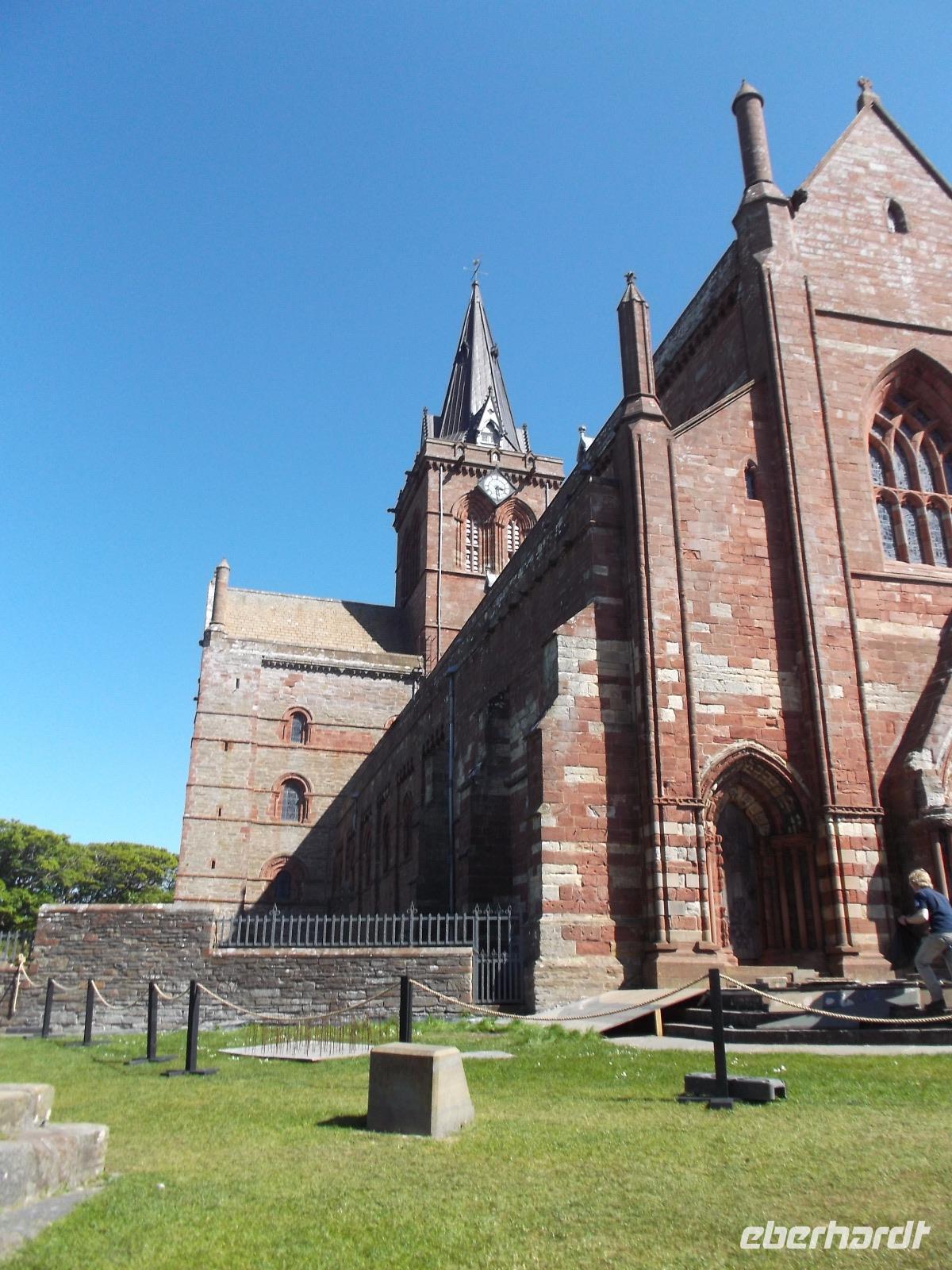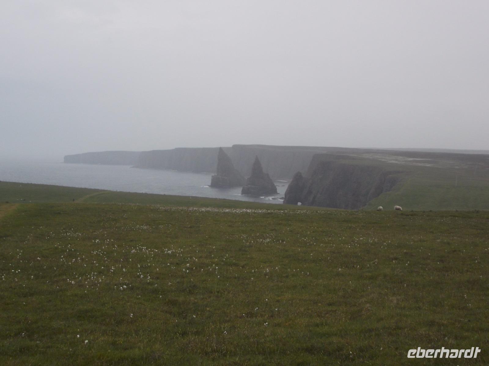Den späteren Aufenthalt in Kirkwall, dem Hauptort der Orkneys, begannen wir mit der Besichtigung der St.Magnus-Kathedrale. Der Kirchenbau, nach Glasgow die zweitgrößte Kathedrale Schottlands, weist unverkennbar norwegischen Einfluss auf, was ja leicht durch die Zugehörigkeit des Archipels zu Norwegen in der Erbauungszeit zu erklären ist. Nach der Kirchenbesichtigung hatten wir etwas Freizeit für einen Bummel im belebten Städtchen Kirkwall. Anschließend brachte uns der Orkney-Bus wieder zurück zum Hafen von Burwick und wir überquerten den Pentland Firth zum „Festland" nach John O'Groats. Hier erwartete uns Buschauffeur Holger und wir gönnten uns als „Richtig Reisen-Extra" noch einen Abstecher zum Leuchtturm von Duncansby Head. Er gehört zu der „Leuchtturmserie", die die Familie Stephenson erbaute - deren bekanntester Spross kein Leuchtrum-Architekt sondern der Autor des Abenteuerromans „Die Schatzinsel" war. Vor diesem Bauwerk fanden wir nicht nur als Fotomotiv die Möwenfelsen, sondern wir konnten auch die unweit von hier gelegene seltsame Felsenformation der „Duncansby Stacks" fotografieren, die manchmal als „zu Stein erstarrte Segel" bezeichnet werden.