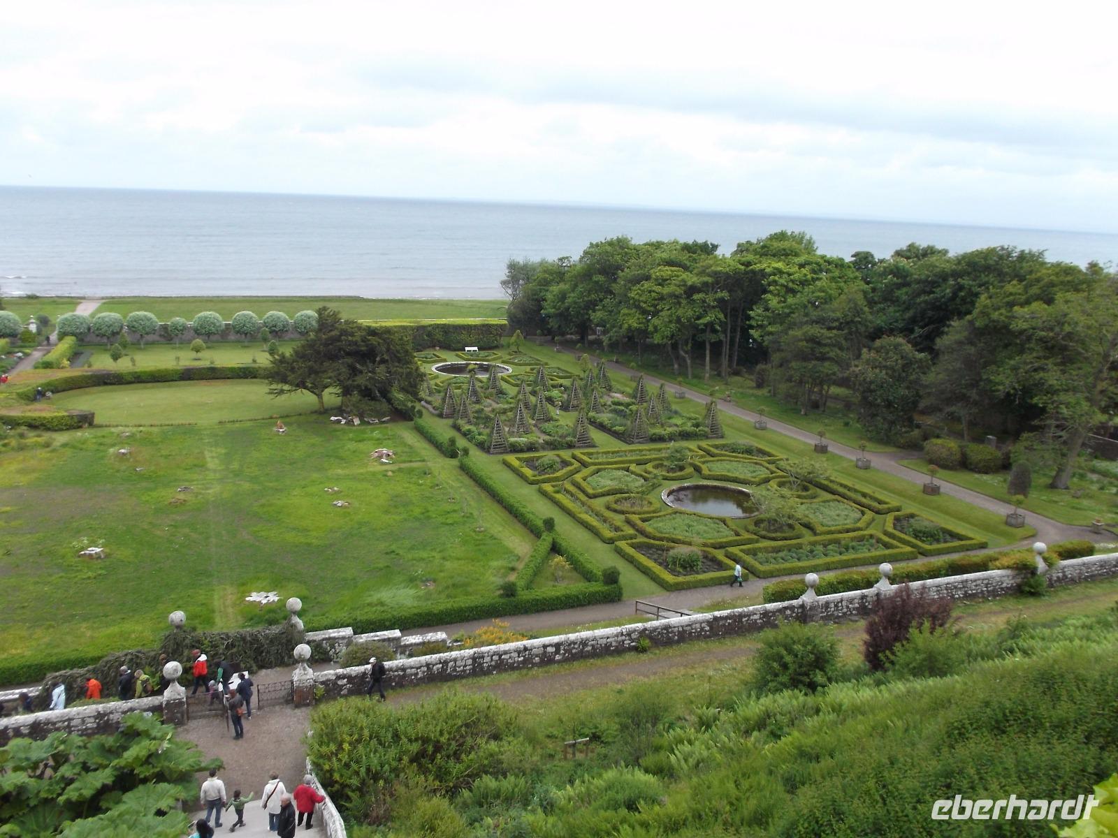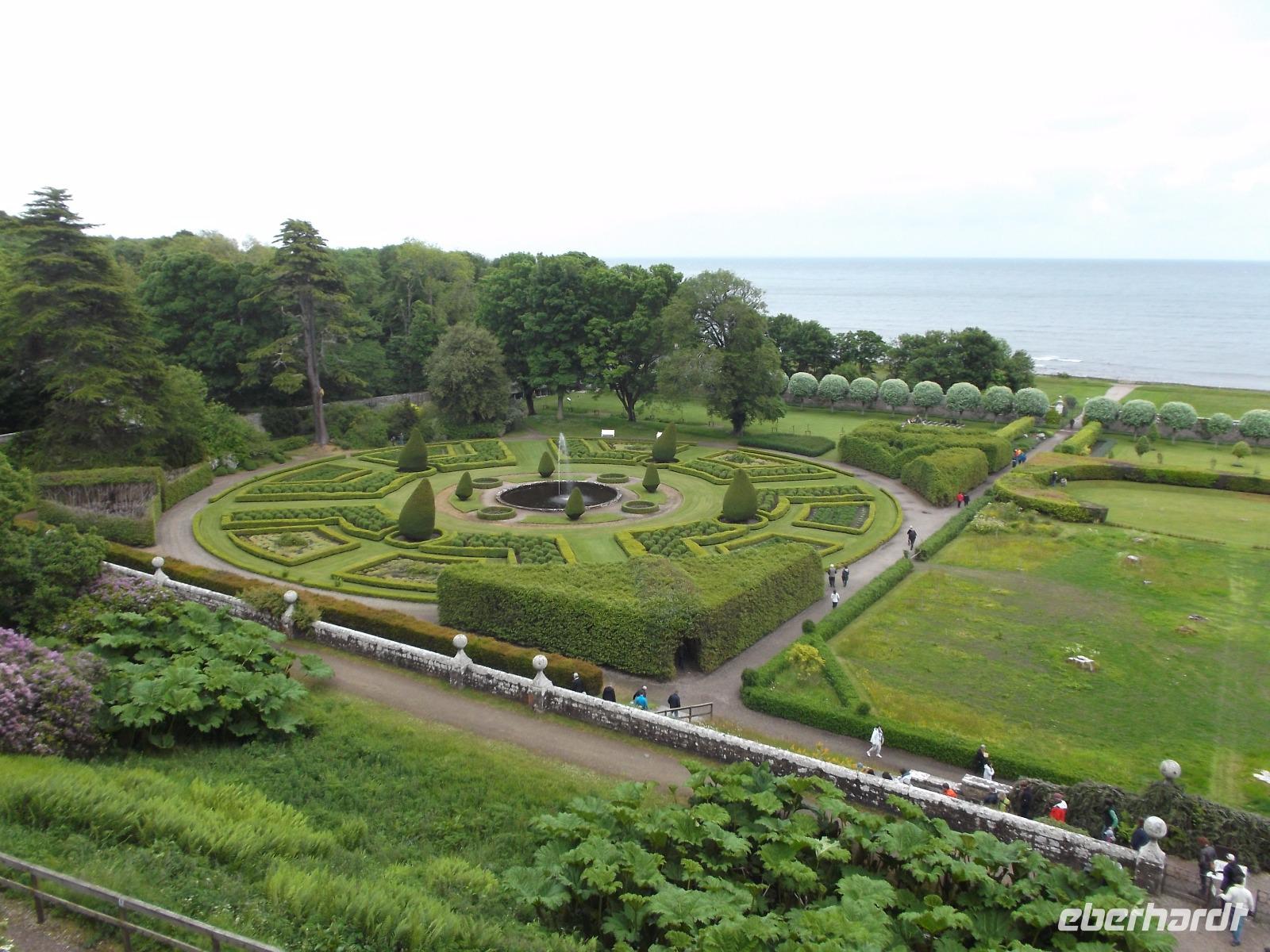 Die „Ostküstenmagistrale" führte in Richtung Süden immer an der Küste entlang. Rechtzeitig erreichten wir den Ort unserer ersten Besichtigung, Dunrobin Castle. Rechtzeitig deshalb, da zweimal am Tag in der grandiosen Gartenanlage des Schlosses Falknereivorführungen die Besucher anlocken. Nach den Flugvorführungen der Raubvögel konnten wir dann das Castle besuchen, das bis heute Sitz der Familie des Duke of Sutherland ist. Mitte des 19. Jahrhunderts erhielt das Wohnschloss seine heutige Gestalt und wurde mit seinen 189 Zimmern das größte Wohngebäude in den nördlichen Highlands. Die zu besichtigenden Zimmer sind prunkvoll eingerichtet, besonders sehenswert ist auch der zum Schloss gehörende malerisch-romantische und überaus gepflegte Garten, der teilweise den Anlagen des Schlosses in Versailles nachempfunden ist. Angelegt wurden Palast und Garten durch den bekannten Architekten Charles Barry, der auch den Londoner Westminsterpalast - besser bekannt als britisches Parlamentsgebäude - gestaltete.