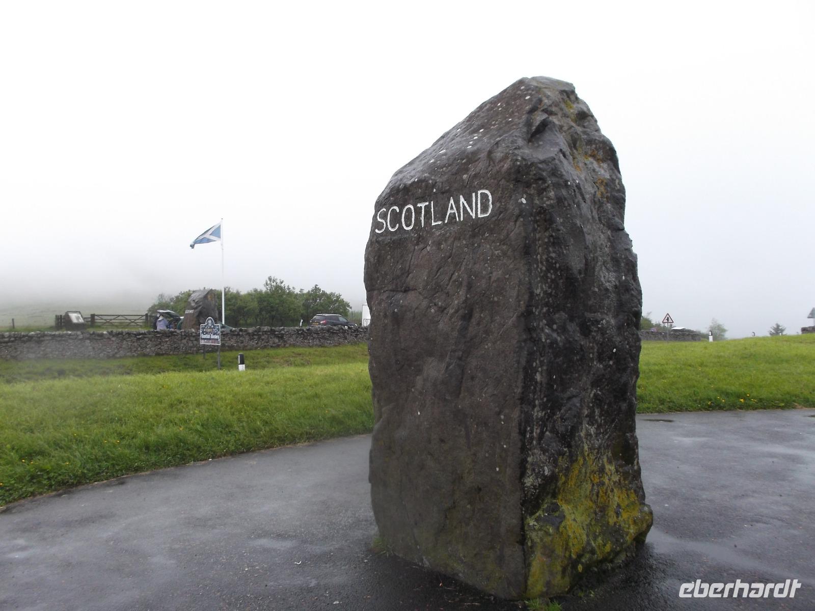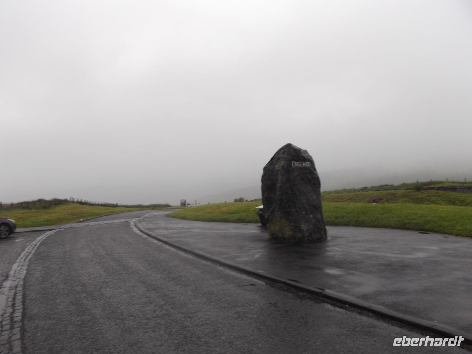 Dann hieß es Abschied nehmen von Schottland. Ein letztes Mal hielten wir an der „Carter Bar" genannten Grenzstelle, wo ein großer beschrifteter Grenzstein den Verlauf der Trennlinie der beiden Länder markiert.