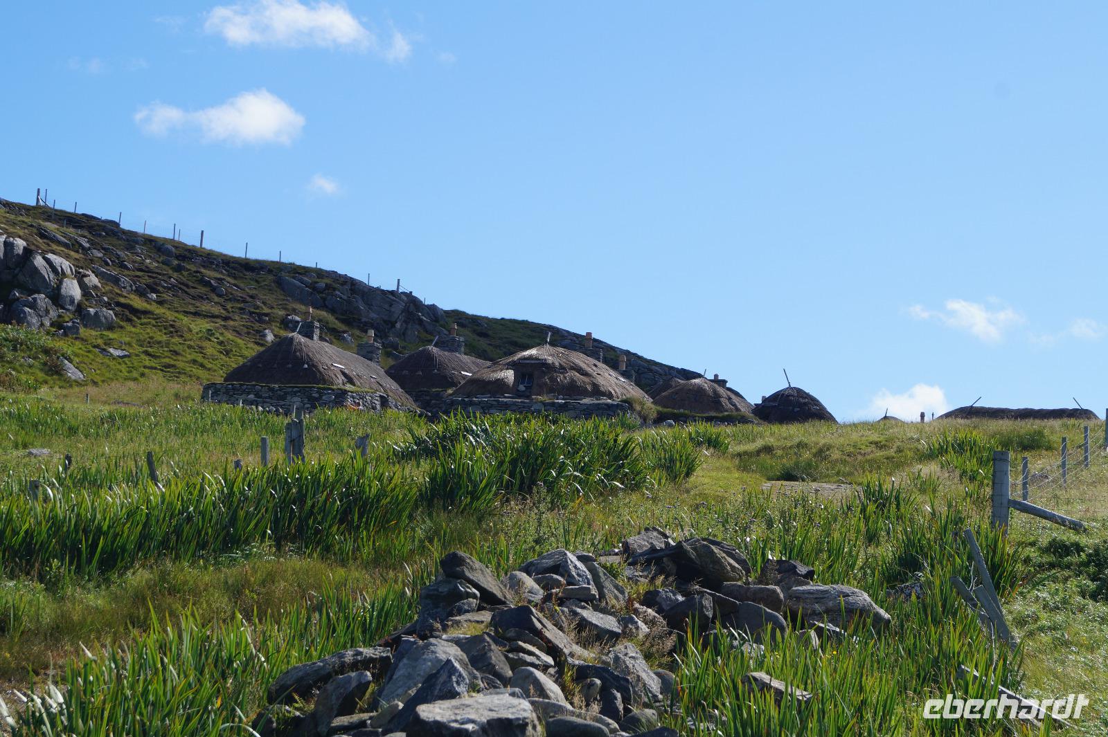 Unser erstes Ziel waren die Gearrannan Blackhouses an der Westküste von Lewis, ein privat geführtes Museum mit einem Zugang zu einer schmalen Bucht, die einge von uns anzog. Zuvor zeigte uns ein Museumsmitarbeiter die Bedienung seines fast hundertjährigen Webstuhls, mit dem er Harris-Tweet herstellte. Dieser war außer Mode geraten, bis die Sportwarenkette Nike den Harris-Tweet wiederentdeckte und eine entsprechende Applikation für eine ihrer Schuhserien bei einem Weber der Insel bestellte. Der kam der schieren Menge des bestellten Stoffs kaum hinterher und so kam es, dass für einige Zeit die alten mechanischen Webstühle vom Beginn des 20. Jahrhunderts wieder in Betrieb genommen wurden. Der Harris-Tweet wird fast ausschließlich in Heimarbeit hergestellt. Bis auf die Schafschur muss dabei jeder Schritt im Verarbeitungsprozess auf der Doppelinsel vollzogen werden.