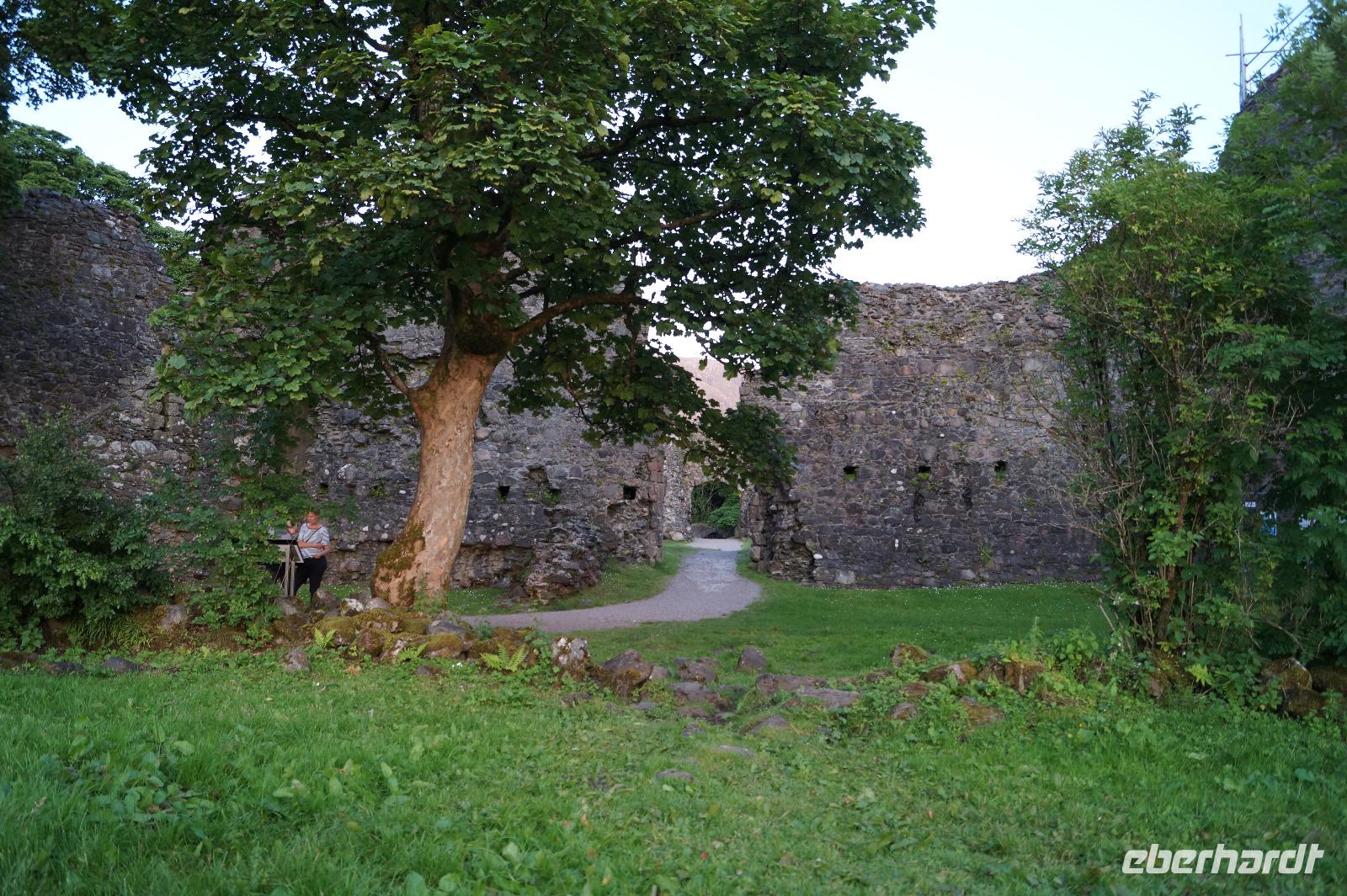 Um später das Abendessen zu verdauen, begaben einige von uns sich auf einen gemeinsamen Spaziergang zur Burg an der Mündung des River Lochy: Inverlochy Castle. Die in Schottland so häufig vorkommende Vorsilbe Inver- (gäl. Inbhir) bedeutet nichts anderes als 'Mündung'. Mit der unvorhergesehen Umrundung von Loch Eil schafften wir an diesem Tag 300 km.