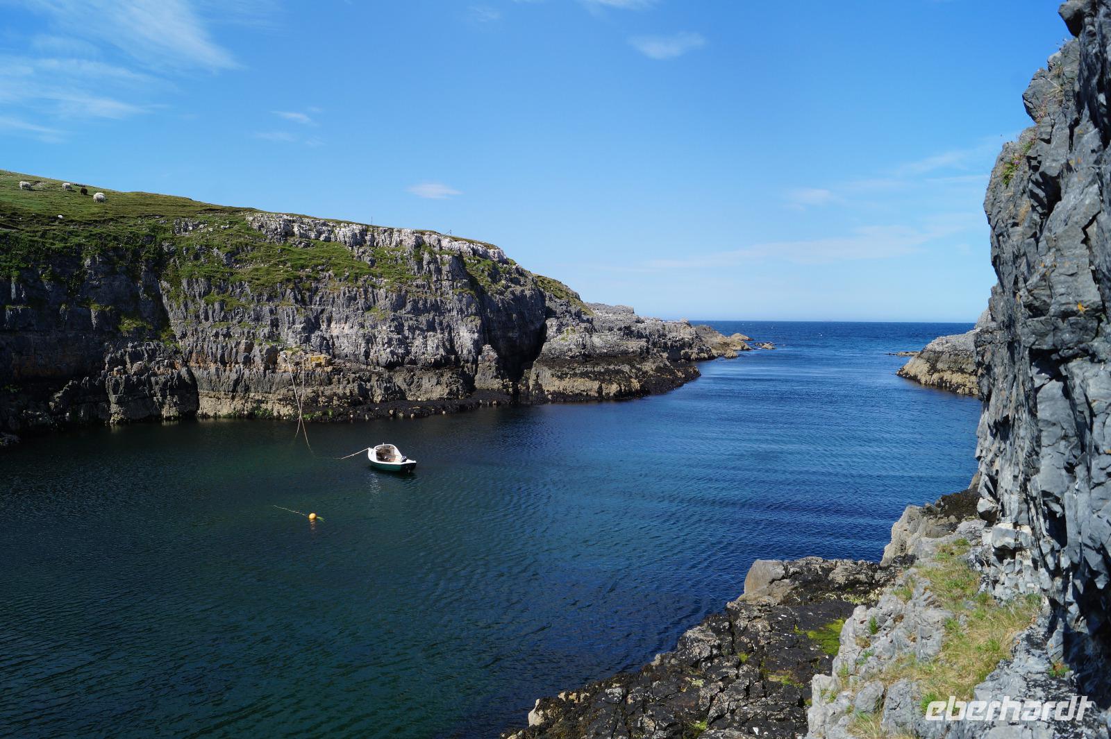 Durch Durness durch kamen wir schließlich zur Smoo Cave, einem Ort, der seit Menschengedenken genutzt wird: Von mittelsteinzeitlichen Muschelsammlern über Wikinger bis hin zu einer illegalen Whiskybrennerei haben sich hier Menschen betätigt. Die Höhle selbst entstand einerseits durch die Wirkung der Meeresbrandung als auch durch einen Bach entlang einer Schwächelinie zwischen zwei verschiedenen aneinanderstoßenden Kalksteinen. Zeitweilig diente die Höhle auch einem Raubmörder der seine Opfer durch ein Loch stieß, als Instrument seiner Bluttaten.