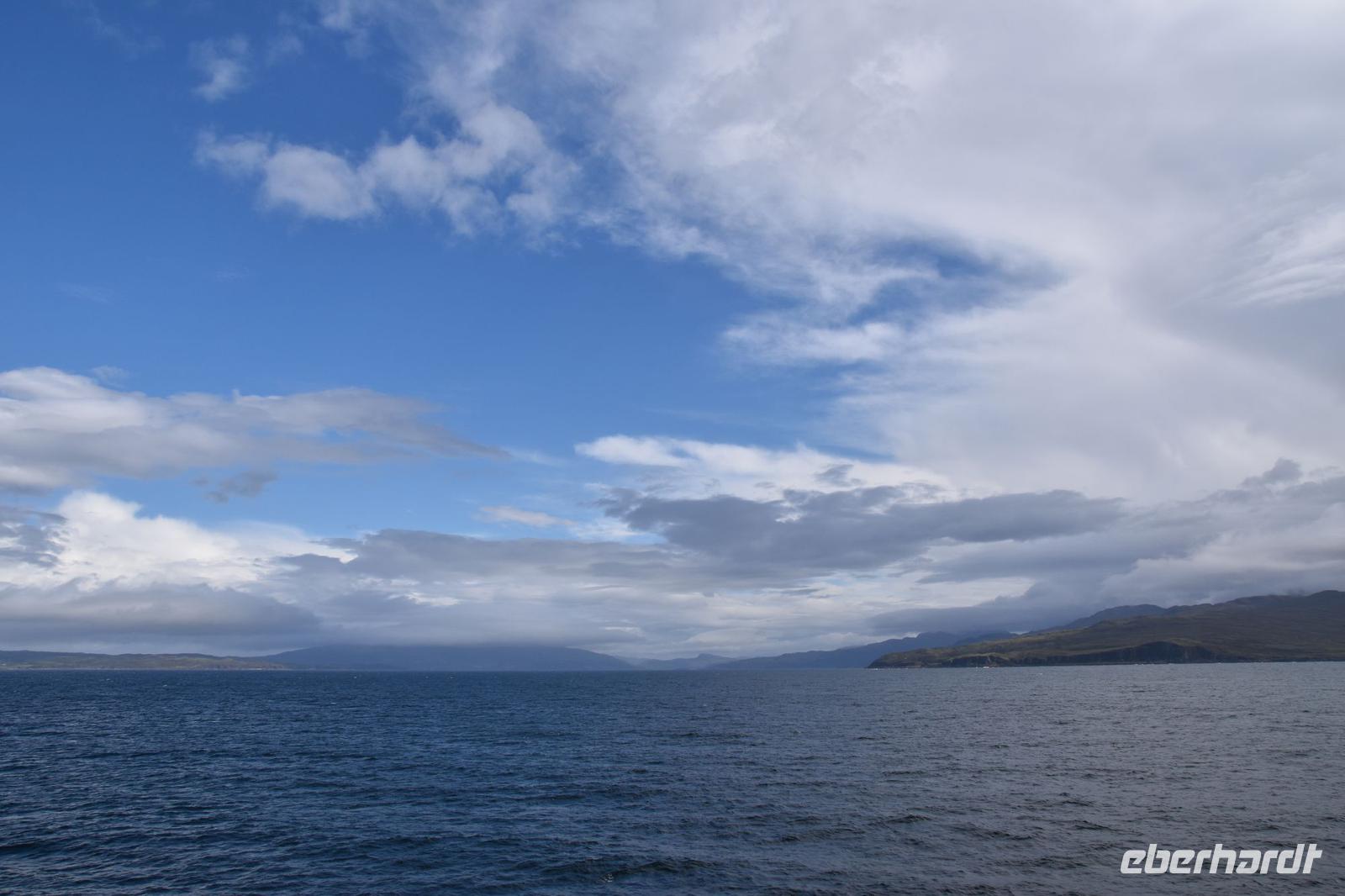 Beim Frühstück und dem schönen Wetter haben wir schon einen tollen Blick auf die Skyebridge und die Cullin Hills dahinter.
