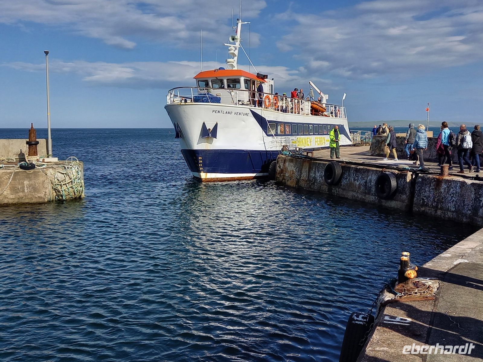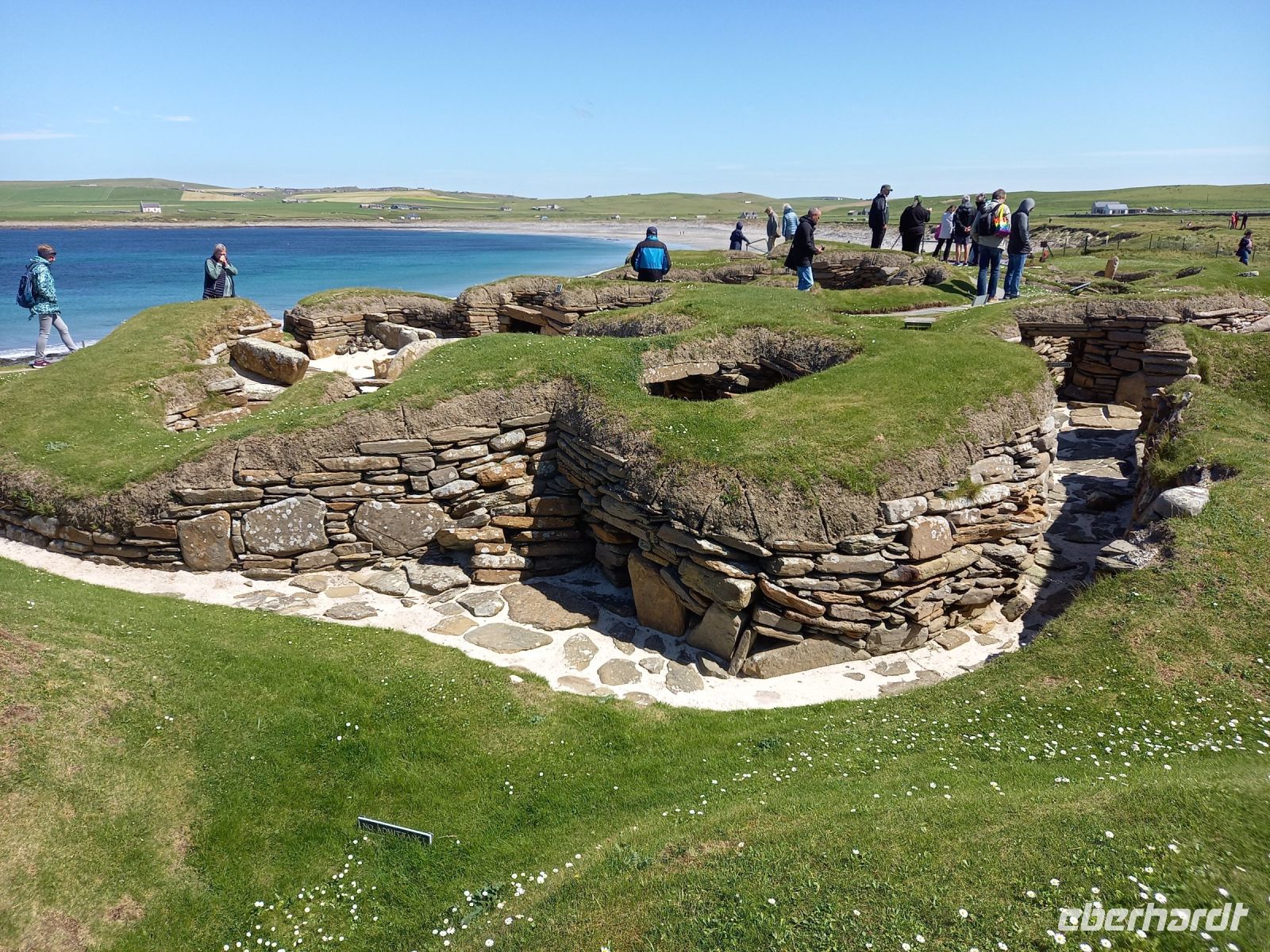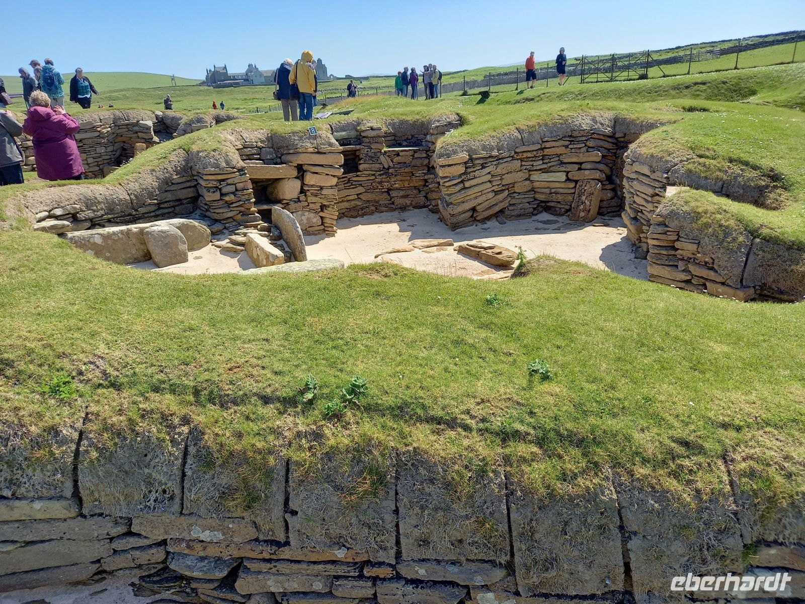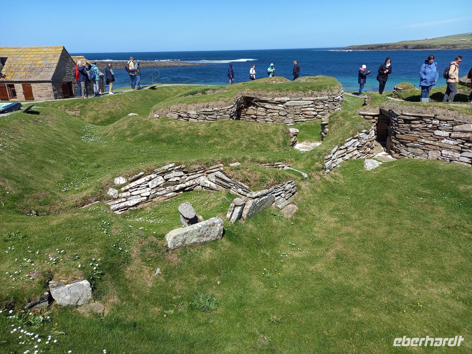 Unser Bus holte uns frühmorgens aus unseren Hotels ab und wir fuhren zum winzigen Fährhafen von John O’Groats, das als nordöstlichster Ort der britischen Hauptinsel gilt. Mit einer kleinen Passagierfähre fuhren wir von hier zu den nördlich gelegenen Orkney-Inseln. In der Geschichte dieses Archipels, der aus insgesamt etwa 70 Eilanden und der Hauptinsel Mainland besteht, ist mehr skandinavischer als schottischer Einfluss zu erkennen. Wir landesten im Hafen von Burwick auf der Insel South Ronaldsay, wo im Hafen schon ein einheimischer Bus auf uns wartete. Wir umrundeten die berühmte Bucht von Scapa Flow, früher ein viel genutzter Flottenstützpunkt. In beiden Weltkriegen war er nicht nur Stationierungsort der britischen Home Fleet, sondern im ersten Weltkrieg wurde er Schauplatz der spektakulären Selbstversenkung der hier internierten deutschen Kriegsflotte. Nachdem im zweiten Weltkrieg ein unerwarteter und erfolgreicher Angriff eines deutschen U-hier das britische Flaggschiff versenkt hatte, ließ der damalige britische Premierminister Winston Churchill die sofortige Sperrung fast aller Zufahrten nach Scapa Flow anordnen. Man versenkte alte Frachtschiffe als U-Boot-Sperre, später errichteten italienische Kriegsgefangene hier die Stein- und Betondämme. Diese sogenannte „Churchill Barriere“ verbindet heute mehrere der kleinen Inseln mit der Hauptinsel Mainland und auf ihnen führt auch die Hauptstraße entlang. Unsere erste Besichtigung galt dann der „italienischen Kapelle“, die von Kriegsgefangenen im zweiten Weltkrieg hier während ihrer Internierung aus einer Wellblechbaracke errichtet wurde. Ein Maler unter den Gefangenen sorgte dafür, dass ein kunsthistorisch wertvolles und imposantes katholisches Kirchlein entstand. Als echten Höhepunkt auf den Orkneys, empfanden wir dann die Besichtigung des Steinzeitdorfes Scara Brae bei schönem, aber sehr windigem Wetter. Hier sieht man die Überreste einer der ältesten menschlichen Siedlungen in Europa. In einer gut und anschaulich präsentierten Ausgrabung kann man sich die Bauten anschauen und versuchen, sich in die Lebensweise der Bewohner vor über fünftausend Jahren hineinzuversetzen. Wir sahen also eine Siedlung, die weit älter war als die natürlich wesentlich bekannteren ägyptischen Pyramiden. Nach dem Besuch des Steinzeitdorfes fuhren wir zur Mittagspause in den Hafen von Stromness, der zweitgrößten Siedlung auf den Orkneys.