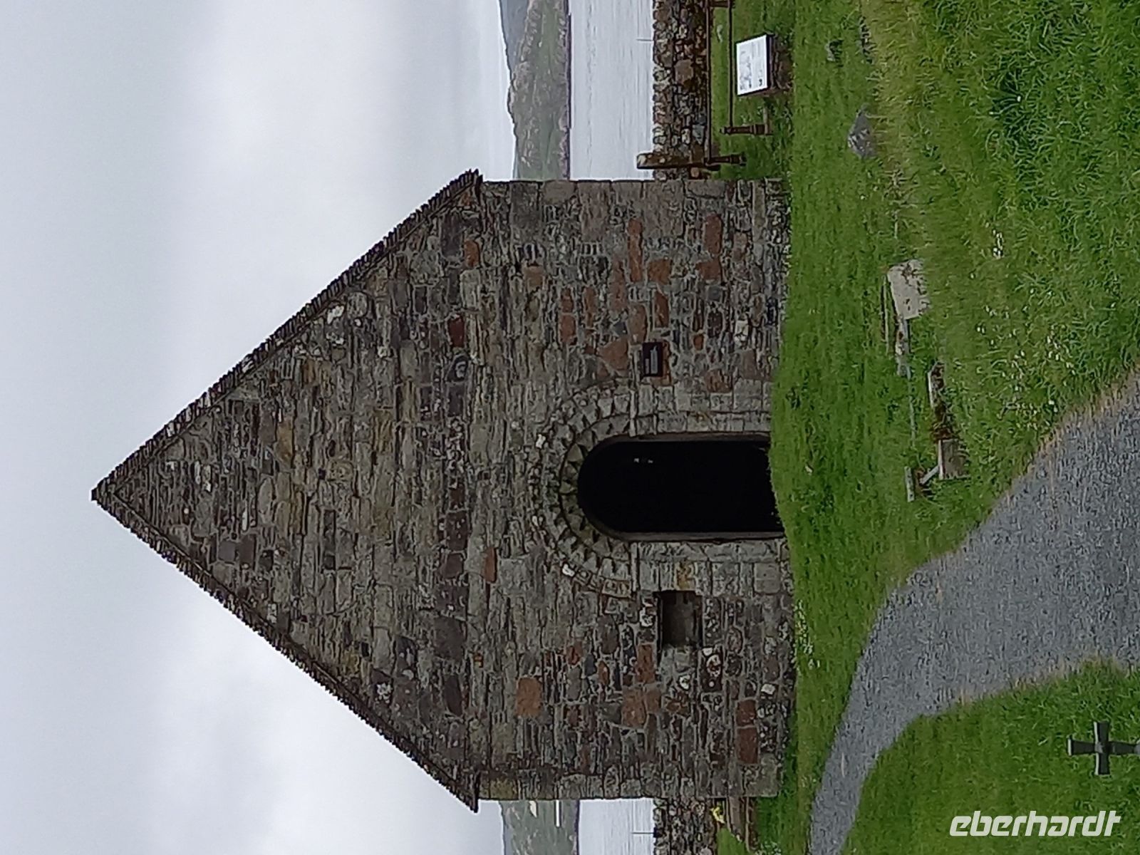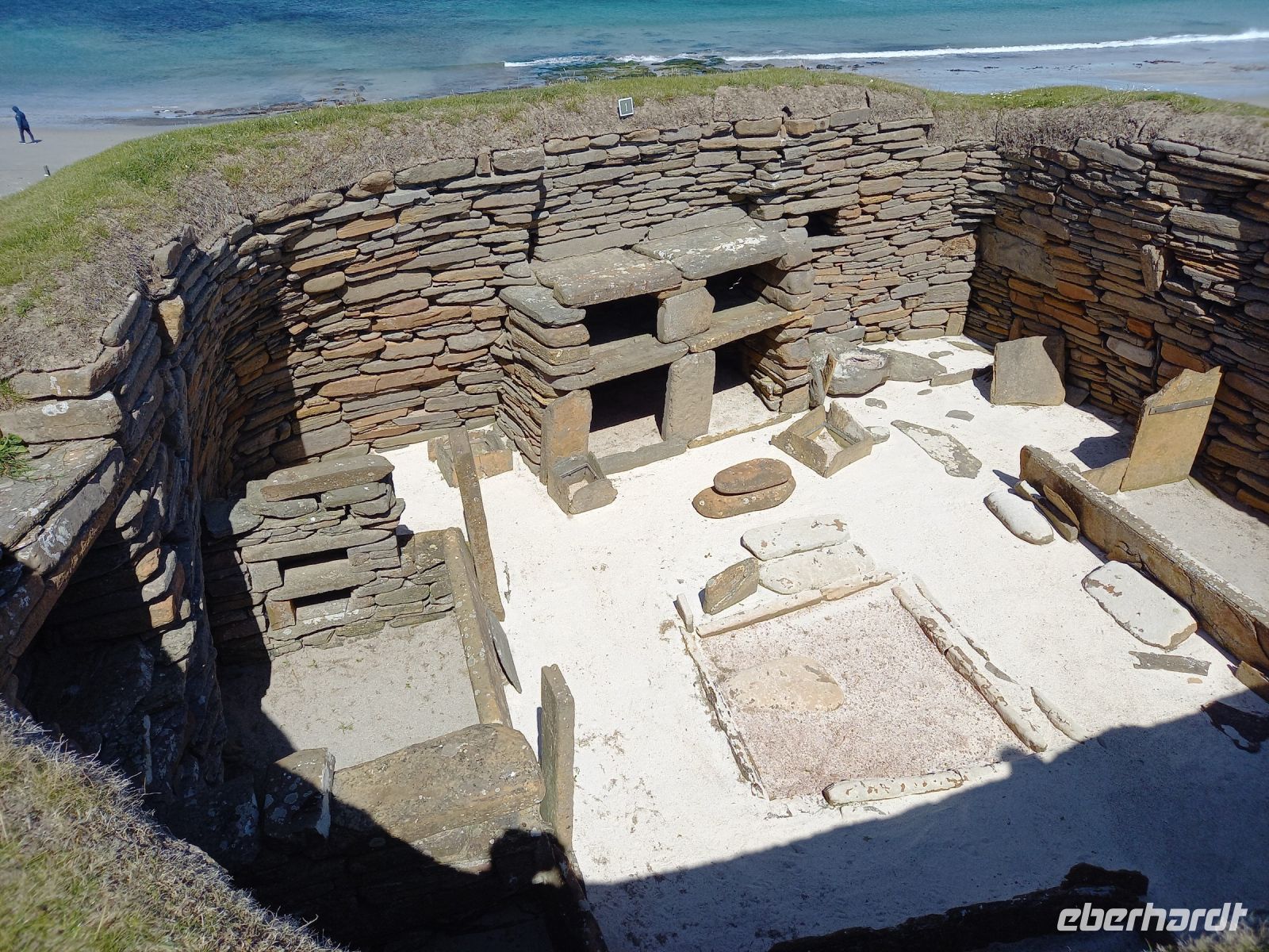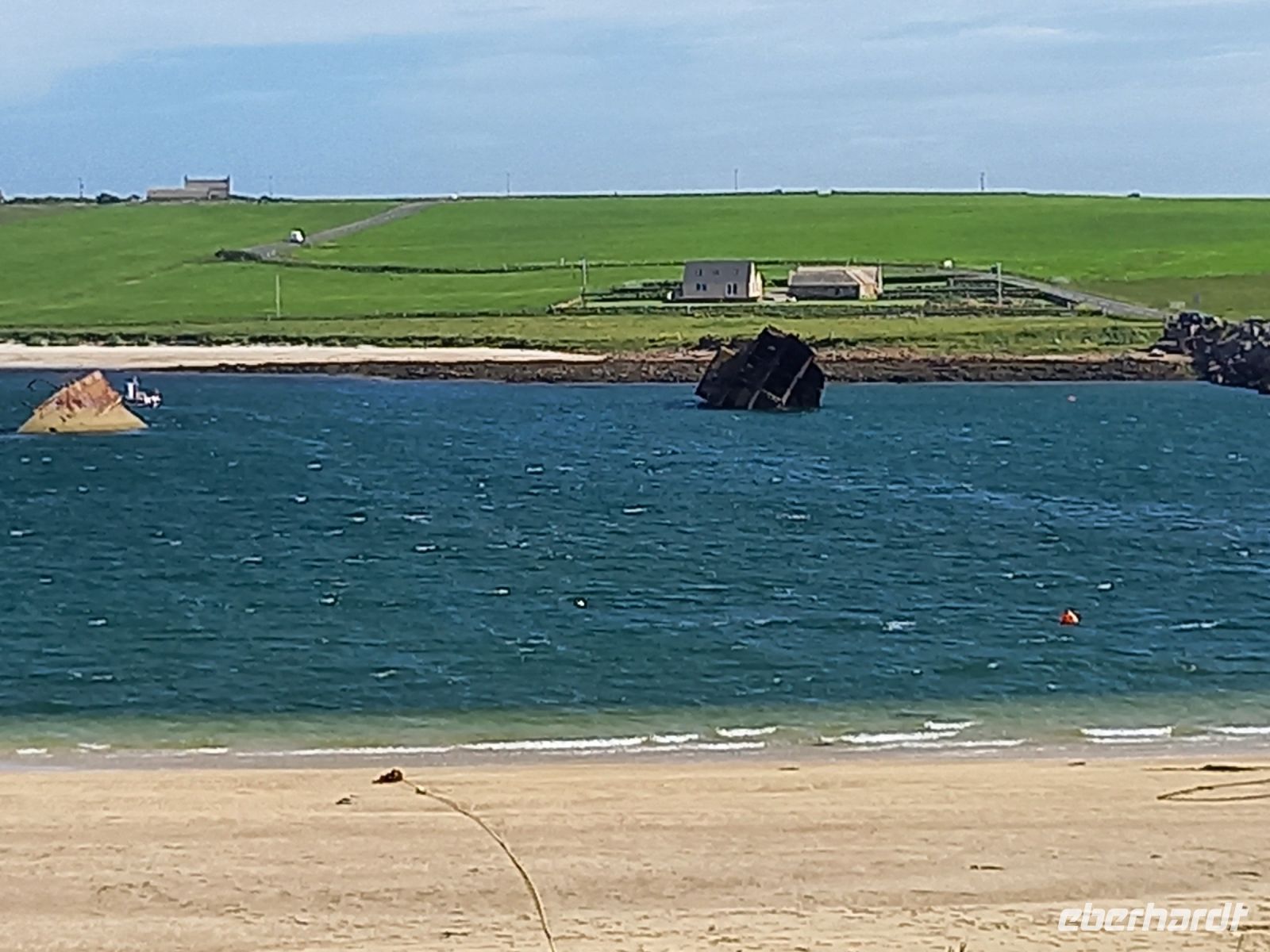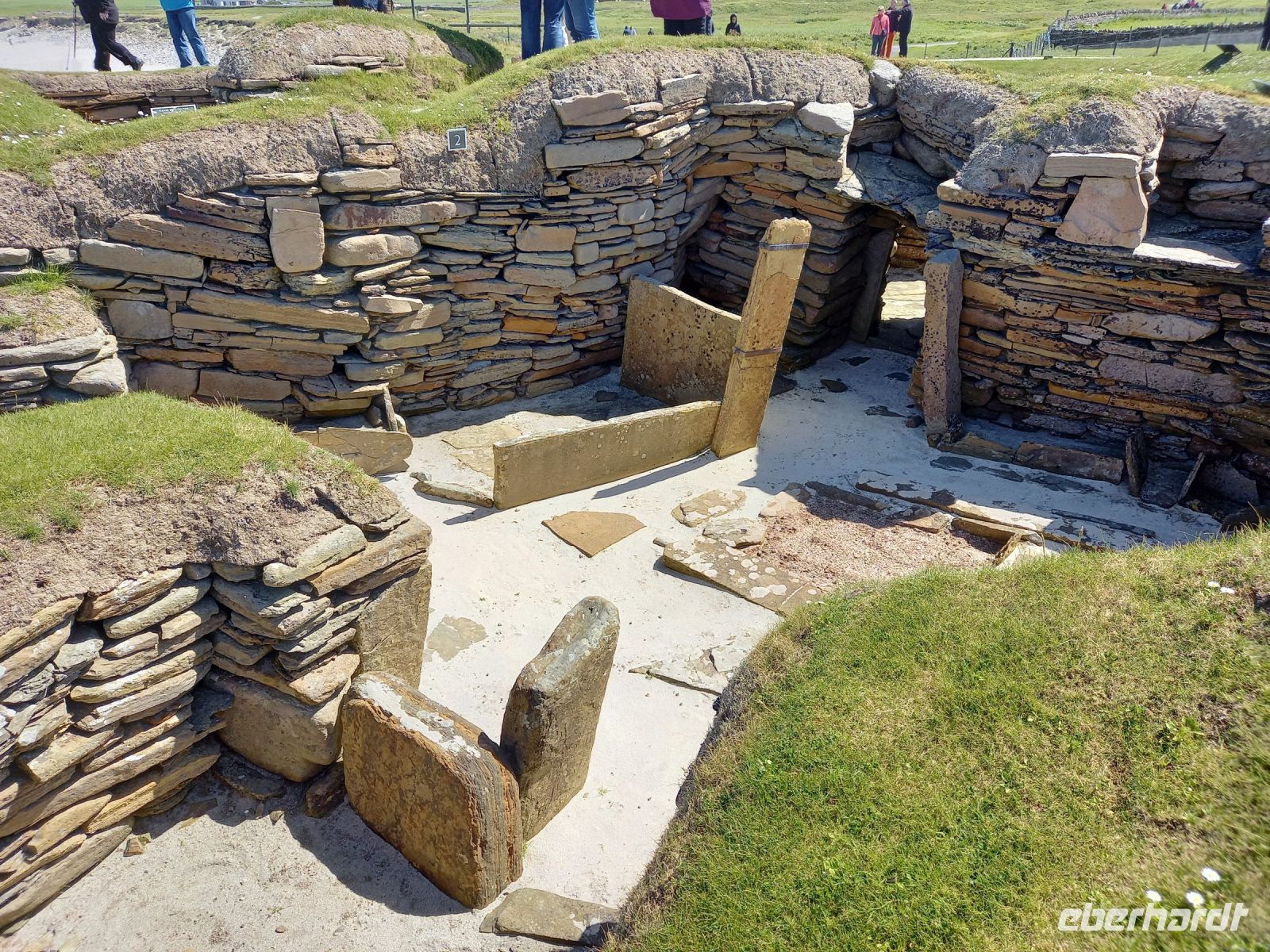 Unser Bus holte uns frühmorgens aus unseren Hotels ab und wir fuhren zum winzigen Fährhafen von John O’Groats, das als nordöstlichster Ort der britischen Hauptinsel gilt. Mit einer kleinen Passagierfähre fuhren wir von hier zu den nördlich gelegenen Orkney-Inseln. In der Geschichte dieses Archipels, der aus insgesamt etwa 70 Eilanden und der Hauptinsel Mainland besteht, ist mehr skandinavischer als schottischer Einfluss zu erkennen. Wir landesten im Hafen von Burwick auf der Insel South Ronaldsay, wo im Hafen schon ein einheimischer Bus auf uns wartete. Wir umrundeten die berühmte Bucht von Scapa Flow, früher ein viel genutzter Flottenstützpunkt. In beiden Weltkriegen war er nicht nur Stationierungsort der britischen Home Fleet, sondern im ersten Weltkrieg wurde er Schauplatz der spektakulären Selbstversenkung der hier internierten deutschen Kriegsflotte. Nachdem im zweiten Weltkrieg ein unerwarteter und erfolgreicher Angriff eines deutschen U-hier das britische Flaggschiff versenkt hatte, ließ der damalige britische Premierminister Winston Churchill die sofortige Sperrung fast aller Zufahrten nach Scapa Flow anordnen. Man versenkte alte Frachtschiffe als U-Boot-Sperre, später errichteten italienische Kriegsgefangene hier die Stein- und Betondämme. Diese sogenannte „Churchill Barriere“ verbindet heute mehrere der kleinen Inseln mit der Hauptinsel Mainland und auf ihnen führt auch die Hauptstraße entlang. Unsere erste Besichtigung galt dann der „italienischen Kapelle“, die von Kriegsgefangenen im zweiten Weltkrieg hier während ihrer Internierung aus einer Wellblechbaracke errichtet wurde. Ein Maler unter den Gefangenen sorgte dafür, dass ein kunsthistorisch wertvolles und imposantes katholisches Kirchlein entstand. Als echten Höhepunkt auf den Orkneys, empfanden wir dann die Besichtigung des Steinzeitdorfes Scara Brae bei schönem, aber sehr windigem Wetter. Hier sieht man die Überreste einer der ältesten menschlichen Siedlungen in Europa. In einer gut und anschaulich präsentierten Ausgrabung kann man sich die Bauten anschauen und versuchen, sich in die Lebensweise der Bewohner vor über fünftausend Jahren hineinzuversetzen. Wir sahen also eine Siedlung, die weit älter war als die natürlich wesentlich bekannteren ägyptischen Pyramiden. Nach dem Besuch des Steinzeitdorfes fuhren wir zur Mittagspause in den Hafen von Stromness, der zweitgrößten Siedlung auf den Orkneys.