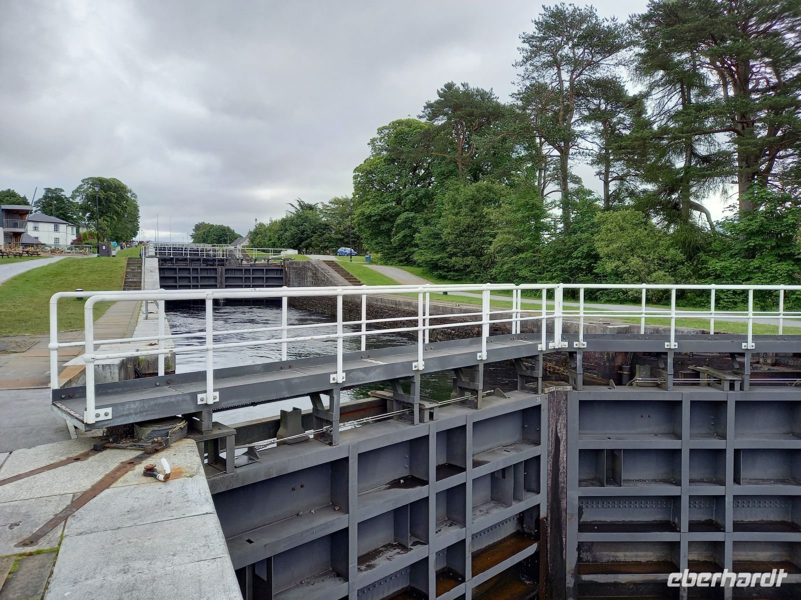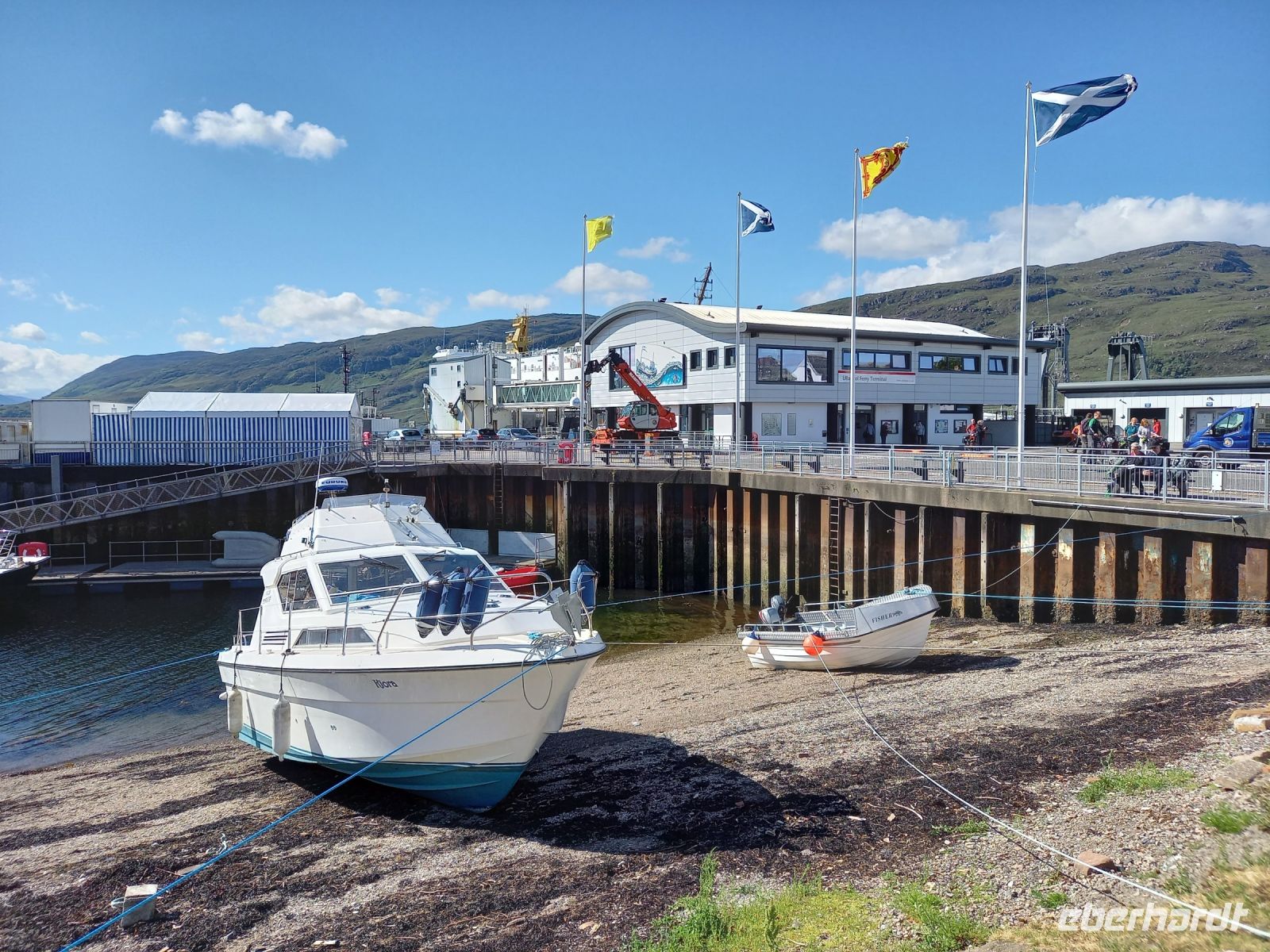 Eine besondere Küstenstraße, „Road of the Isles“ genannt, führt von Fort William an mehreren Seen und schließlich am Atlantik entlang in das Fischerstädtchen Mallaig. Heute morgen war das unser erstes Ziel, wobei wir gleich zu Anfang der Straße zu einem Fotostopp an der „Neptunes staircase“ genannten Schleusentreppe des Kaledonischen Kanals abbogen. Eine Abfolge von acht Schleusen überwindet hier, Am Ende des Kanals, der bei Inverness beginnt, einen beachtlichen Höheunterschied. Schon im 19. Jahrhundert errichtet, verbindet der Kanal quer durch den „Great Glen“ genannten Grabenbruch im Westen Schottlands die Nordsee mit dem Atlantischen Ozean.