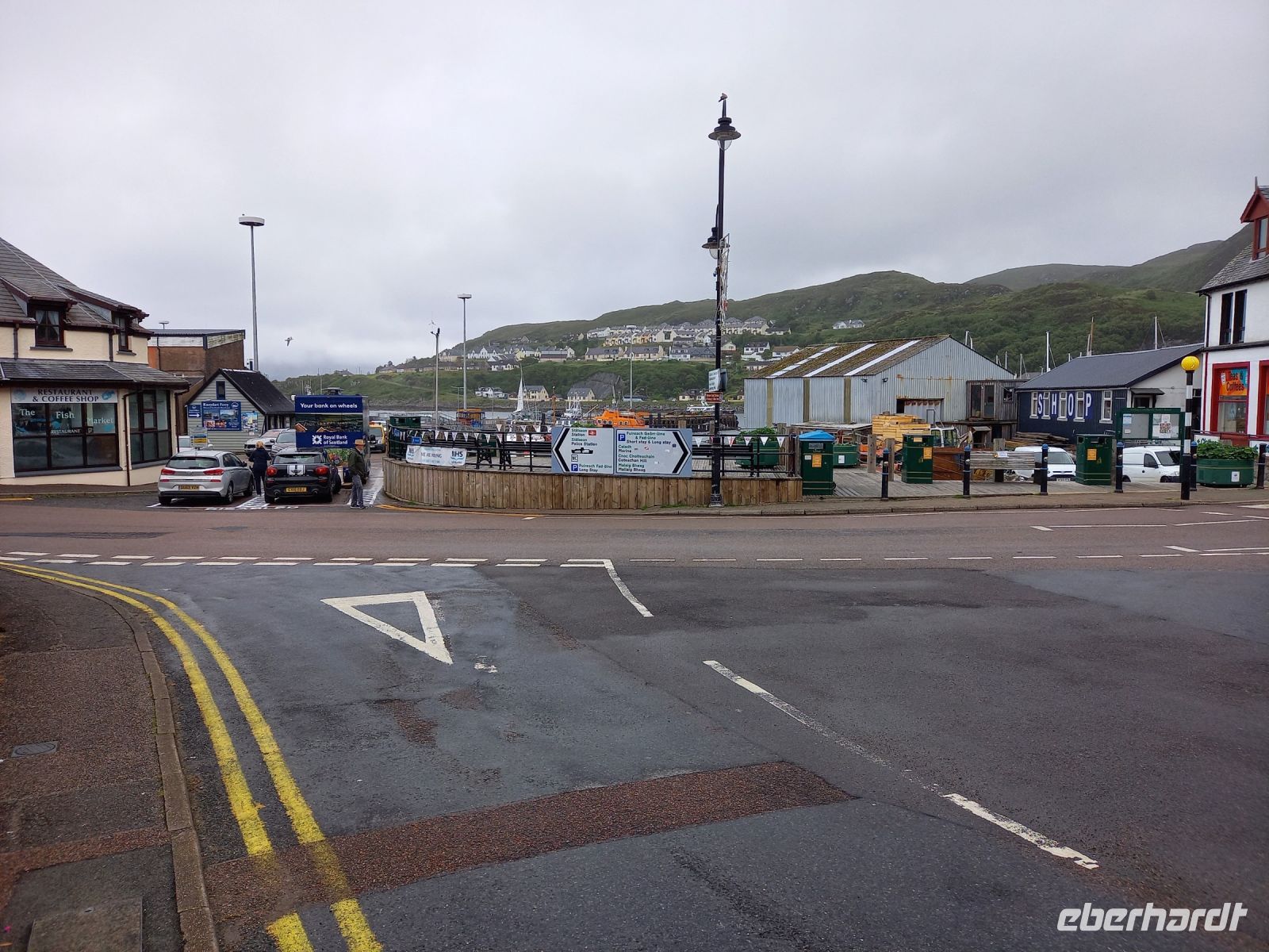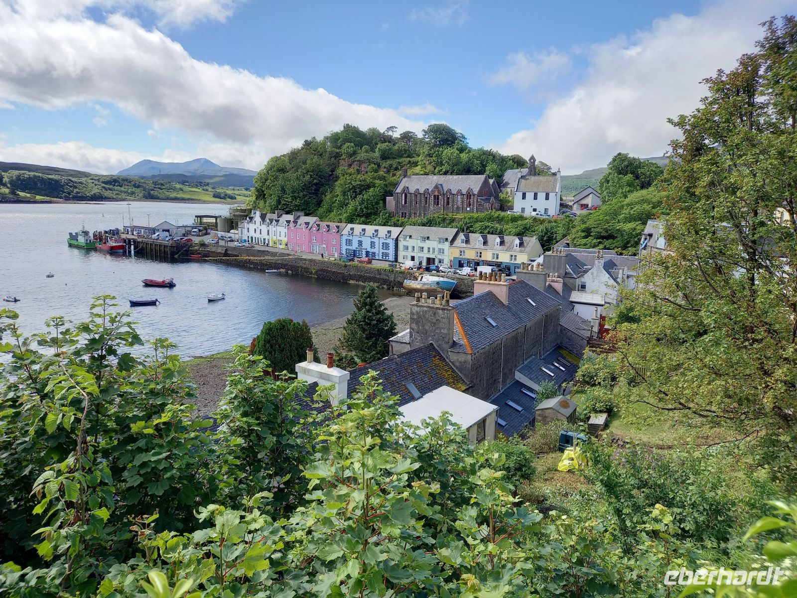 Von unserem Übernachtungsort ging es heute Morgen nach einem Fotostopp am Ainort-Wasserfall in die Inselhauptstadt Portree. Die kleine Hafenstadt mit ihrem Marktplatz, vor allem aber ihren buntbemalten Häusern rund um die Hafenbucht ist ein oft und gern gezeigtes Fotomotiv. In unserer „freien Zeit“ konnten wir das Städtchen ganz gut kennenlernen. Neben seinem Markt mit dem kleinen historischen Marktkreuz gehört vor allem der Aussichtspunkt über den Hafen zu den Attraktionen des Ortes .