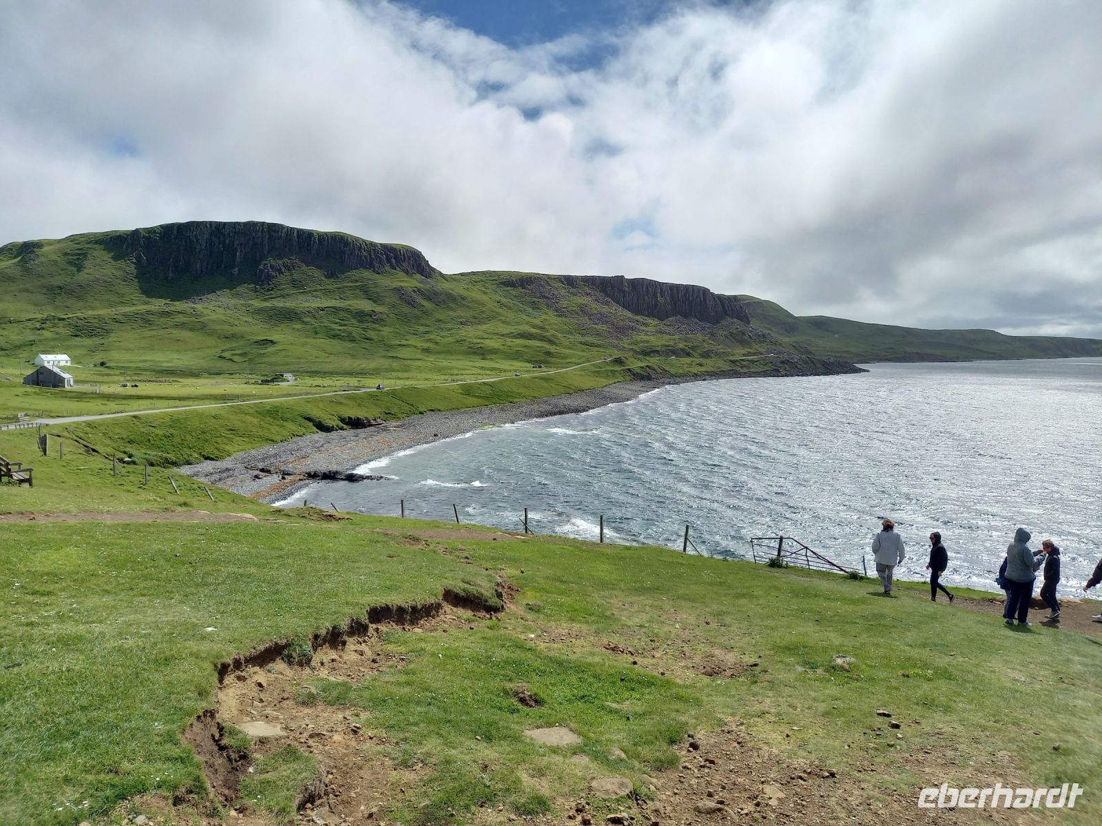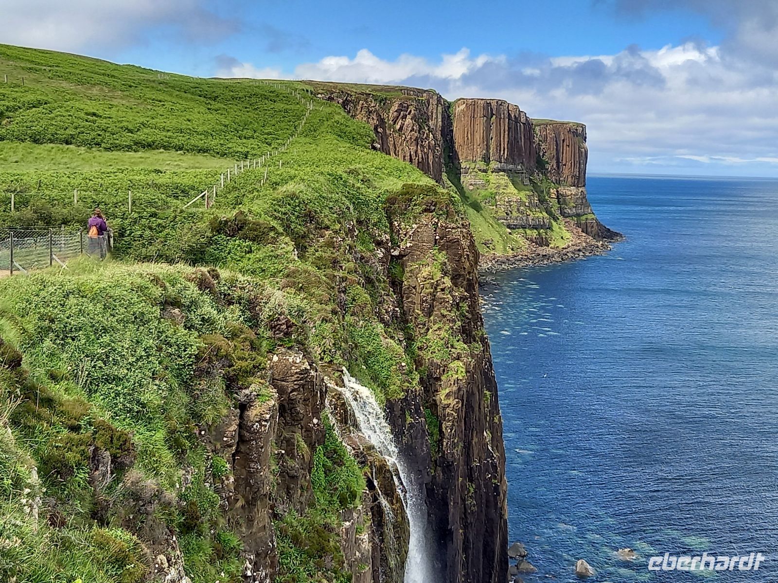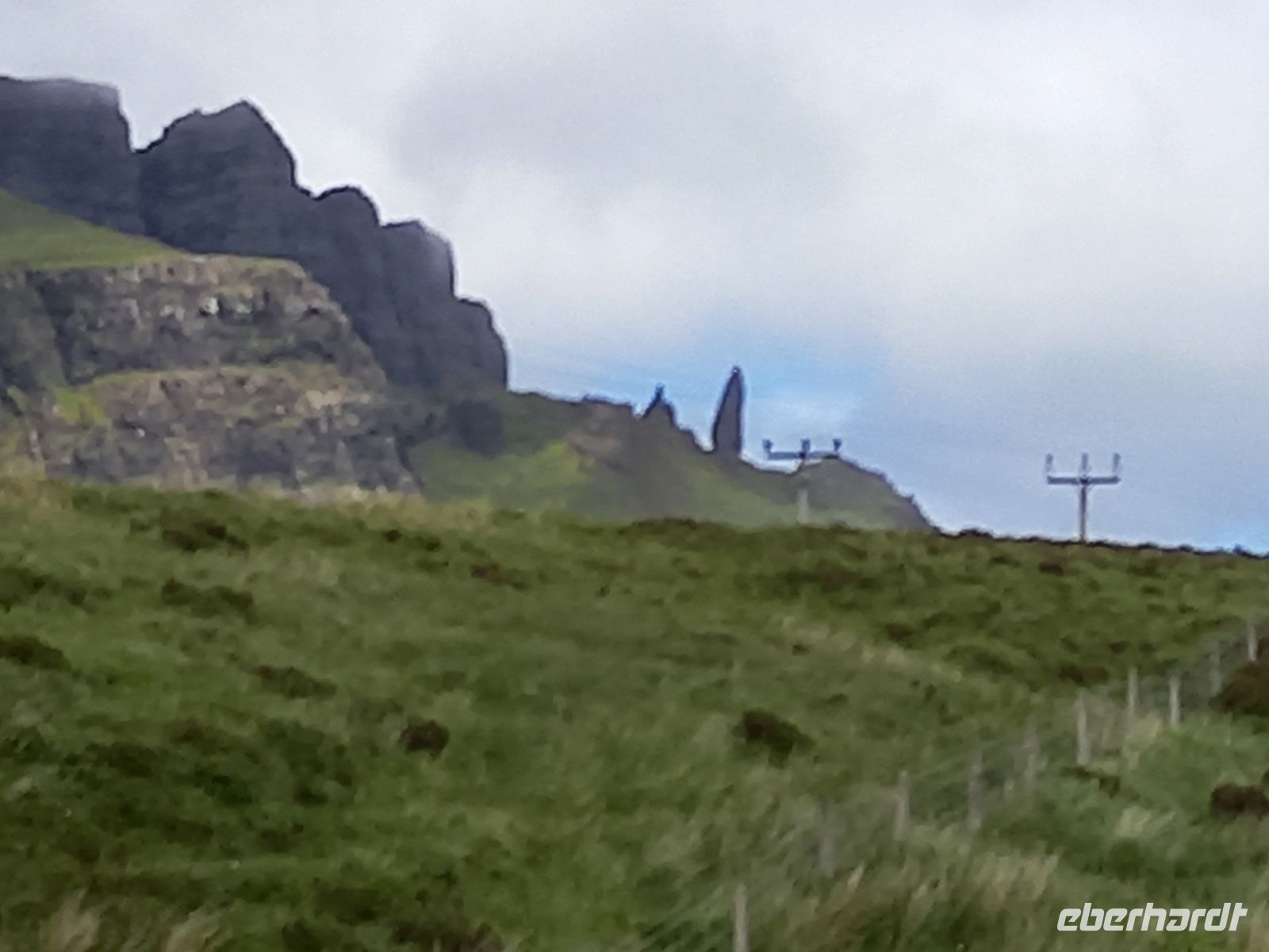 Später fuhren wir mit dem Bus nach Norden, zu einem Fotostopp mit Blick zur Felsnadel des „Old Man of Storr“, einem seltsam geformten Felsen, der etwa fünfzig Meter hoch aus dem Mittelgebirge herausragt und zu den Wahrzeichen von Skye gehört. Der nächste Fotostopp galt der wohl berühmtesten Steilküsten-Formation der Insel, dem berühmten Felsengebiet vo, „Kilt-Rock“ und einem davor ins Meer stürzenden Wasserfall. Die vor Jahrmillionen von Lava geformte Vergangenheit der Insel lässt sich hier gut bestaunen.