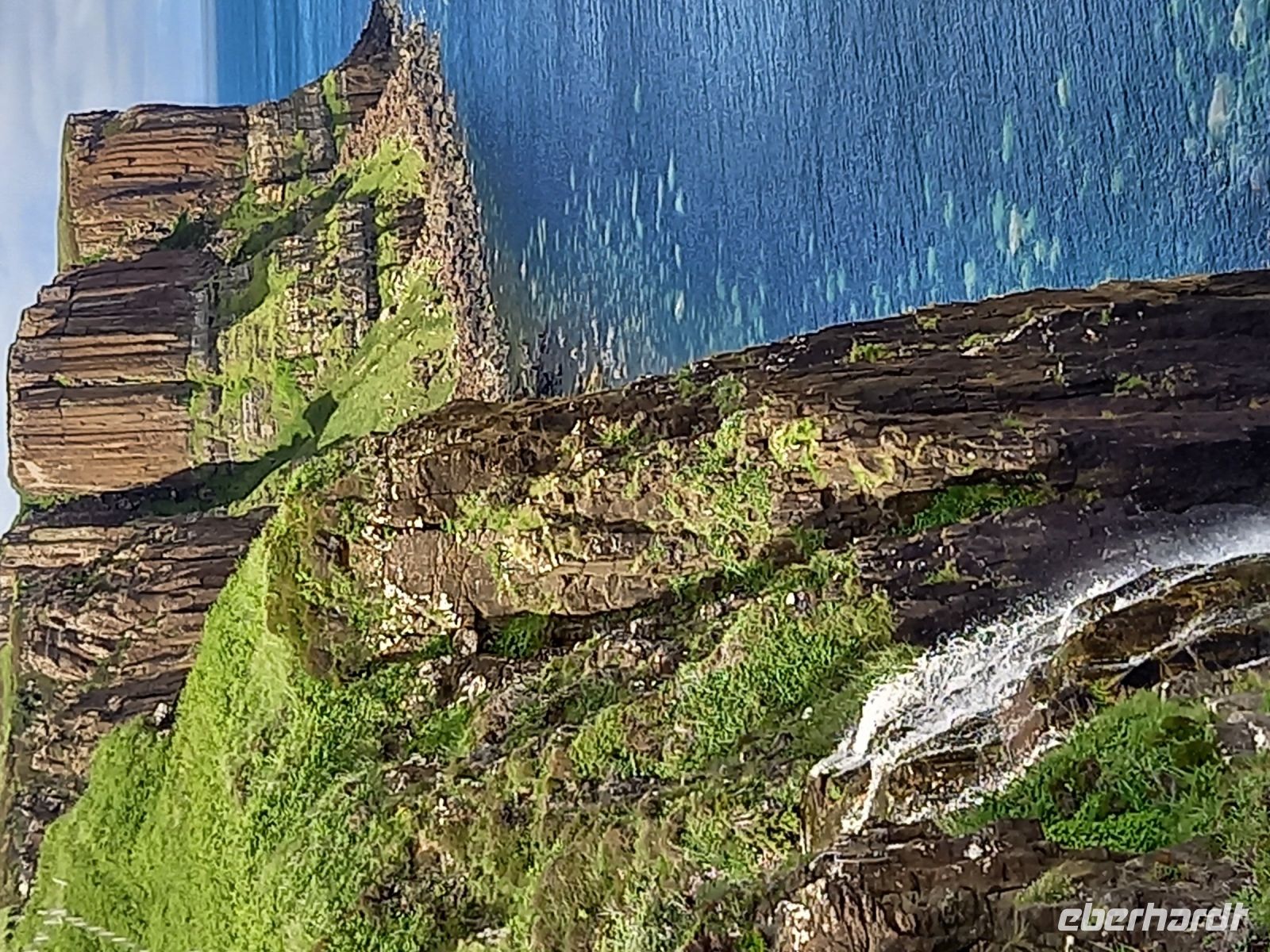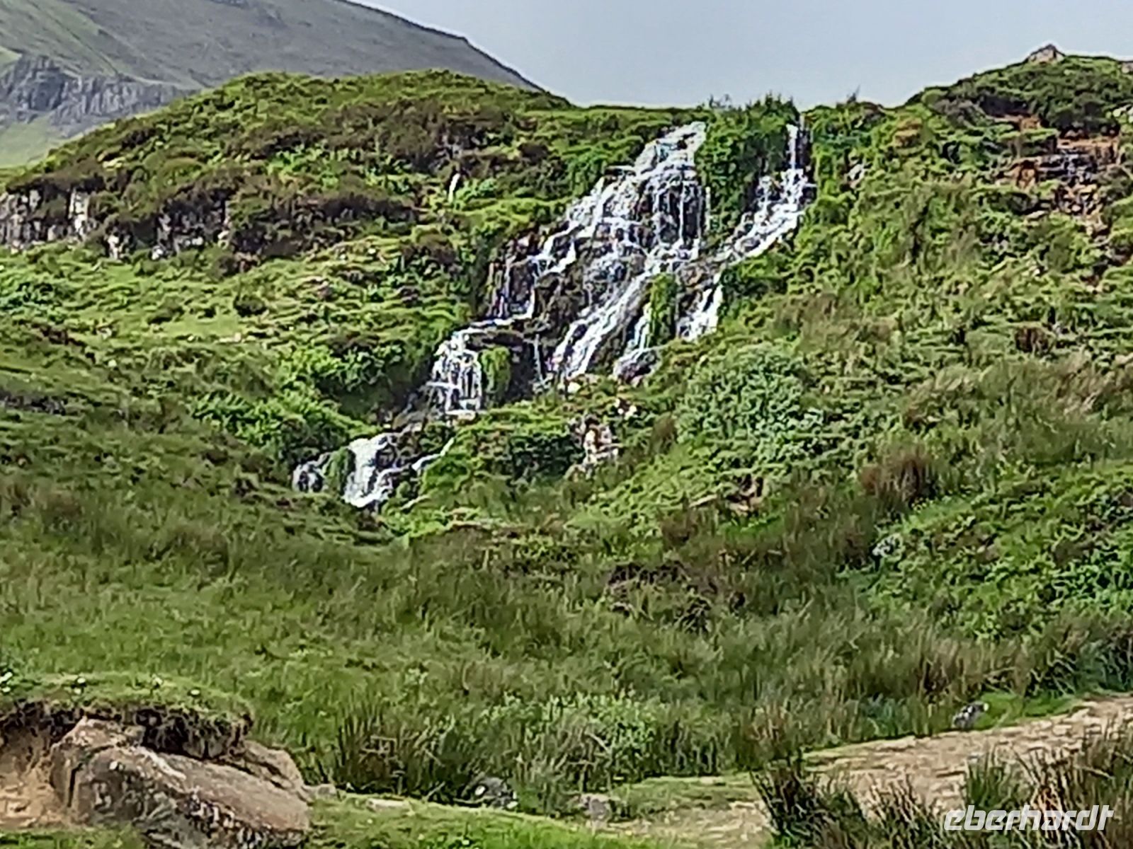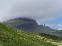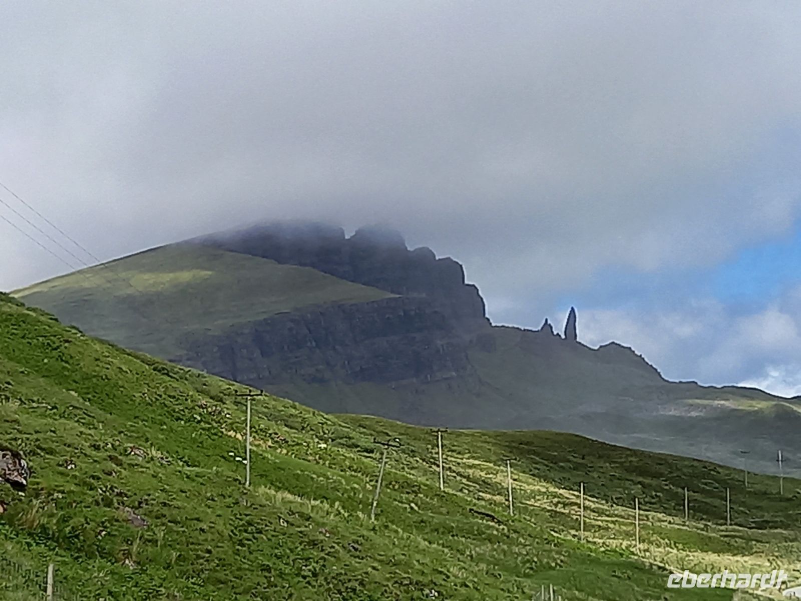 Später fuhren wir mit dem Bus nach Norden, zu einem Fotostopp mit Blick zur Felsnadel des „Old Man of Storr“, einem seltsam geformten Felsen, der etwa fünfzig Meter hoch aus dem Mittelgebirge herausragt und zu den Wahrzeichen von Skye gehört. Der nächste Fotostopp galt der wohl berühmtesten Steilküsten-Formation der Insel, dem berühmten Felsengebiet vo, „Kilt-Rock“ und einem davor ins Meer stürzenden Wasserfall. Die vor Jahrmillionen von Lava geformte Vergangenheit der Insel lässt sich hier gut bestaunen.