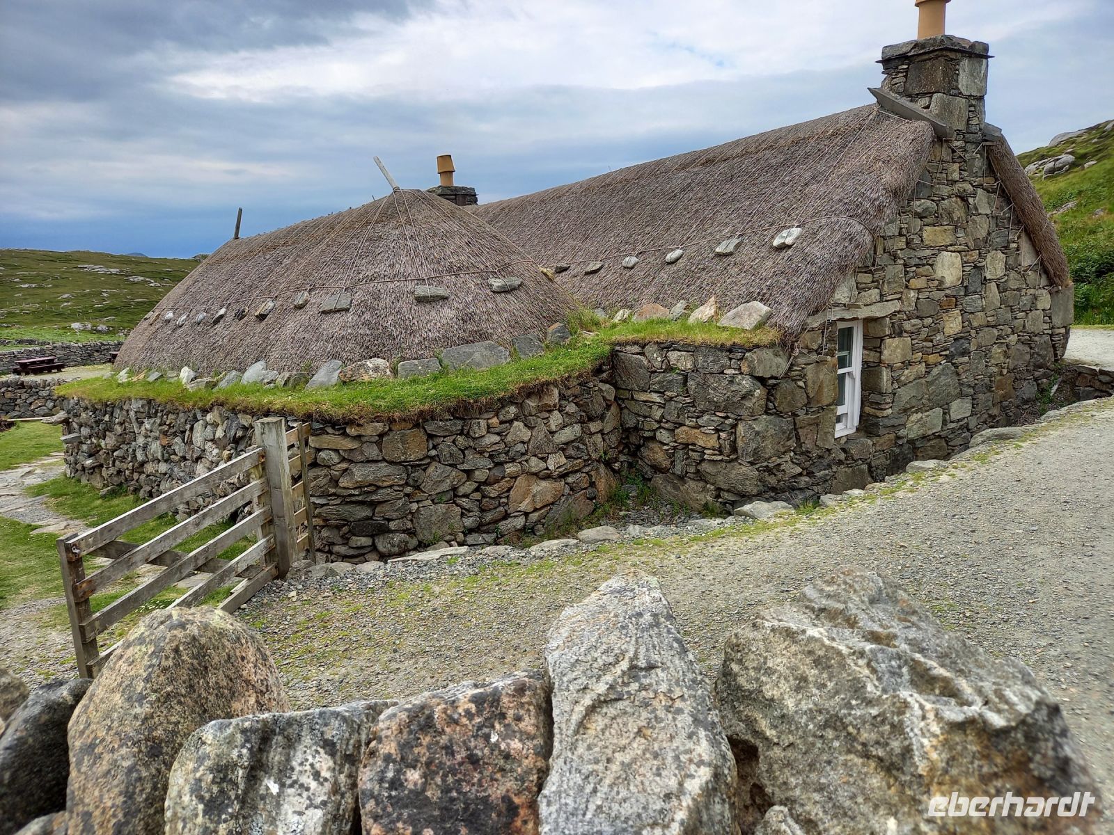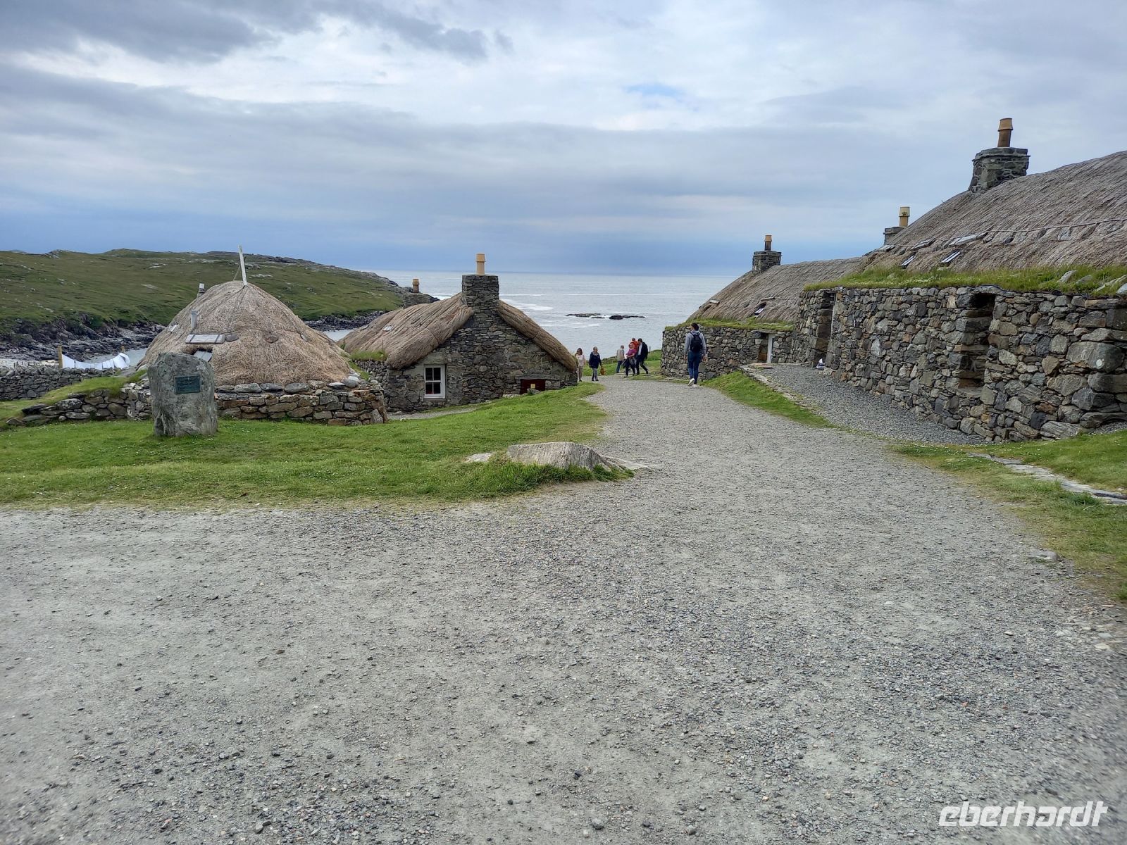 Wir waren auf Lewis unterwegs, das trotz seines rauhen Klimas zahlreiche Spuren prähistorischer und mittelalterlicher Besiedlung trägt. Wir begannen unsere heutige Rundfahrt von Stornoway aus nach Norden und schickten uns nach einem Fotostopp am „Whalebone Archway“, einem originellen Hofeingang aus dem Kiefer eines Blauwals, an, dem Hebridendorfes An Gerannean einen Besuch abzustatten. Hier jedoch ereilte uns ein Missgeschick – unser Bus rutschte auf der recht schmalen Straße in einen Graben und hatte sich sofort festgefahren. Wir kamen alle mit dem Schrecken davon, niemanden war etwas passiert – nur der Bus saß fest! Überwältigend war die Freundlichkeit und Hilsbereitschaft der Bevölkerung aus den umliegenden Gehöften, die sofort Hilfe holten. So gelöang es, dass uns trotz der abgelegenen Strecke am frühen Nachmittag ein Hilsfahrzeug aus dem Graben zog und wir die Fahrt, zwar mit einiger Verspätung und leicht lädiertem, aber verkehrsicherem eigenen Bus fortsetzen konnten. Natürlich haben wir uns das Ziel dieser Fahrt, die alte Fischersiedlung, bestehend aus (restaurierten) Hebriden-Hütten, sogenannten „Blackhouses“ nun doch noch angesehen. Malerisch liegen die alten strohgedeckten Hütten mit ihren dicken Mauern aus Trockenmauerwerk direkt am Ozean. Die Hütten repräsentieren den einst für alle Hebridendörfer üblichen traditionellen Haustyp, in dem einst Menschen und Haustiere, nur durch eine Lehmwand getrennt, unter einem Stroh- oder Grasdach zusammen.