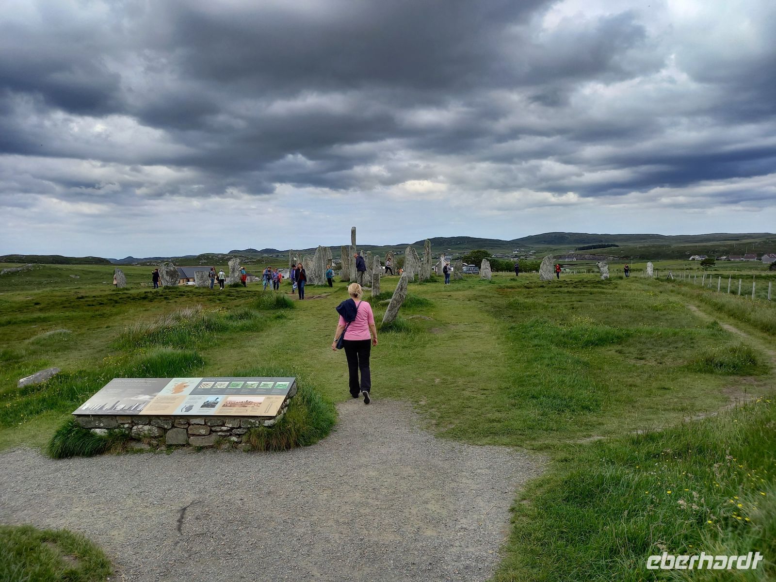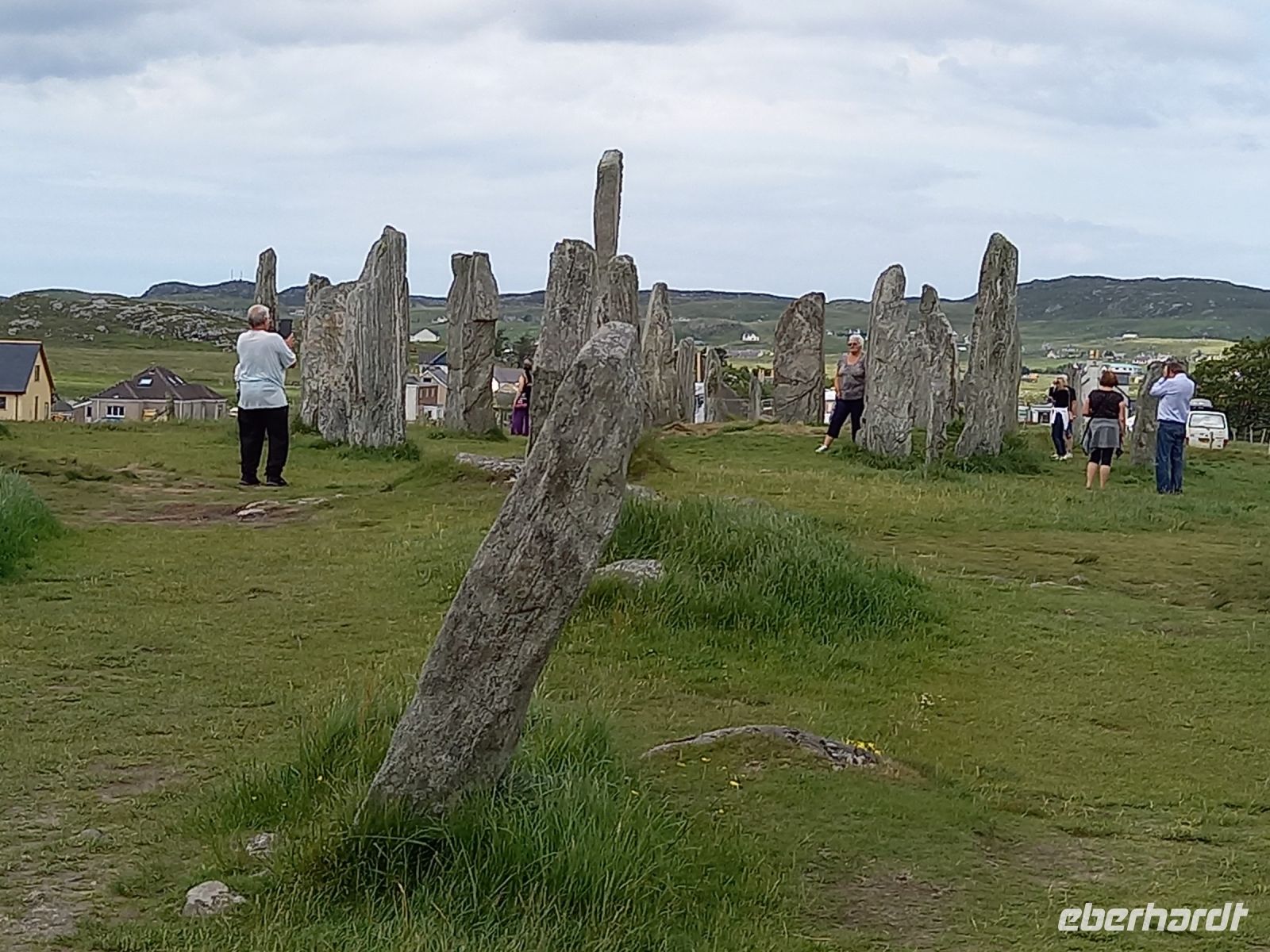 Nach einem Bummel durch das Dörfchen, dessen Häuser man teilweise als Ferienwohnungen mieten kann, fuhren wir noch zu einem weiteren Wahrzeichen der Insel Lewis, der Besichtigung des Großsteinkreises der Standing Stones of Callanish. Mitunter wird der für das vorchristliche Schottland bedeutsame Kultort auch als „Stonehenge Schottlands“ bezeichnet. Zwar stammen beide Monumente etwa aus derselben Zeitperiode , der Jungsteinzeit, aber damit endet ihre Ähnlichkeit. Beides sind allerdings Steinkreise, deren genaue Bedeutung bis heute nicht komplett enträtselt ist. Die kreuzförmige gewaltige Steinsetzung von Callanish mit dem umgebenden Steinkreis zählt zu den besterhaltenen Megalithanlagen Schottlands und wohl ganz Europas. Die gewaltigen Steinblöcke zweier einander kreuzender Steinreihen sind exakt nach den Himmelsrichtungen ausgerichtet und im Inneren des Steinkreises finden sich Überreste eines Dolmens, einer jungsteinzeitlichen Großstein-Grabanlage. Ob man es wahrhaben will oder nicht diese Denkmale aus der Steinzeit sind stets von einer Aura des Geheimnisvollen und Mystischen mit eigenartiger Wirkung umgeben.