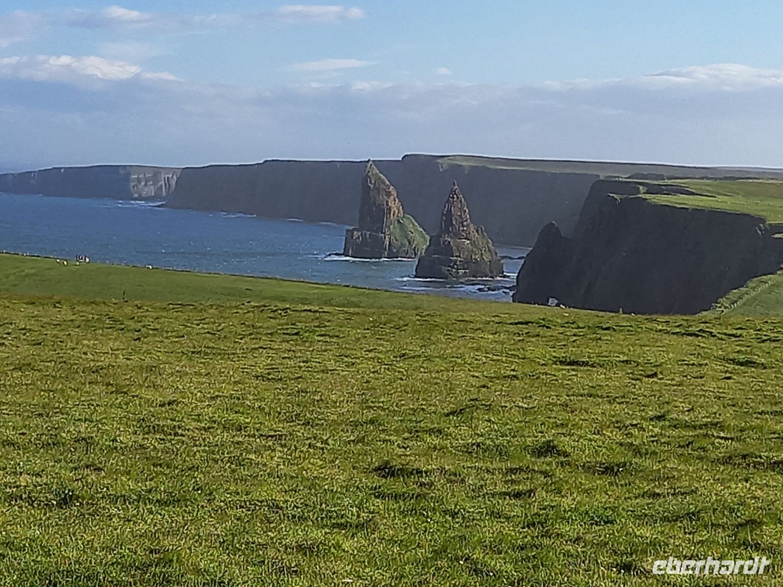 Von hier brachte uns dann der Orkney-Bus wieder zurück zum Hafen von Burwick und wir überquerten den Pentland Firth nach John O’Groats. Hier bestiegen wir wieder unseren eigenen und wir gönnten uns noch einen Abstecher zum Leuchtturm von Duncansby Head. Vor diesem Bauwerk gibt es als Fotomotiv die Möwenfelsen und die auf der anderen Seite der Anhöhe gelegene seltsame Felsenformation der „Duncansby Stacks“, fotogen als „zu Stein erstarrte Segel“. Wir kehrten zurück nach Castletown, wo heute die gesamte Gruppe eincheckte.