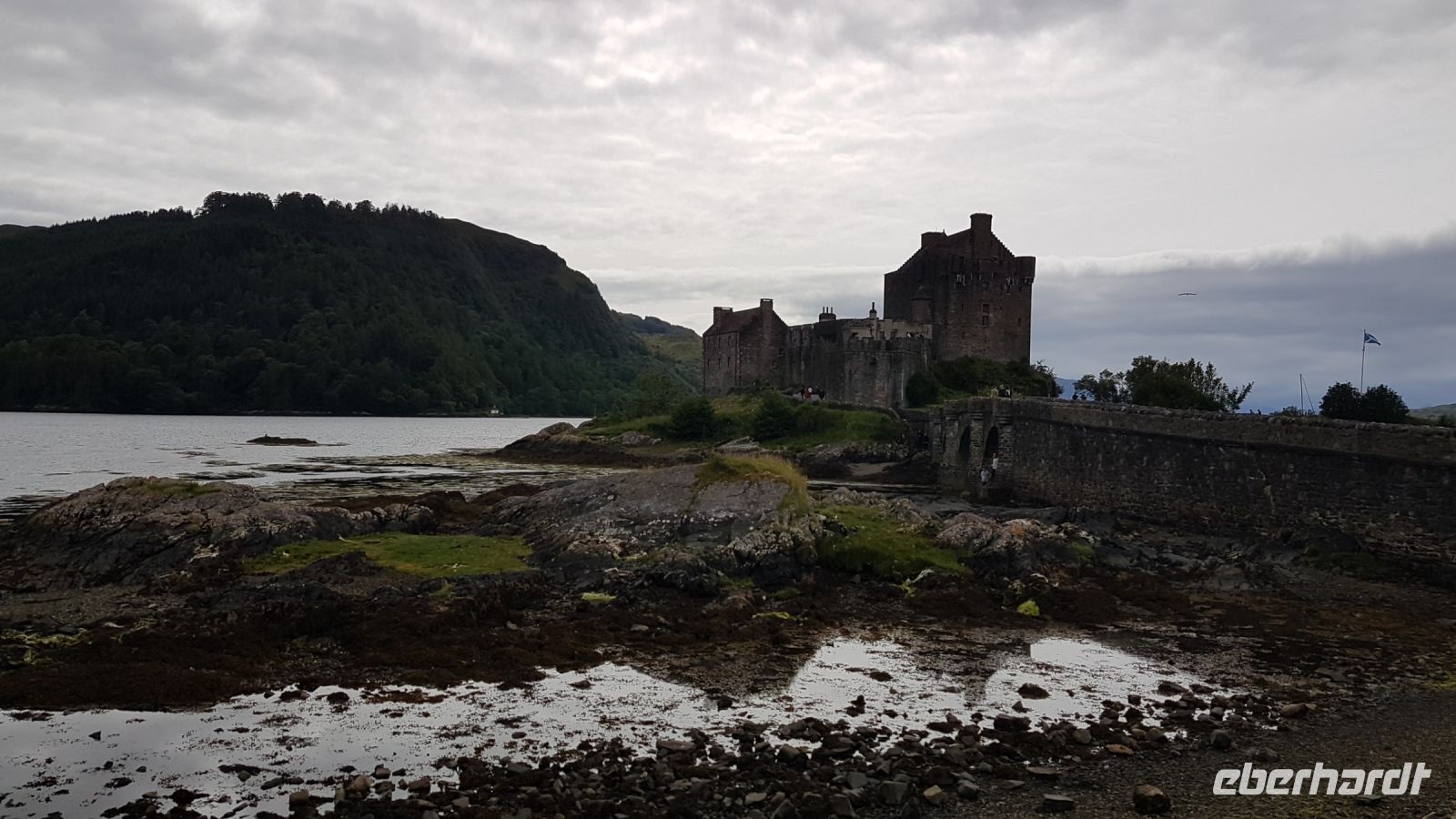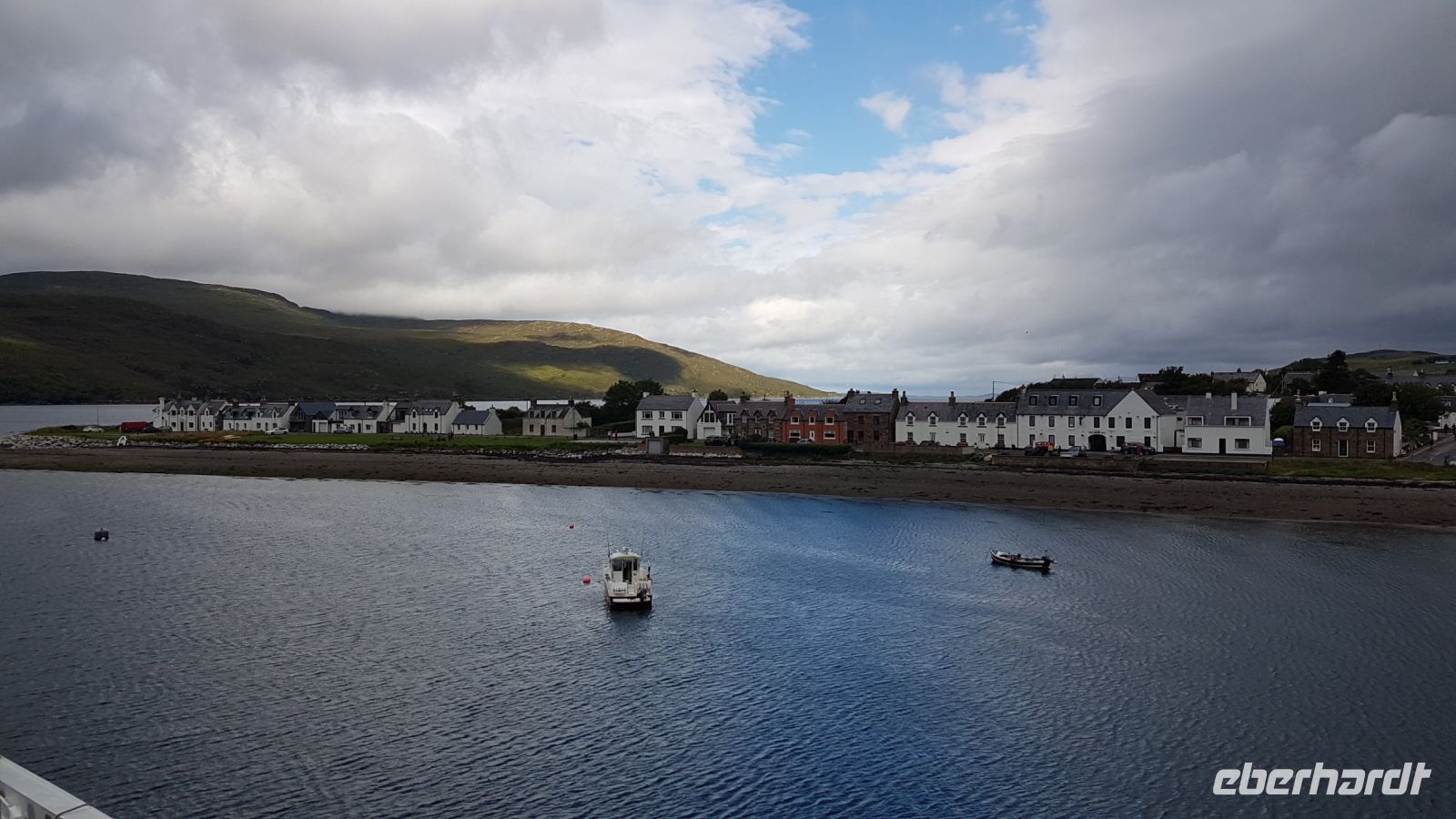 Am Morgen verließen wir Fort William und erkundeten Neptunes Staircase, eine Anlage des Caledonischen Kanals mit 8 Schleusentreppen, die einen Höhenunterschied von 20 Metern überwinden. In Glenfinnan besuchten wir das gleichnamige Monument, das an die Vereinigung der schottischen Clans in der Mitte des 18. Jahrhunderts erinnert, das Bonnie Prince Charlie im Kampf gegen die englische Krone gelungen war. Gleich in der Nähe genossen wir einen schönen Blick auf Glenfinnan Viadukt, auf dem der Jacobite Dampfzug verkehrt, dieser ist als Hogwarts Express in Harry Potter Filmen berühmt geworden. Gegen Mittag setzten wir mit der Fähre von Mallaig über nach Armadale auf der Isle of Skye. Zunächst besuchten wir Broadford, wo wir eine Mittagspause einlegten. In Kyle of Lochalsh fotografierten wir farbenfrohe Boote vor der Kulisse grüner Berge im malerischen See. Wir besuchten Eilean Donan Castle, das meist fotografierte Motiv in Schottland, bekannt aus zahlreichen Filmen. Den Abend verbrachten wir im Kings Arms Hotel in Kyleakin, ganz in der Nähe der imposanten Skye Road Bridge.