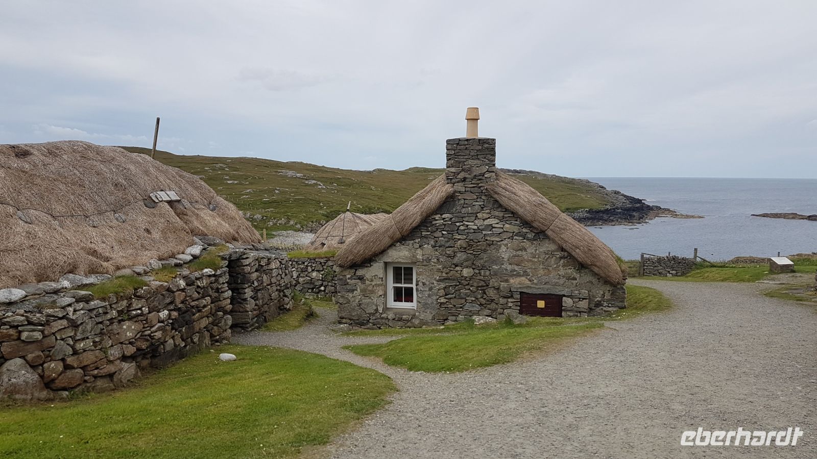 Heute empfing uns der Morgen mit Sonnenschein und blauem Himmel, so nutzten wir das schöne Wetter, um am Strand Braighe Beach zu spazieren, den breiten Sandstrand und die Felsen dazwischen zu genießen. Danach legten wir einen Stop am Whalebone Arch ein, ein Eingangstor aus Walfischknochen, von einem hier im Jahre 1920 gestrandeten Wal. Im Gearrannan Blackhouses Village konnten wir sehen, wie die Menschen hier früher gelebt und gearbeitet haben. Leider hat sich eine unserer Gäste dort am Fuß verletzt, sie musste daraufhin ins Krankenhaus und konnte die weitere Reise nicht mit fortsetzen, wir wünschen ihr alle gute und schnelle Genesung. Die anderen