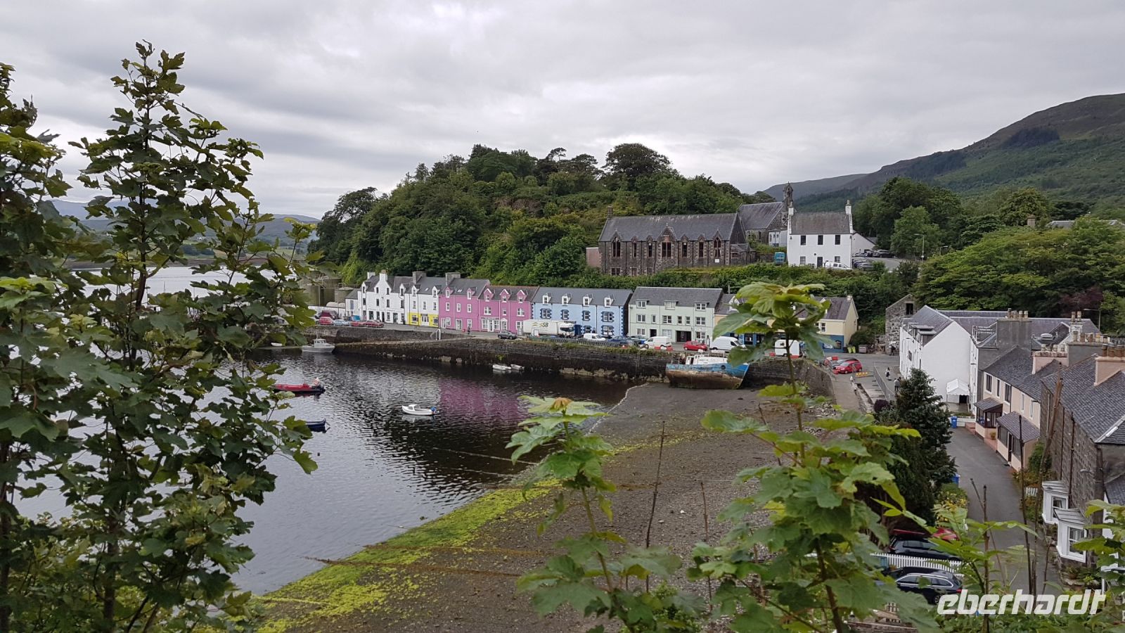 Nach einem guten Frühstück verließen wir Kyleakin und fuhren erneut in Richtungen Portree, um heute die Halbinsel Trotternish zu erkunden, die sich im nördlichen Teil der Insel Skye befindet. Zunächst hielten wir an einem imposanten Wasserfall und fotografierten die beeindruckende Landschaft aus Bergen, Seen und Bächen. Bald danach erreichten wir Portree, den Hauptort der Insel Skye. Bei etwas Freizeit entdeckten wir die bunten Häuser am Hafen, den Marktplatz und hübsche kleine Geschäfte. Wir verließen Portree und waren schon bald wieder mitten in grandioser Landschaft, fotografierten die markante Felsnadel Old Man of Storr, die mit einer Höhe von 48 Metern an einem Felsmassiv weithin sichtbar in den Himmel ragt. An einem Aussichtspunkt hielten wir erneut und fotografierten den berühmten Felsen Kilt Rock, neben dem sich ein Wasserfall ins Meer ergießt. Erkaltende Lavaströme über scheinbar endlose Zeiten haben dieser Felsenklippe ein Muster beschert, das an einen Schottenrock – einen Kilt – erinnert. Im Skye Museum of Island Life konnten wir uns mit der Lebensweise der Menschen hier im 18. und 19. Jahrhundert vertraut machen. Eine Ansammlung von Blackhouses, massive geduckte Steinhäuser mit Strohdächern, zeigen eine Schmiede, Weberei und Wohngebäude von früher. In der Nähe auf einem kleinen Friedhof erinnert ein Monument an Flora MacDonald, die im 18. Jahrhundert Bonny Prince Charlie bei der Flucht vor den Engländern tatkräftig unterstützt hatte und heute als Heldin verehrt wird.