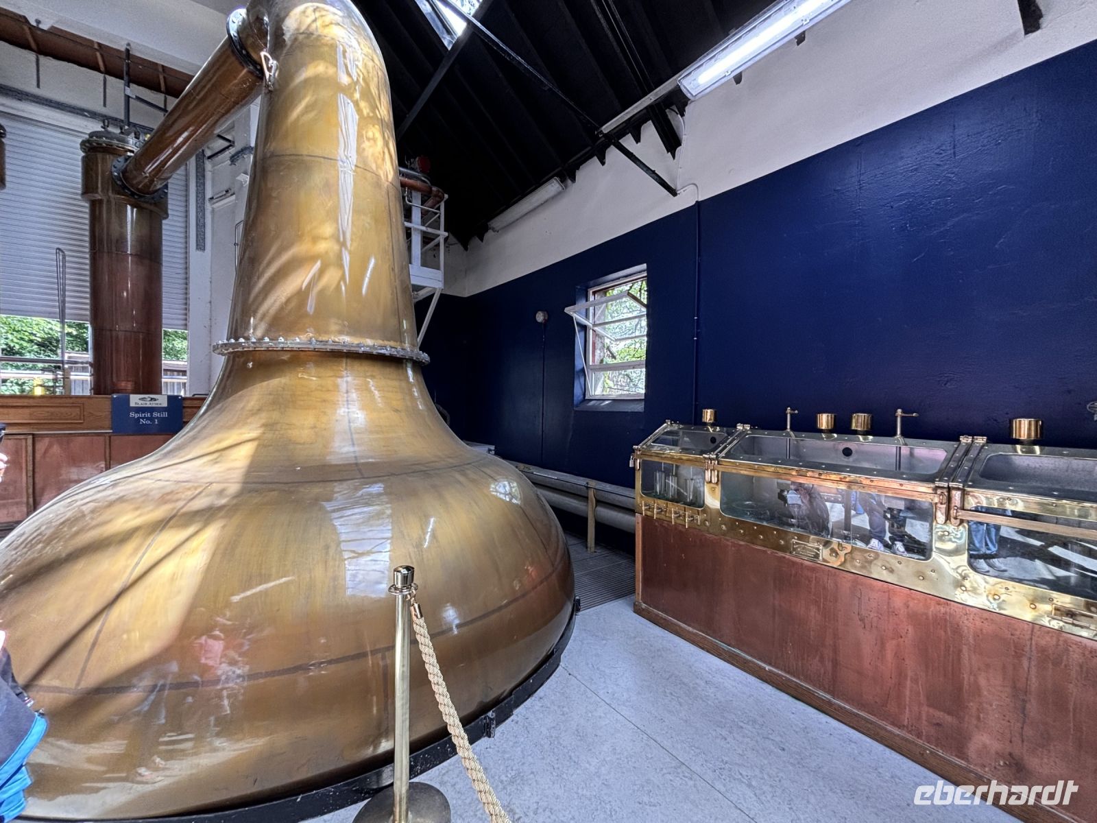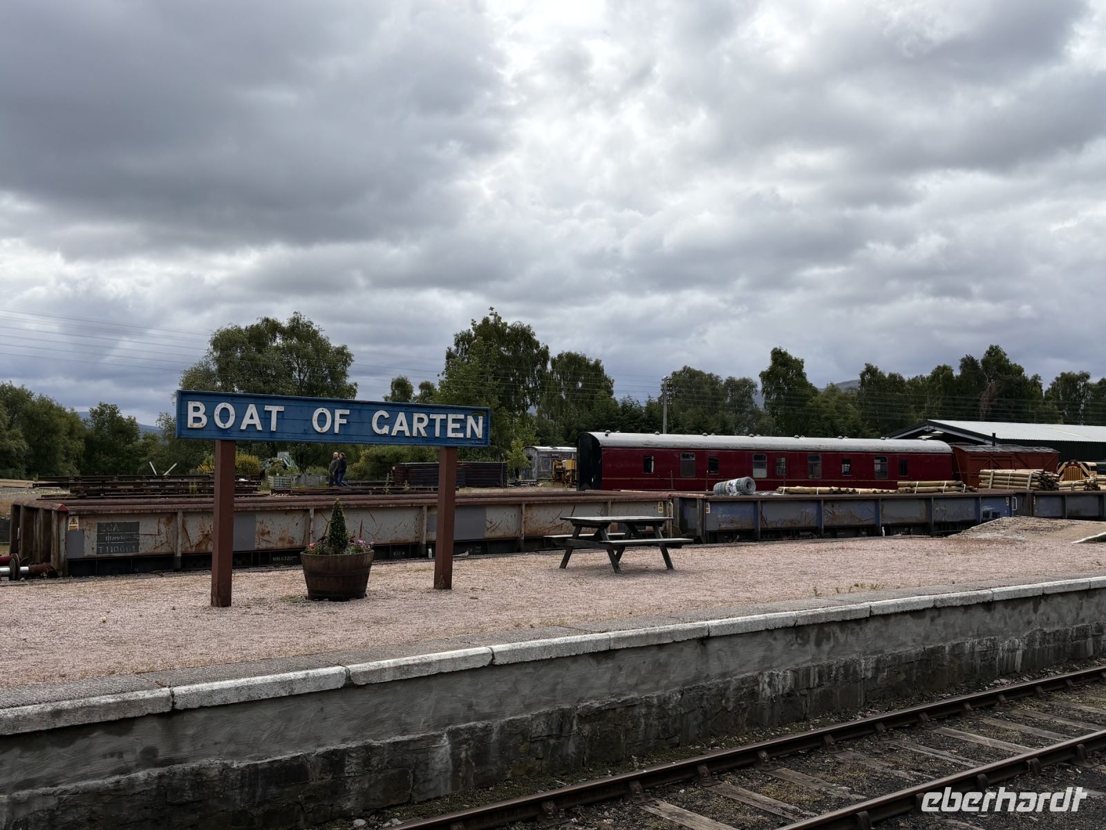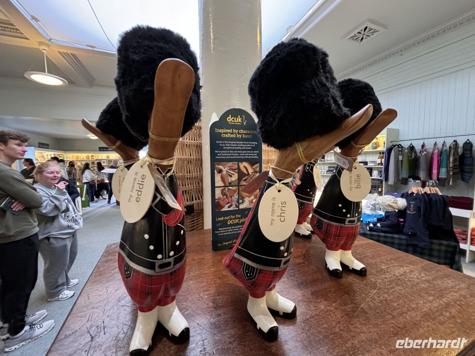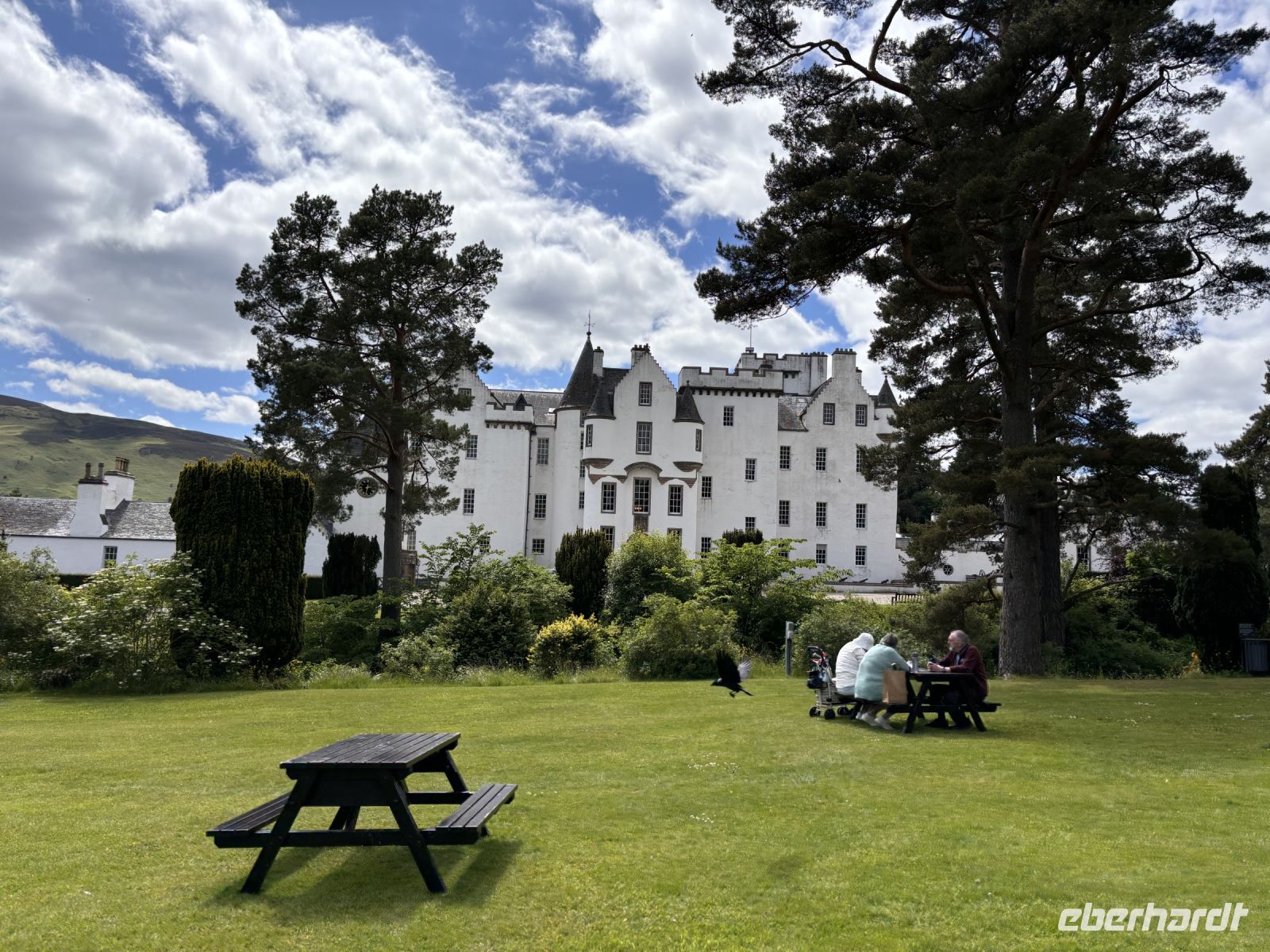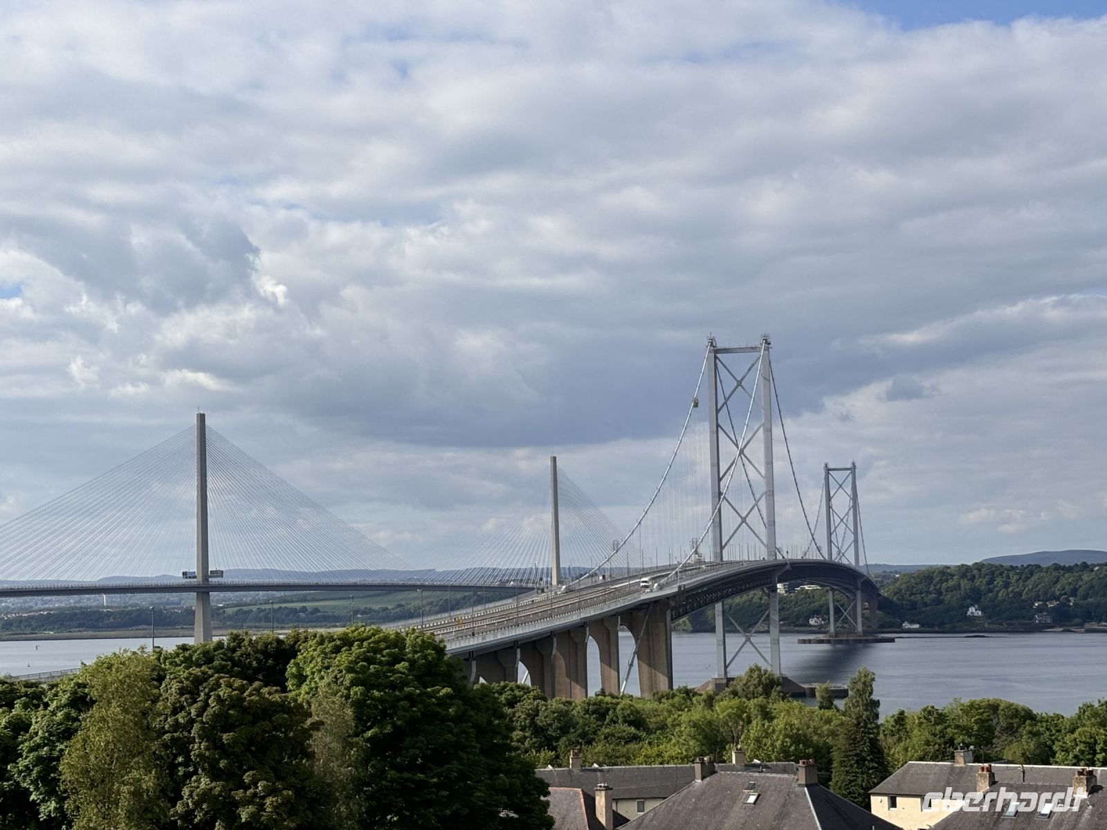 Beeindruckende Landschaften der Grampian Mountains im Cairngorms-Nationalpark stehen auf dem Programm. Wir besuchen nach dem Frühstück zuerst den Ort Pitlochry, halten jedoch vorher an einer sehr besonderen Brücke in Carrbridge. Hier schritt früher die Trauergemeinde auf dem Weg zur Kirche herüber. Daniel und Sabine überlegen sich, einen Halt am nostalgischen Bahnhof von Boat of Garden einzulegen. Da haben wir doch auch noch Glück, und eine alte schnaubende Dampflok erreicht den Bahnhof. Die Wartehalle ist so gemütlich, dass Sabine den Schaffner spielt, um die Gäste vom Einsteigen in den Zug abzuhalten. Wir freuen uns über so viel Glück und reißen uns vom Anblick der alten Waggons los. Es geht nach Pitlochry. Freizeit, um noch Kleinigkeiten für zu Hause einzukaufen. Blair Athol Disitllery wartet schon mit einer spannenden Führung auf uns. Wir wundern uns, dass die alten Gebäude und auch die Bäume schwarz sind. Die Erklärung dazu bekommen wir vom Guide des Whiskyherstellers geliefert. Kupferkessel, Mittellauf, Fässer und vieles mehr lässt auf einen 12-jährigen Whisky hoffen. Bingo – wir dürfen kosten. Leichten Schrittes verlassen wir den Ort des heiligen Wassers und besichtigen das nahe gelegene Blair Castle mit seiner riesigen Waffensammlung. Hier erfahren wir von dem Atholl Highländer Infanterieregiment, welches Queen Victoria lizenzierte. Mit 30 Zimmern ist das Castle nicht so groß, aber sein uralter Baumbestand im Garten dafür nicht weniger beeindruckend. Da die Reiseleiterin ein Versprechen einhalten wollte, ging es noch kurz nach Queensferry, um den Ausblick auf die drei Brücken über den Firth of Forth bei Edinburgh zu genießen. Der Abend rückt näher, wir fahren ins Hotel nach Peebles, um es uns für die Nacht gemütlich zu machen.