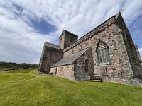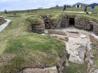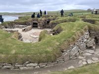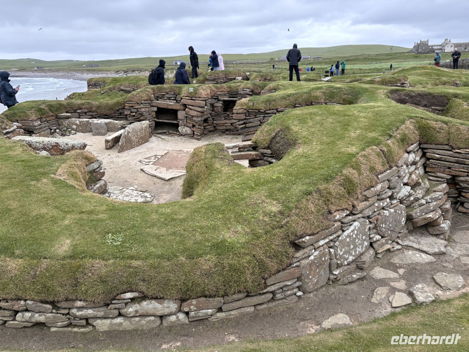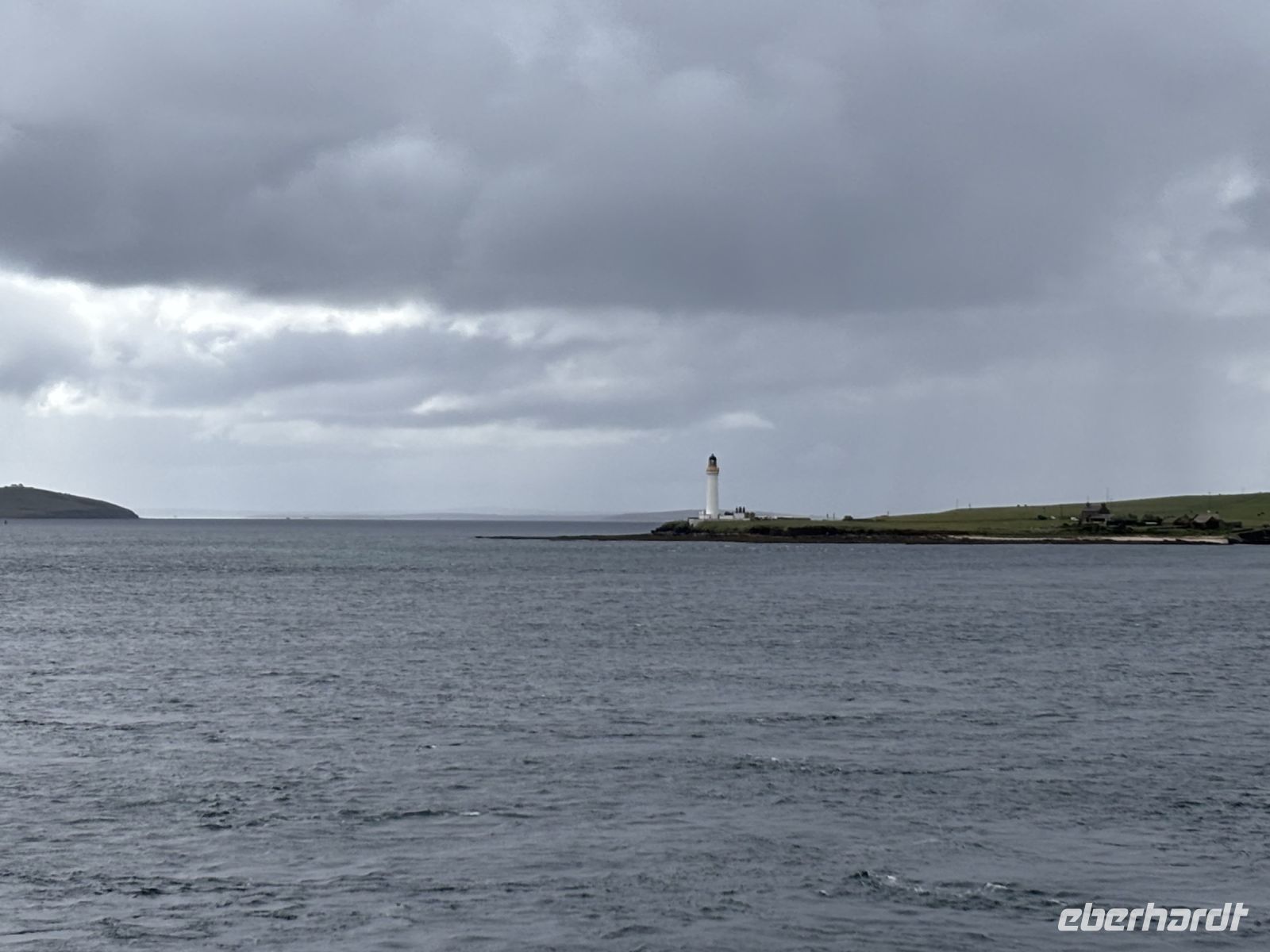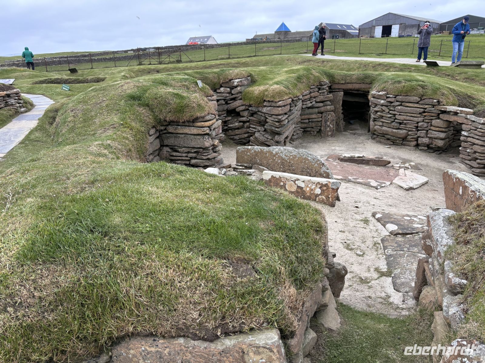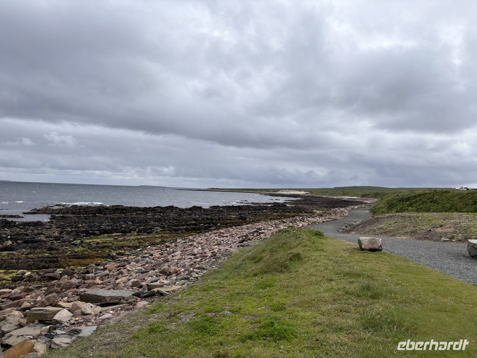 Die Insel Orkney ruft! Wir setzen samt Bus und Gästen von Scabster nach 90-minütiger Überfahrt mit der NorthLink Ferrie über und landen in Stromness an. Straff der Plan, um alle Sehenswürdigkeiten zu erleben, fahren wir zuerst zur italienischen Kapelle am südlichen Ende der Orkney-Insel, Mainland. Klein, aber „Hui“, so viel Herzblut haben die Kriegsgefangenen in den Umbau dieser Baracke gesteckt, dass wir uns gar nicht satt sehen können. Kurz hinter der Kapelle finden wir schon die SS Reginald, das Eisendampfschiff, welches 1915 am anderen Ufer der A961 versenkt wurde. Wir fahren über die Churchill Barrikaden, die Ende des 2. Weltkrieges hier errichtet wurden, um Scapa Flow vor feindlichen U-Booten zu schützen. Das Gewässer mit der Fläche von etwa 120 Quadratmeilen umgibt das Festland der Orkney-Insel, die Südinseln und macht es zu einem geschützten Hafen mit einfachem Zugang zur Nordsee und zum Atlantik. In der Hauptstadt der Insel Kirkwall schauen wir uns im Visitor Center einen kurzen Film über die St. Magnus Kathedrale, „Das Licht im Norden“ an und überzeugen uns von der Schönheit des Bauwerkes im Anschluss. Ein kurzer Abstecher in die Fußgängerzone sitzt noch drin, bevor es weiter geht zur einzigartigen Stätte von Skara Brae. Der Wind pfeift mit 32 Knoten über die Ausgrabungen des Dorfes und wir können nachvollziehen, wie es 1850 William Watt ergangen sein muss, als er die ersten Funde nach dem Sturm machte. 5.000 Jahre Geschichte stecken hier in der Erde. Hoch kulturell muss es hergegangen sein. Kaum zu glauben, dass Menschen ohne Waffen hier Jahrhunderte zusammengelebt haben. Wir sehen als Nächstes den Ring of Brodgar und schreiten um die riesenhaften Monolithen herum. Auch die Standing Stones of Stenness beeindrucken. Nur der Rasenmähertraktor saust um uns herum, um die Kultstätte begehbar zu halten und scheucht uns vom Platz;)). Nah ja, leider ist es schon wieder Zeit zu gehen und wir fahren zur Fähre nach Stromness zurück, um an das Festland zu gelangen.