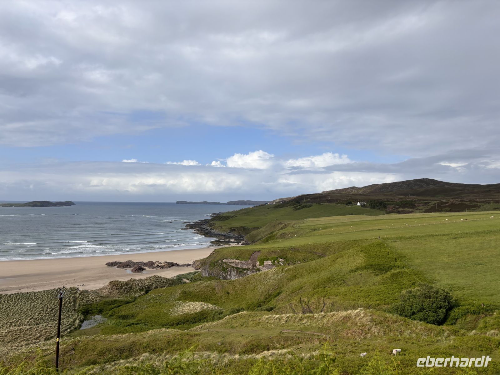 Da sonntags in Stornoway die Bürgersteige hochgeklappt sind, geht unsere Reise schon vor dem Frühstück los. Bereits um 7:30 Uhr betreten wir die Fähre am Hafen von Stornoway und winken der Insel Lewis ein letztes Mal zu. Die Überfahrt nach Ullapool im Norden des schottischen Festlandes dauert fast 3 Stunden. Wir genießen das Frühstück an Bord und machen es uns bequem. Die Ankunft in Ullapool lässt uns Zeit für eine kurze Inspektion des Ortes, bevor wir uns Richtung Osten, immer der Küste entlang, nach Thurso begeben. Wir entdecken das Knockan Crag Visitor Center auf der NC500 mit beeindruckenden Weit-Sichten in dem kargen Umland. Fotostopps unterwegs mit der Ruine des Ardvreck Castles am Loch Assynt und dem U-Bootdenkmal bei der Kylesku Bridge. Ein weiterer Stopp ist der Strand von Durness. Es fehlt uns noch, dass Naturdenkmal der sagenumwobenen Smoo Cave. Hier beeindrucken uns die Wassermassen im Inneren der Höhle, die durch das Mundloch stürzen. Wir wandern die Klippe des mit Kalk durchzogenen Küstenabschnittes entlang und erleben die ursprüngliche Natur der Highlands. Der Tag hat uns mit erstaunlich vielen landschaftlichen Schönheiten beglückt. Wir lassen den Tag dann ruhig im Hotel ausklingen.