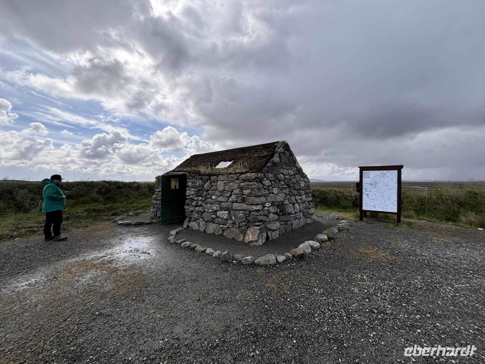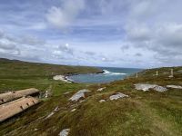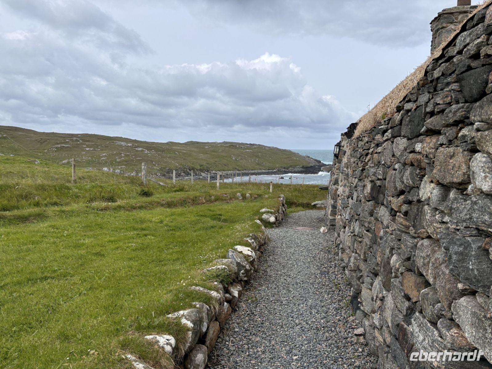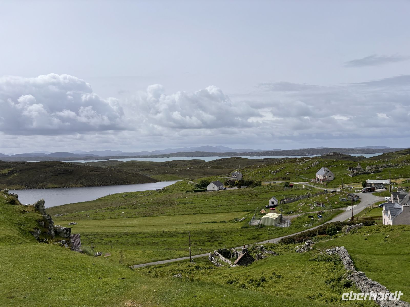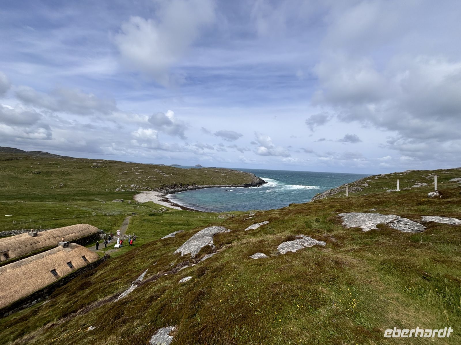 Auf zur Inselrundfahrt, Harris und Lewis. Unser erster Stopp ist der Walknochenbogen, der in einem Garten neben einem Wohnhaus steht, in Bragar. Das arme Tier war von Walfängern erlegt worden und an den Strand gespült, vor 100 Jahren. Die Harpune steckte noch in dem Blauwal. Spontan halten wir unterwegs am Moor Shieling, An Àirigh, einer Moorhütte, die als Unterkunft für Hirten gedacht war. Heute ist sie mit einer Ansammlung von „Dingen“ als Erinnerung an vergangene Zeiten bestückt. Das Interesse ist geweckt und unser nächster Stopp ist das Museumsdorf Gearrannan Blackhouse. Toll gelegen an einer wunderschönen Bucht, in der das Meer rauscht und wir eintauchen in die Lebensart von vor 100ten Jahren. Die Häuser der Torfstecher sind einfache Behausungen, in denen gelebt und gearbeitet wurde. Wir freuen uns über die Vorführung am Webstuhl und die Geschichten der eifrigen Museumsmitarbeiter. Wie kann es anders sein, bei Sonnenschein und Wind, ?. Die nächste Haltestelle ist die Ruine des Dun Caroway Broch, einer Wehranlage der Pikten von vor 2.000 Jahren. Hier können wir uns gut vorstellen, dass die Menschen sich in dem Turm sicher fühlten bei Angriffen von Feinden. Mittags erleben wir nun einer der Highlights unserer Reise, die Standing Stones of Callanish. Wir versammeln uns in der Mitte des inneren Kreises und lauschen den Ausführungen unserer Reiseleiterin Sabine. Ergriffen von diesem magischen Ort legen wir eine Schweigeminute ein, um nachzufühlen, welche Energie von diesem Ort ausgeht. Langsam aber sicher haben wir Hunger. Wir rasten am Aline Community Woodland. Hier gibt es einen Rundweg auf Holzplanken, den wir erkunden und als wir bei der Hütte ankommen, haben Daniel, der Busfahrer, Sabine, die Reiseleiterin und einige der hilfsbereiten Gäste ein mega Picknick Buffet aufgebaut. Wir lassen es uns schmecken. Gestärkt und guter Dinge fahren wir nach Harris herüber, um uns die handwerklich unschlagbaren Stoffe der Harris-Weber anzusehen und ein Abstecher in die Harris Distillerie kann auch nicht schaden, es regnete, als ist shoppen perfekt in Tarbet! Der Tag war super schön und wir fallen nach dem Abendessen im Hotel ins Bett.