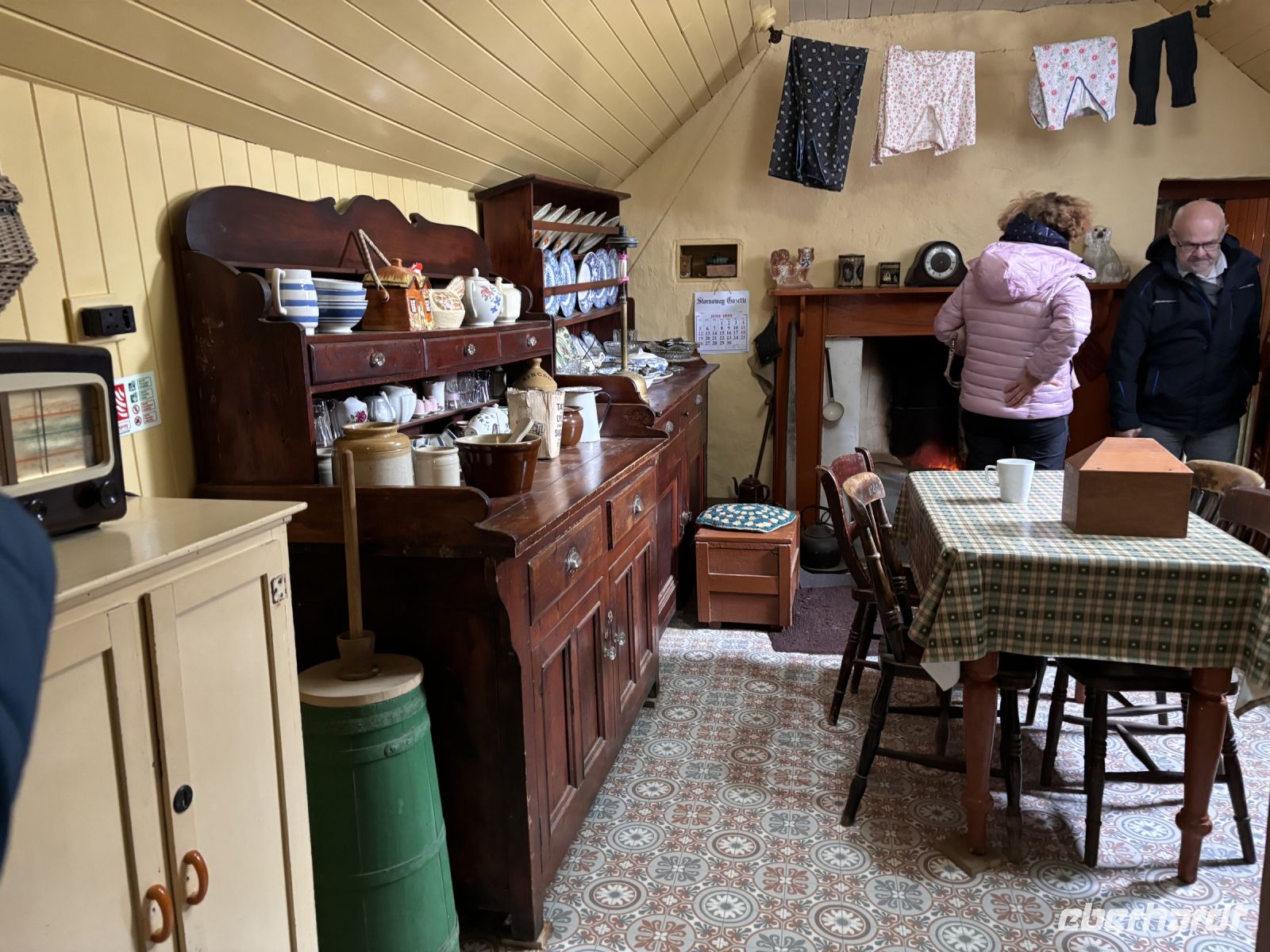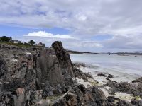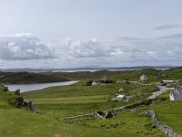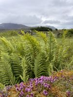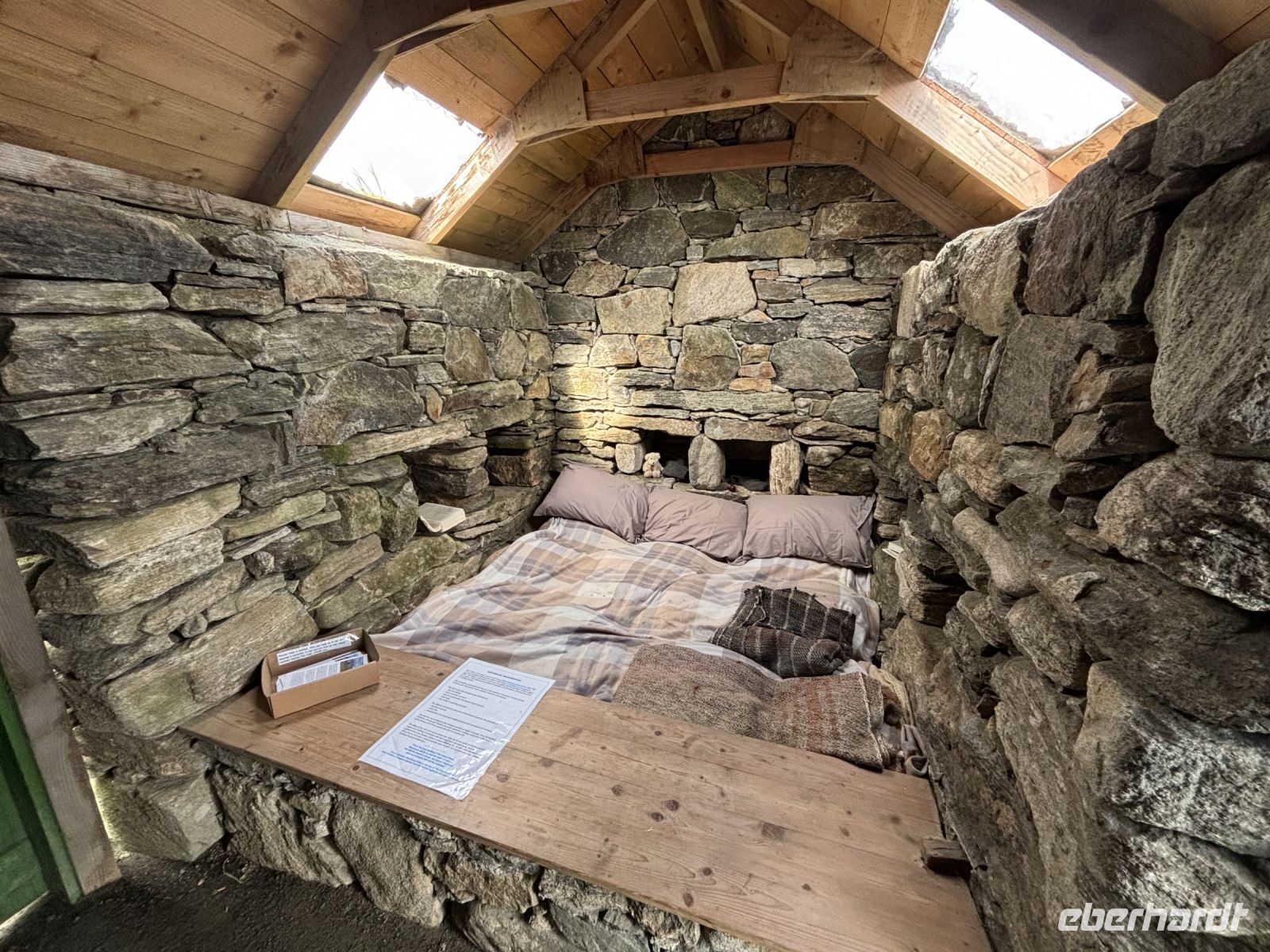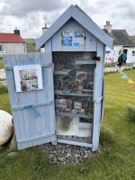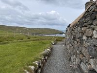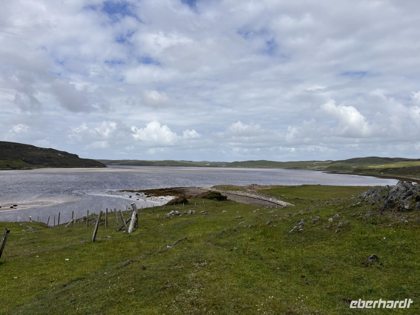 Auf zur Inselrundfahrt, Harris und Lewis. Unser erster Stopp ist der Walknochenbogen, der in einem Garten neben einem Wohnhaus steht, in Bragar. Das arme Tier war von Walfängern erlegt worden und an den Strand gespült, vor 100 Jahren. Die Harpune steckte noch in dem Blauwal. Spontan halten wir unterwegs am Moor Shieling, An Àirigh, einer Moorhütte, die als Unterkunft für Hirten gedacht war. Heute ist sie mit einer Ansammlung von „Dingen“ als Erinnerung an vergangene Zeiten bestückt. Das Interesse ist geweckt und unser nächster Stopp ist das Museumsdorf Gearrannan Blackhouse. Toll gelegen an einer wunderschönen Bucht, in der das Meer rauscht und wir eintauchen in die Lebensart von vor 100ten Jahren. Die Häuser der Torfstecher sind einfache Behausungen, in denen gelebt und gearbeitet wurde. Wir freuen uns über die Vorführung am Webstuhl und die Geschichten der eifrigen Museumsmitarbeiter. Wie kann es anders sein, bei Sonnenschein und Wind, ?. Die nächste Haltestelle ist die Ruine des Dun Caroway Broch, einer Wehranlage der Pikten von vor 2.000 Jahren. Hier können wir uns gut vorstellen, dass die Menschen sich in dem Turm sicher fühlten bei Angriffen von Feinden. Mittags erleben wir nun einer der Highlights unserer Reise, die Standing Stones of Callanish. Wir versammeln uns in der Mitte des inneren Kreises und lauschen den Ausführungen unserer Reiseleiterin Sabine. Ergriffen von diesem magischen Ort legen wir eine Schweigeminute ein, um nachzufühlen, welche Energie von diesem Ort ausgeht. Langsam aber sicher haben wir Hunger. Wir rasten am Aline Community Woodland. Hier gibt es einen Rundweg auf Holzplanken, den wir erkunden und als wir bei der Hütte ankommen, haben Daniel, der Busfahrer, Sabine, die Reiseleiterin und einige der hilfsbereiten Gäste ein mega Picknick Buffet aufgebaut. Wir lassen es uns schmecken. Gestärkt und guter Dinge fahren wir nach Harris herüber, um uns die handwerklich unschlagbaren Stoffe der Harris-Weber anzusehen und ein Abstecher in die Harris Distillerie kann auch nicht schaden, es regnete, als ist shoppen perfekt in Tarbet! Der Tag war super schön und wir fallen nach dem Abendessen im Hotel ins Bett.