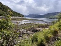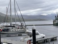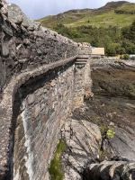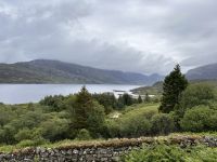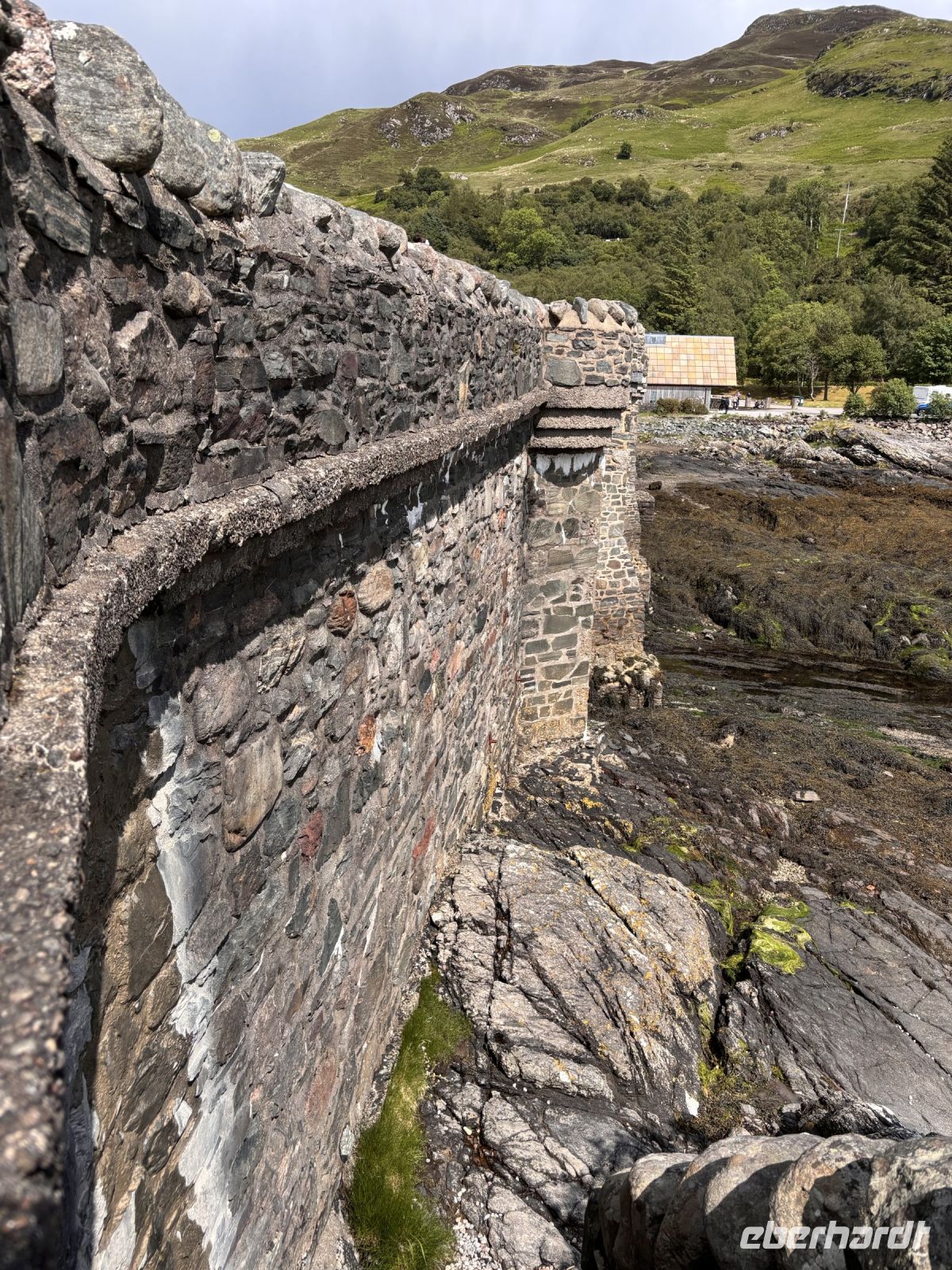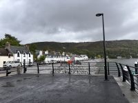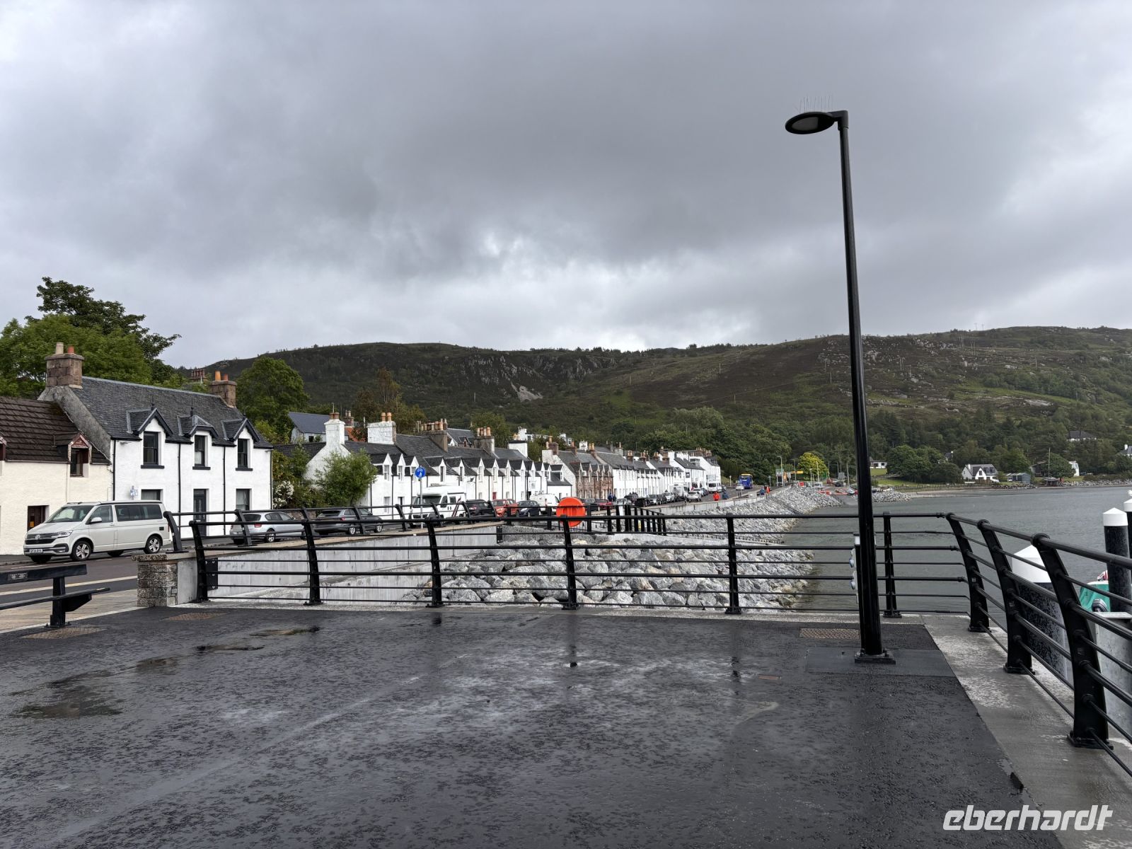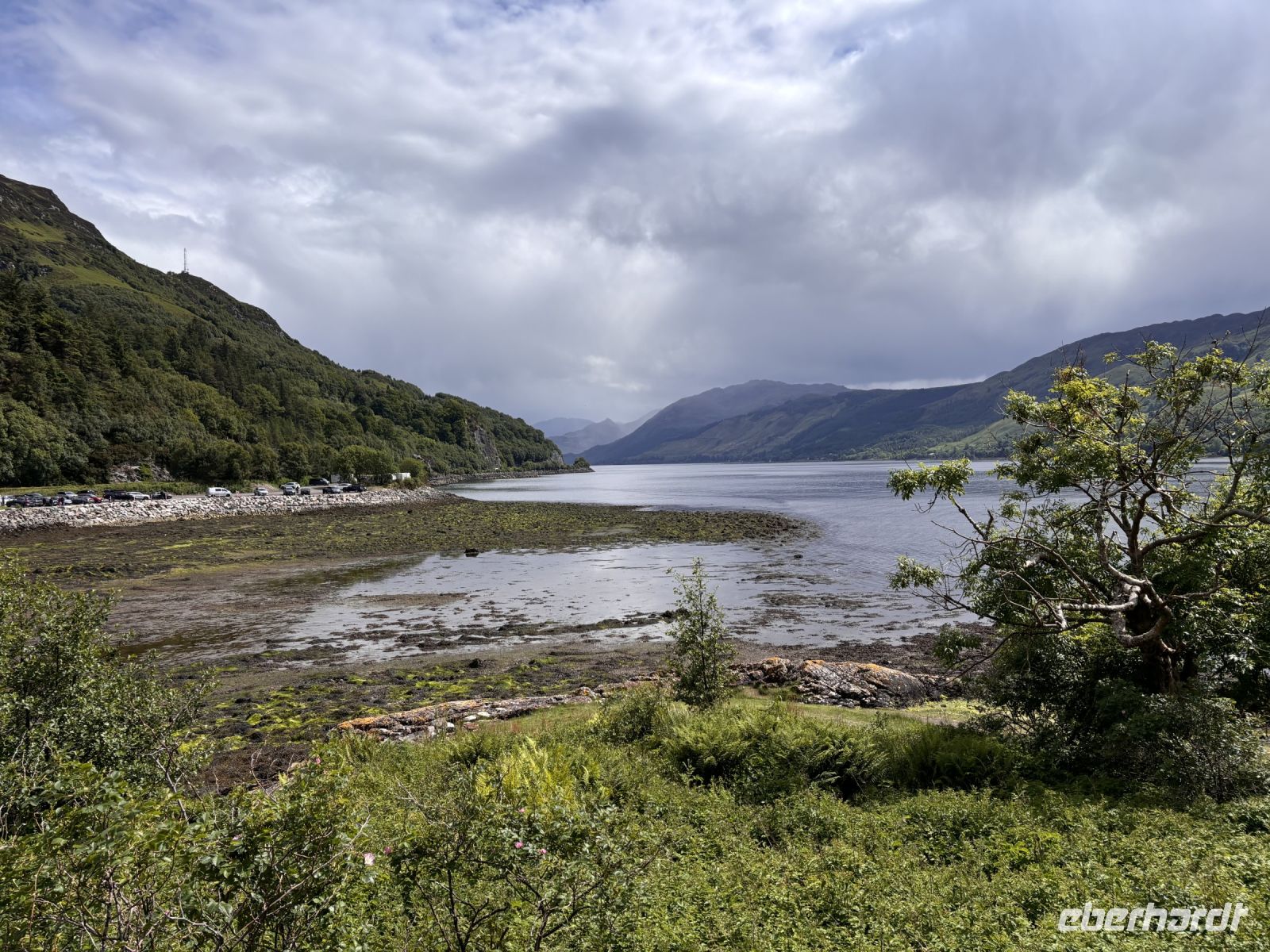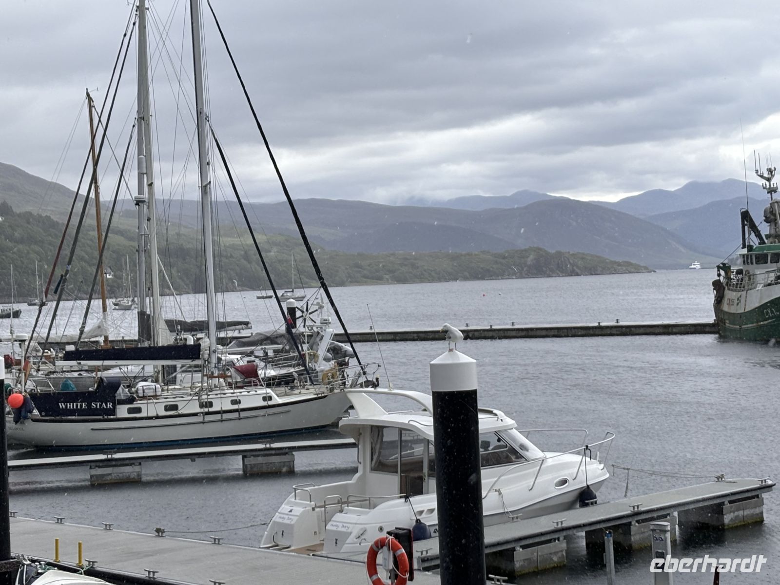 Heute machen wir uns auf den Weg über die „Route of the Isles“, weniger poetisch als A830 bekannt, bis zum 70 km entfernten Mallaig. Unser erster Stopp ist am Neptune’s Staircase, der 8-stufigen Schleusentreppe aus den Anfängen des 19. Jahrhunderts des britischen Baumeisters Thomas Telford. Hier erfahren wir mehr über den Bau des Caledonian Canal und dessen Bedeutung. Auch die Erklärung, warum diese natürliche Verwerfung im Gelände entstanden ist, ist sehr spannend. Noch ein paar Fotos und weiter zum Glenfinnan-Monument und dem Harry Potter Viadukt. Der Himmel ist mit tiefen dunklen Wolken verhangen und das blaue Auto von Harry ist nicht zu sehen. Leider fährt der Jakobiten-Zug nicht, denn die Lizenz für den Sonderzug liegt noch immer nicht vor. Mh, schade, aber hinter den Bäumen ragt das Viadukt hervor, besticht durch seine Lage im „Fjord“ zum Loch Shiel. Unterwegs noch ein Fotostopp am Prince’s Crain. Am Hafen von Mallaig angekommen, fragen wir erst einmal nach den aktuellen Fährzeiten und entschließen uns noch eine kleine Stadtbesichtigung zu unternehmen. Es gibt hübsche Geschäfte und einige Gäste tauschen noch alte Pfundnoten in der Bank of Scotland. Mittags kommt die Fähre von Mallaig nach Armadale auf die Insel Skye an. Wir nehmen den Weg am Loch Hourn entlang, bis es dann durch das Landesinnere nach Broadford geht. Wir erledigen ein paar Einkäufe im Supermarkt und fahren dann über die Skyebridge zum Kyle of Lochalsh bis Dornie, wo das wunderschöne Eilean Donan Castle auf dem Inselchen in der Bucht von drei „Löchern“;) residiert. Das nehmen wir erst einmal genau unter die Lupe. Streng beäugt vom Sicherheitspersonal an der Brücke, laufen wir zum Castle herüber. Hier hat man sich so viel Mühe gegeben, dem gar nicht so alten Gemäuer, Leben einzuhauchen. Wir sind begeistert. Nachdem wir im Hotel eingecheckt hatten, trafen wir uns in der Lobby, um die Gegend zu erkunden, natürlich nur wer Lust dazu hatte, auf eine kleine Wanderung zum Castle Moil am Loch Alsh. Belohnt wurden wir mit tollen Ausblicken auf die Skyebridge und die wunderschöne Bucht mit dem alten Wrack. Nun hatten wir uns das Abendessen wirklich verdient.