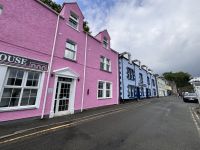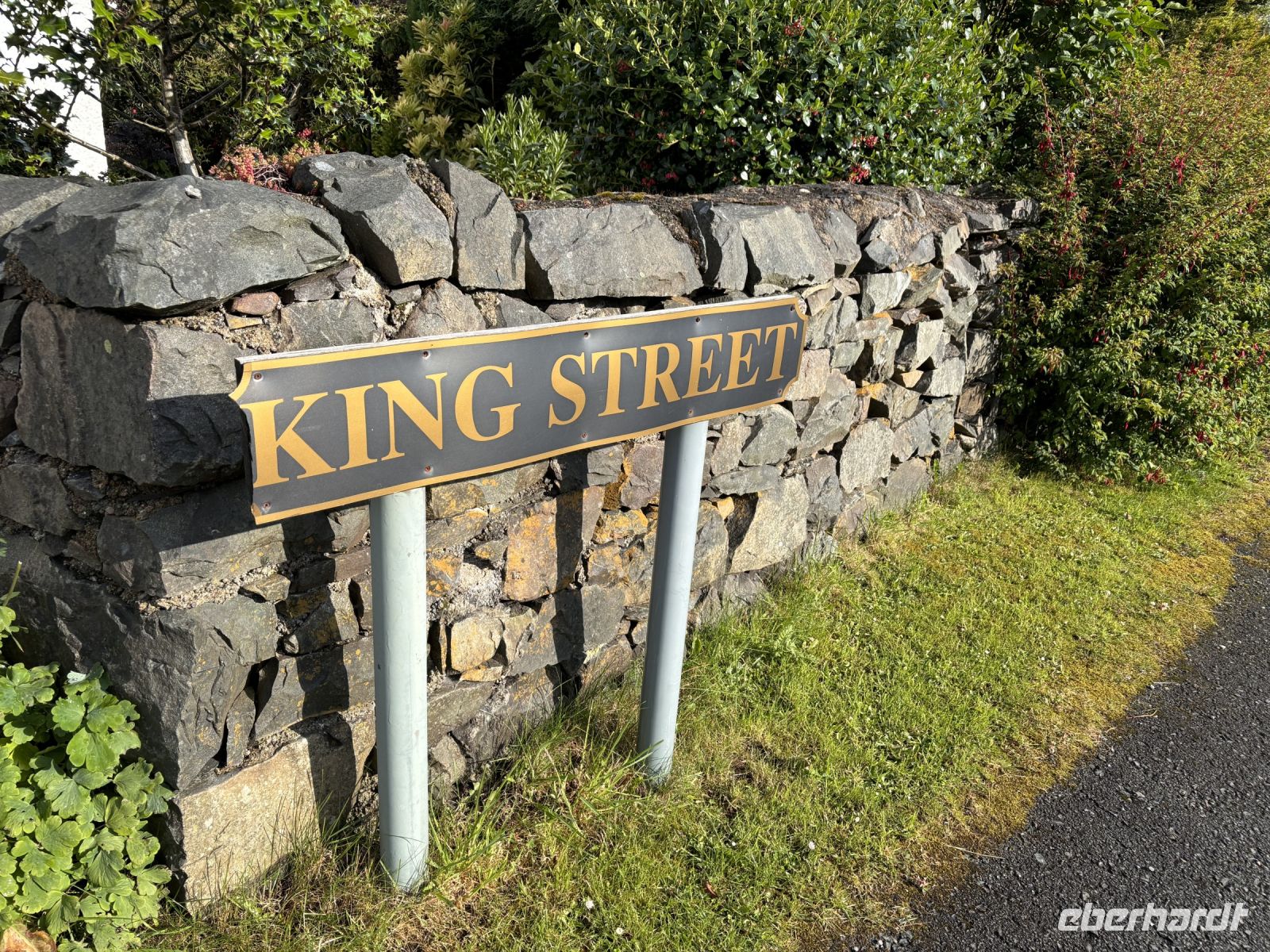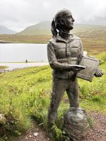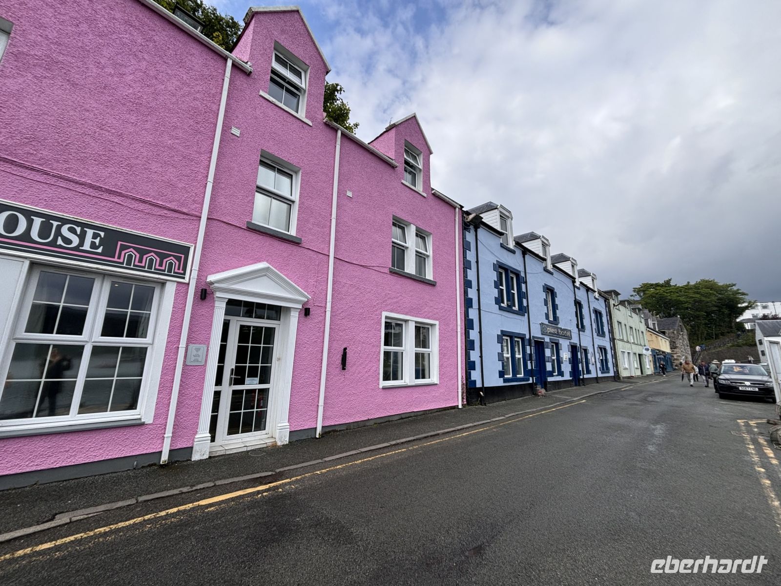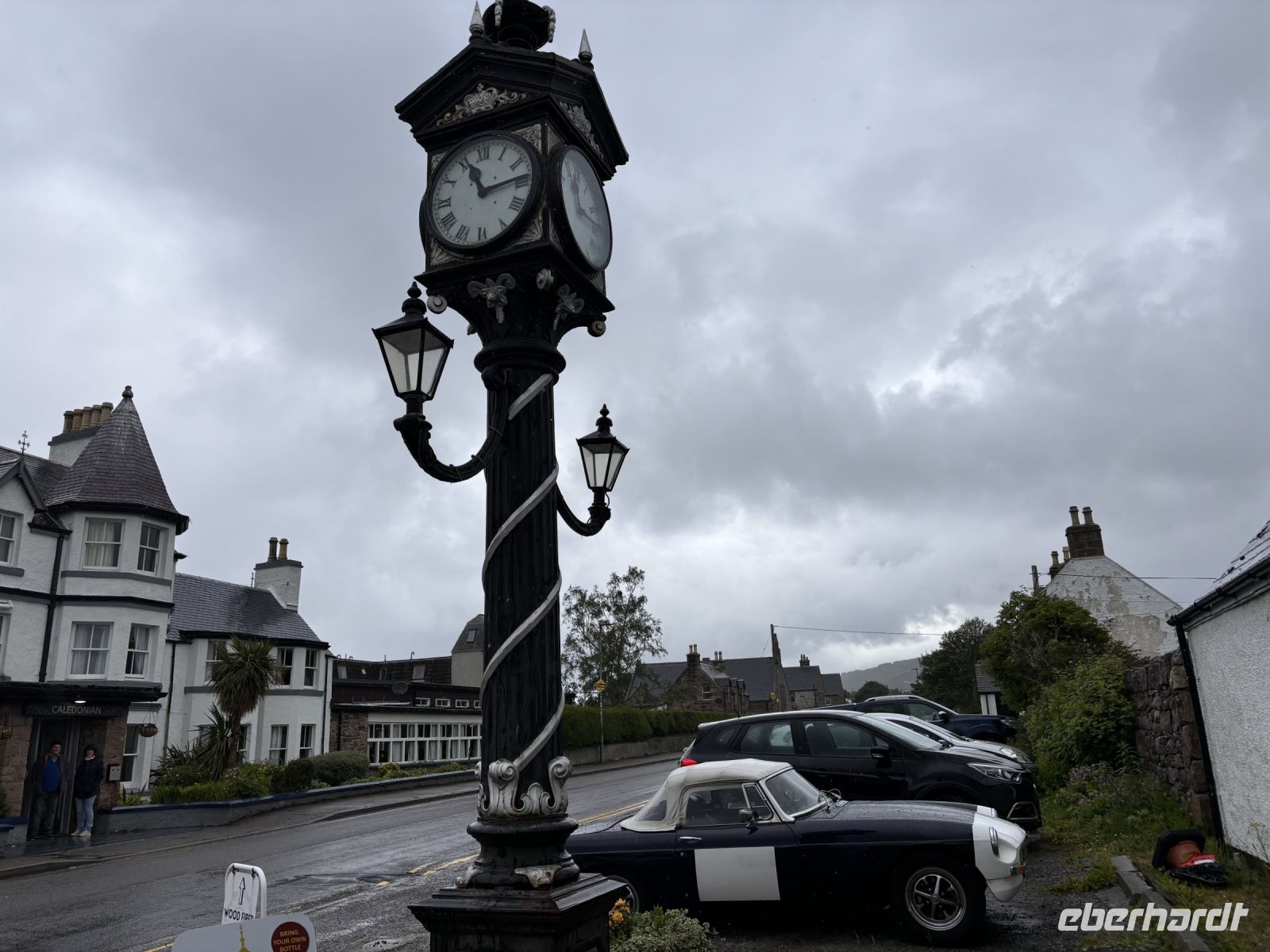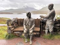 Heute wollen wir die Trotternish Halbinsel auf Skye erkunden und nach Harris und Lewis übersetzen. Wir reisen nach einem sehr belebten Frühstück am Morgen im Hotel ab. Und fahren erst einmal eine Tankstelle an, damit uns der Sprit unterwegs nicht ausgeht. Kaum wieder auf der Straße unterwegs, halten wir bereits an der Sligeachan Bridge, um uns die malerische alte Brücke, ebenfalls von Thomas Telford erdacht, anzusehen. Hier finden wir auch die Statur der „Heros of the hills“, Prof. Norman Collie und sein Freund John Mackenzie schauen verträumt auf die Cuillin Mountains. Vorbei an Wasserfällen treffen wir in der Stadt Portree ein. Wunderschön kleben die kleinen bunten Häuser in der Bucht des Hafens am Felsen. Restaurants, Shops und Wohnhäuser drängen sich in der Inselhauptstadt an den engen Straßen. Beschaulich wirkt der Ort, beliebt bei den Touristen, sind wir leider viel zu kurz vor Ort, um tiefer in die Szene einzutauchen. Immer entlang der A855 passieren wir den Old Man of Storr, die Felsformation ist im Grau der Wolken und im Hintergrund der Black Cuillins kaum auszumachen. Wir steuern die Lealt Falls und den Kilt Rock an. Es regnet, schnell ein Foto gemacht und wieder in den Bus, um zur Fähre nach Uig zu gelangen. 90 Minuten genießen wir die Überfahrt nach Tarbet auf der Isle of Harris, bis es wieder in den Bus steigen. Im Regen geht es über die Berge der Insel auf der Lewis Seite zum Hauptort Stornoway. Gut, dass es aufhörte zu regnen, um dann über den Golfplatz zum Lews Castle zu wandern. Die Aussicht auf den Fischerhafen der Stadt mit seiner spannenden Geschichte über die „Herings-Frauen“ ist bedauerlicherweise wieder im Regen. Aber wir nehmen es gelassen, denn wir wissen doch, in Schottland wartet man einen Moment und schon ändert sich das Wetter! Den Abend lassen die Gäste nach dem Dinner in der Bar ausklingen.