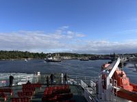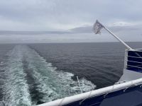 Den ersten Tag verbringen wir damit, in aller Herrgottsfrühe, unsere sorgfältig ausgewählten Habseligkeiten und uns selbst zur richtigen Zeit am verabredeten Ort einzufinden, um in den sehr bequemen und gut ausgestatteten Bus einzusteigen. Wir sind erst einmal noch müde und Ruhe herrscht im Bus, bis die Sonne aufgeht und wir von Ost nach West durch die Mitte Deutschlands in Richtung Fährhafen Amsterdam IJmuiden, Niederlande rollen. Der Bus füllt sich langsam. Erstes Kennenlernen in den Pausen und nette Gespräche mit Kaffee aus der Bordküche lässt den neu gegründeten Clan „MacBee“ zusammenwachsen. Diesen Namen hat uns die Reiseleiterin Sabine gegeben, Bine = bee in der englischen Sprache und natürlich das Mac (Kinder von ...) für die Clan-Bezeichnung. Am Nachmittag treffen wir im Fährhafen bei Amsterdam ein. Unkompliziert beziehen wir die Kabinen und treffen uns zum Abendessen. Nach dem anstrengenden Tag freuen wir uns über die Köstlichkeiten vom Buffet und ein leckeres Getränk. Das Meer wiegt uns später in den wohlverdienten Schlaf.