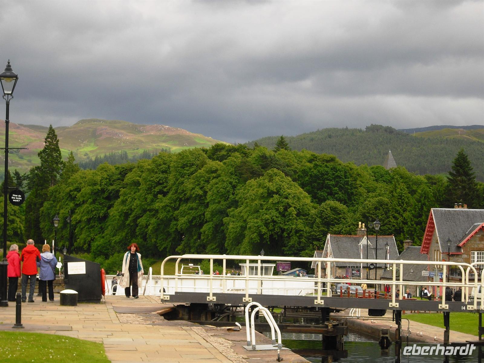 Der folgende Tag begann nach dem Frühstück mit dem Besuch von Fort George, einer Artilleriefestung und Kaserne der Engländer in den schottischen Highlands. Anschließend fuhren wir nach Drumnadrochit, um Nessie auf die Schliche zu kommen. Das Monster soll im 230 m tiefen Loch Ness existieren. Na, wer es glaubt …. Auch vom Schiff aus war auf dem Weg nach Urquhart Castle nichts davon zu entdecken. Höchst interessant war es, die Schleusung von Schiffen in Fort Augustus zu beobachten. Diese Schleusen gehören zu dem im Jahr 1822 fertiggestellten, 96 km langen Kaledonischen Kanal, der von Thomas Telford entworfen wurde. Mit einem Versuch, den höchsten Berg Schottlands , den Ben Nevis, zu entdecken, klang der Tag aus. Der Berg versteckte sich in den Wolken. Nach der Hotelankunft gab es wieder ein leckeres Abendessen und einige saßen noch gemütlich zusammen. Der Koffer von Frau S. traf ein. Welch ein Aufatmen!