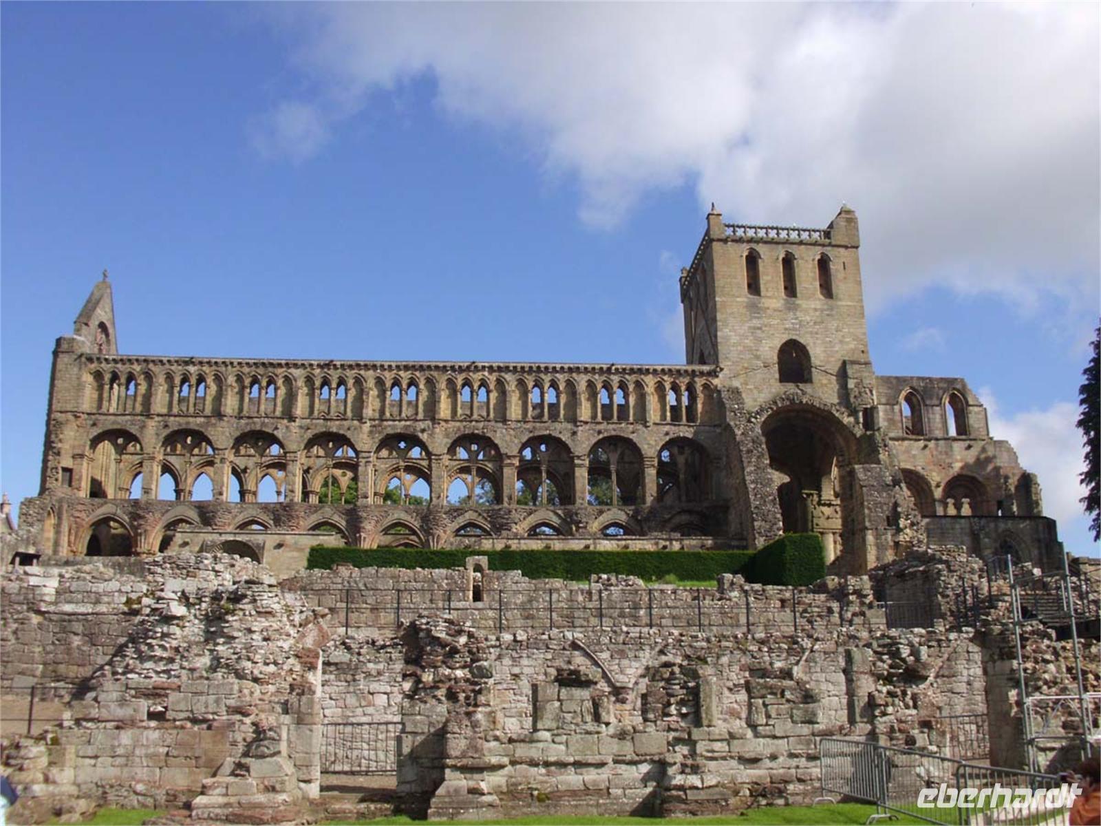 Nach dem Frühstück vom Buffet, verabschieden wir uns von den Flugreisegästen und setzen unsere Reise in Richtung Jedburgh fort. Wir besichtigen die uralte Abtei in Jedburg, die auch als Ruine noch einen gewaltigen Weindruck bei allen hinterlässt. Ausgegrabene Grundmauern der Klausur und Wirtschaftgebäuden an der Kirche sind hervorragend konserviert.