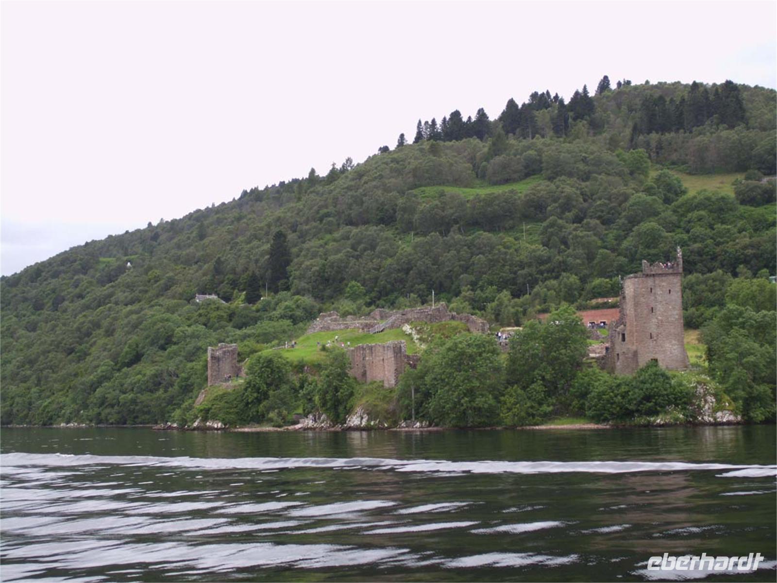 Ein Höhepunkt des Tages ist die Bootsfahrt über den Loch Ness. Das berühmte Ungeheuer bekommen wir aber nicht zu Gesicht. Tiefschwarz ist das Wasser weil es von den eingeschwemmten Huminstoffen der Hochmoore aus den umliegenden Bergen durchsetzt ist. Das Boot legt direkt am Urquhard Castle an, einer der größten Burgruinen des Landes. Mächtig blickt es uns von Land schon auf dem Boot an.