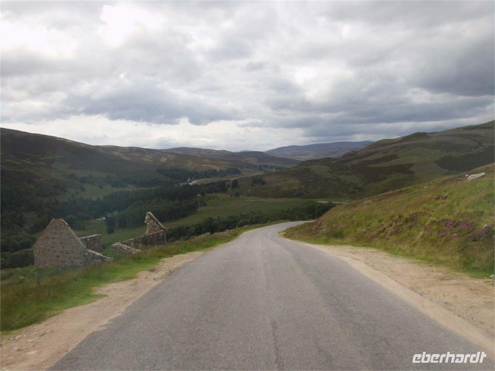 Die Reise führt uns weiter durch den Cairngom Nationalpark und die Grampian Mountains. Die wilde fast baumlose Landschaft bekommt durch zu blühen anfangende Heide die erste lila Farbtupfer. Auf z. T. engen Strassen geht es kurvig steil bergauf und bergab. Strauchheide ist das dominierende Gewächs.