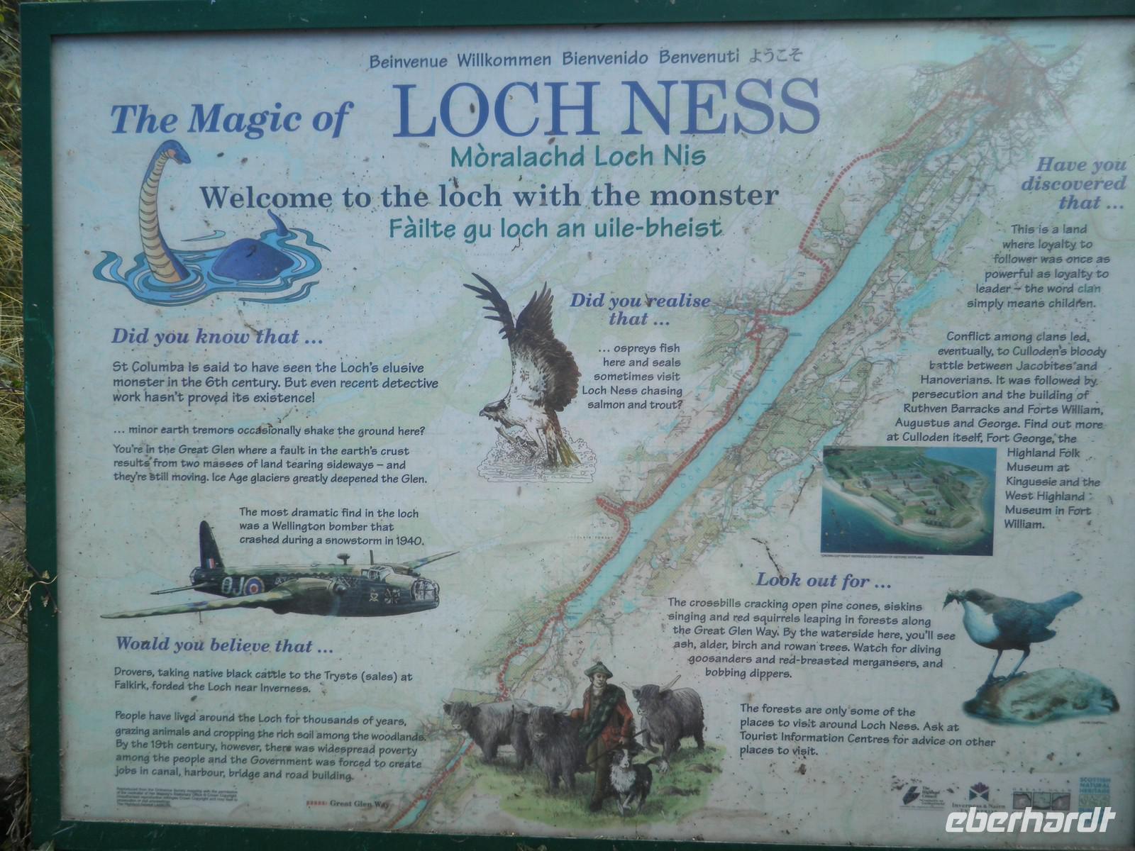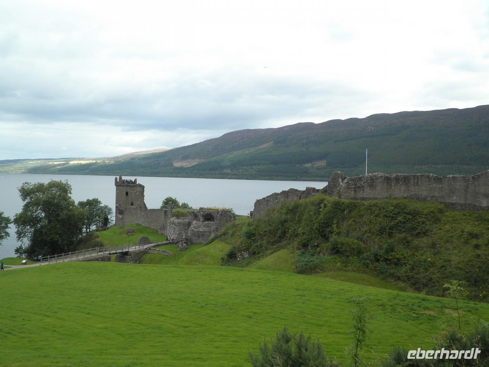 Durch Inverness führte uns nun unser Weg in Richtung Loch Ness, dem See des berühmten Monsters Nessie. Am Clansmen Hotel am Westufer des Sees bestiegen wir ein Schiff der „Jacobite Cruises" und fuhren eine halbe Stunde über den See bei recht gutem Wetter, die Sonne entdeckte uns hin und wieder. Trotz genauester Beobachtung der Wasseroberfläche hatte wohl niemand aus unserer Gruppe das Glück, Nessie tatsächlich zu entdecken. Wir legten an am Urquhart Castle, der Ruine einer alten Festung. Zwischen den Ruinen kann man umherspazieren, von hier aus genießt man einen herrlichen Blick über Loch Ness. Im Besucherzentrum wird ein Film über die Geschichte von Urquhart Castle gezeigt.