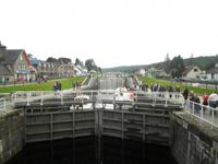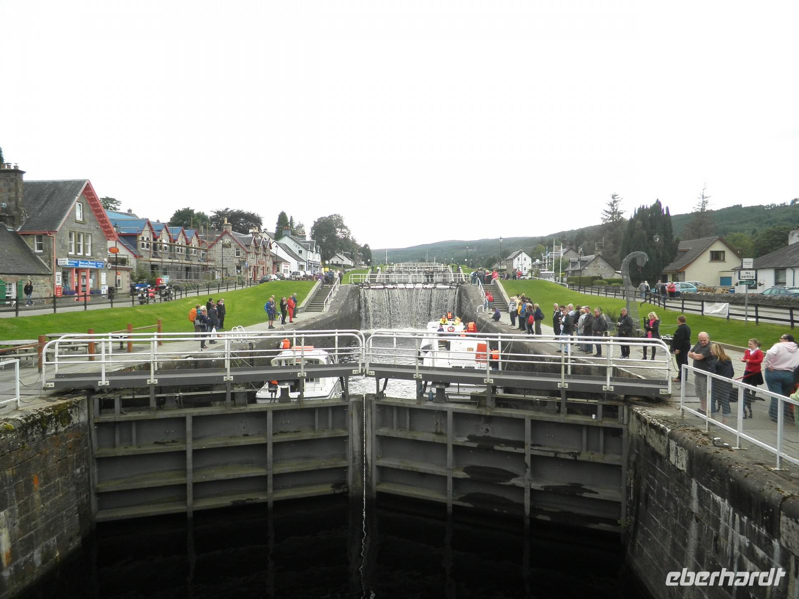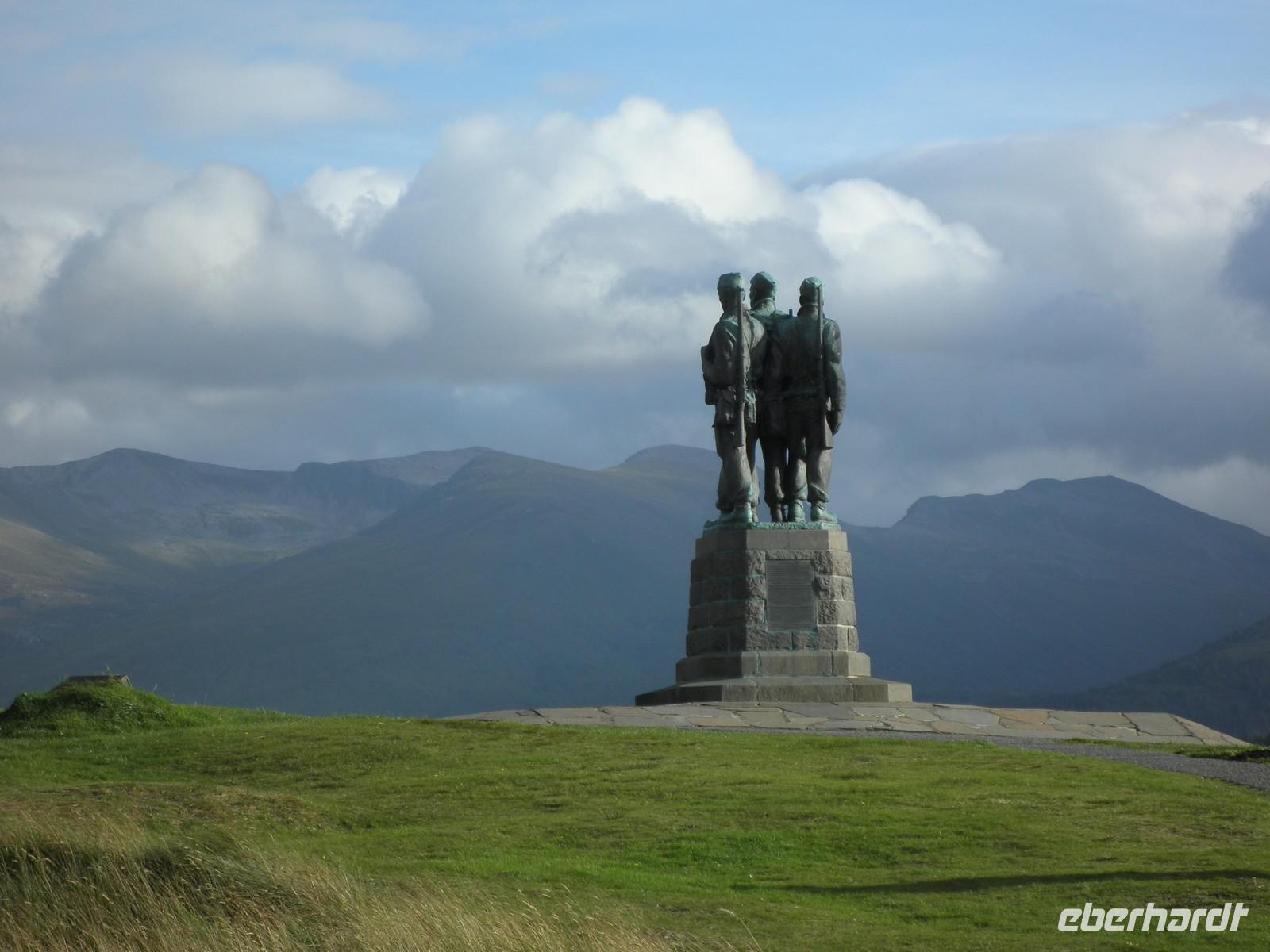 Danach ging's nach Fort Augustus an der Südspitze von Loch Ness. Hier bestaunten wir den berühmten Caledonian Canal, ein Bauwerk des legendären Baumeisters Thomas Telford. In Fort Augustus gibt es mehrere Staustufen. Während unseres Aufenthaltes konnten wir beobachten, wie mehrere Boot in den Schleusen warteten, um nach oben zu gelangen. In Spean Bridge am Commando Memorial hielten wir an und fotografierten das Denkmal und die herrliche Landschaft, die von dieser Anhöhe gut zu überblicken ist. Das Commando Memorial wurde errichtet zum Gedenken an die Soldaten, die hier ausgebildet worden waren und während des zweiten Weltkriegs gefallen sind. Es gibt eine weitere Gedenkstätte dort für später Gefallene, Fotos und Tafeln auch für junge Männer, die in den letzten Jahren in Afghanistan ihr Leben verloren haben.