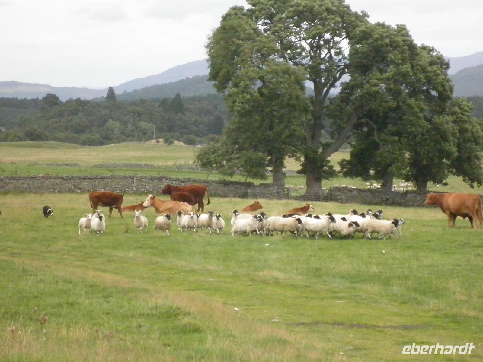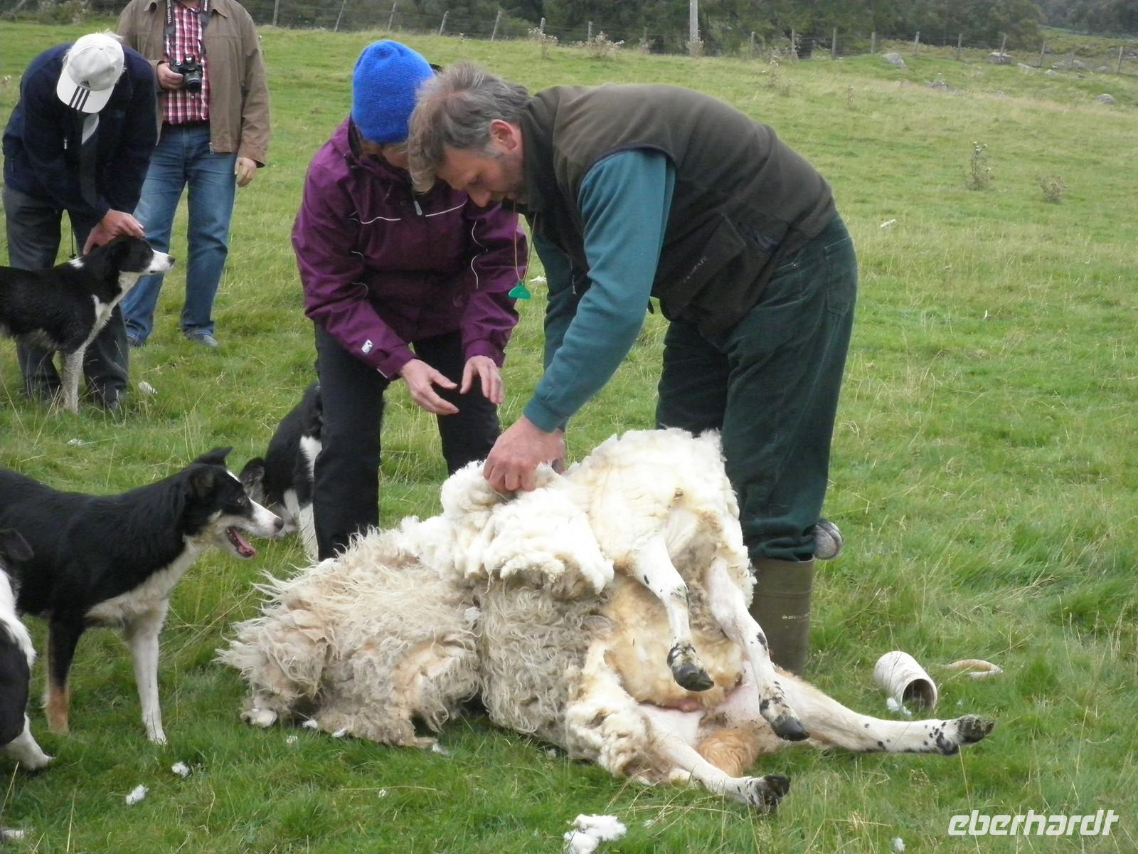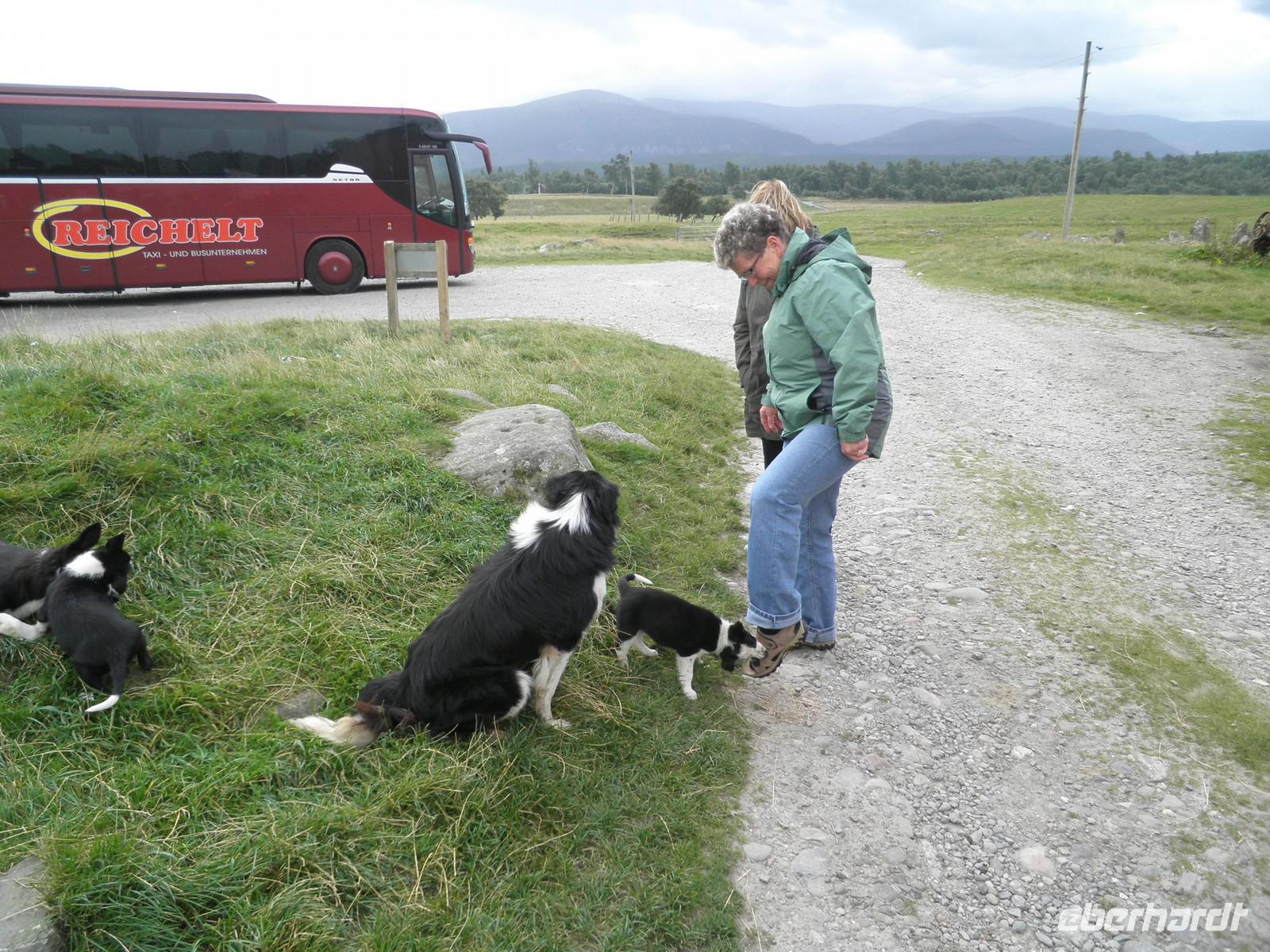 Dieser Tag hatte für alle etwas zu bieten: Tiere, beeindruckende Landschaft und Alkohol. Zunächst besuchten wir die Schaffarm in Kincraig, auf der uns die Arbeit mit den Hütehunden vorgeführt wurde. Besondere Freude bereiteten unseren Gästen die Lämmer, die sie selbst mit der Flasche füttern konnten, und ein paar kleine junge Hunde, die gern von uns Besuchern auf den Arm genommen werden wollten.