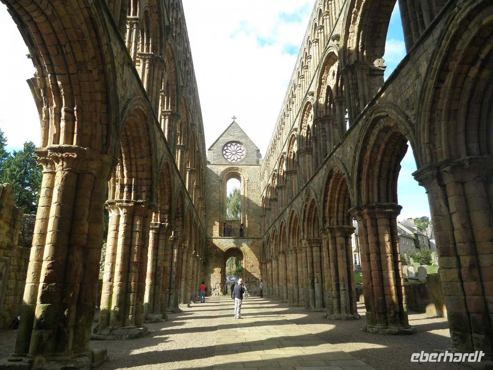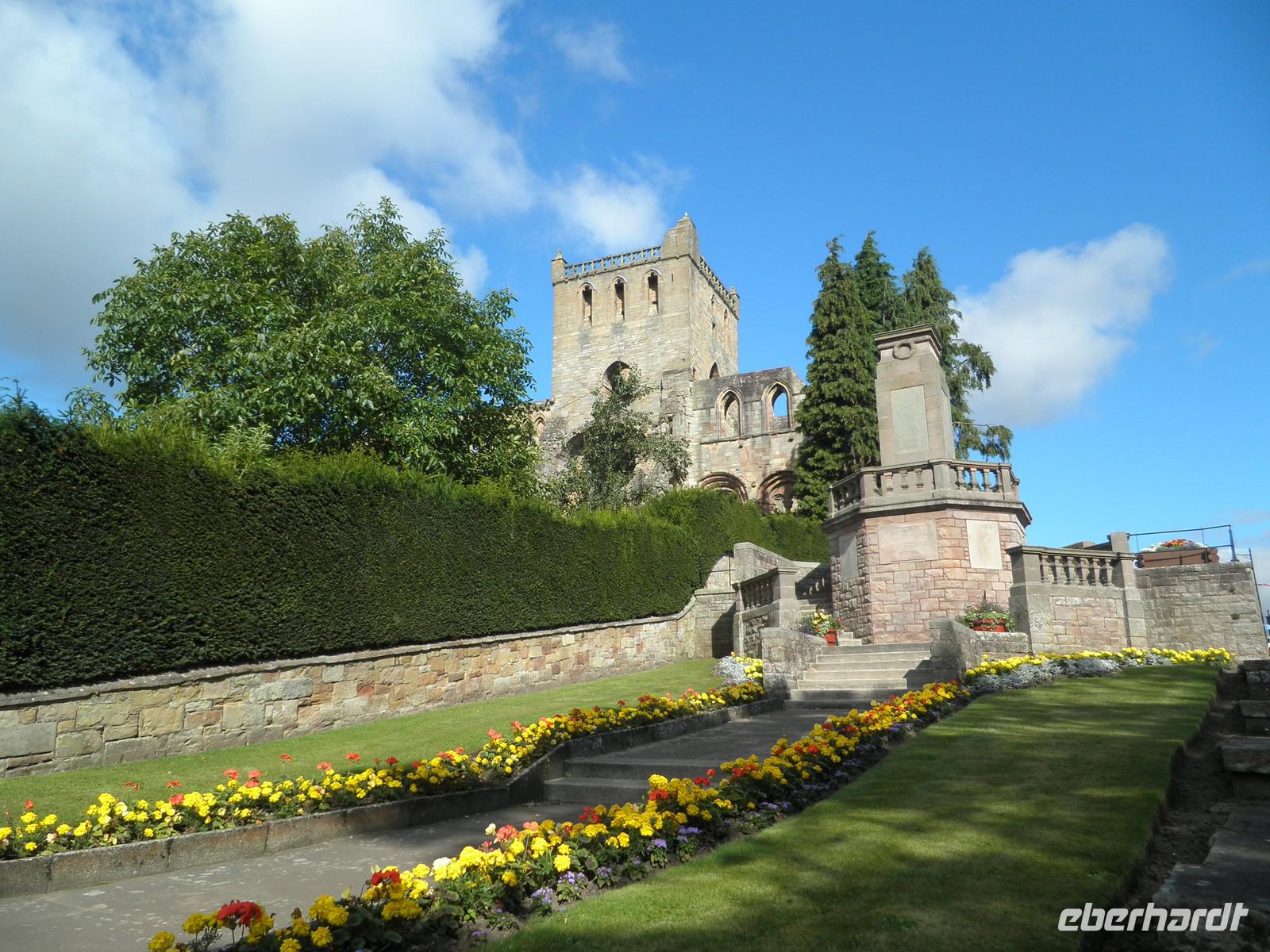 Alle anderen Gäste fuhren mit dem Bus in Richtung Süden, heute sollten wir Schottland schon wieder verlassen. In Jedburgh besichtigten wir eine zum großen Teil zerstörte Abbey, ein ehemaliges Kloster, das früher eine wichtige Rolle in der Stadt und der Gegend gespielt hat. Heute ist es ein interessanter Ort zum Verweilen und im Audioguide den alten Geschichten über das Leben der Mönche hier zu lauschen.