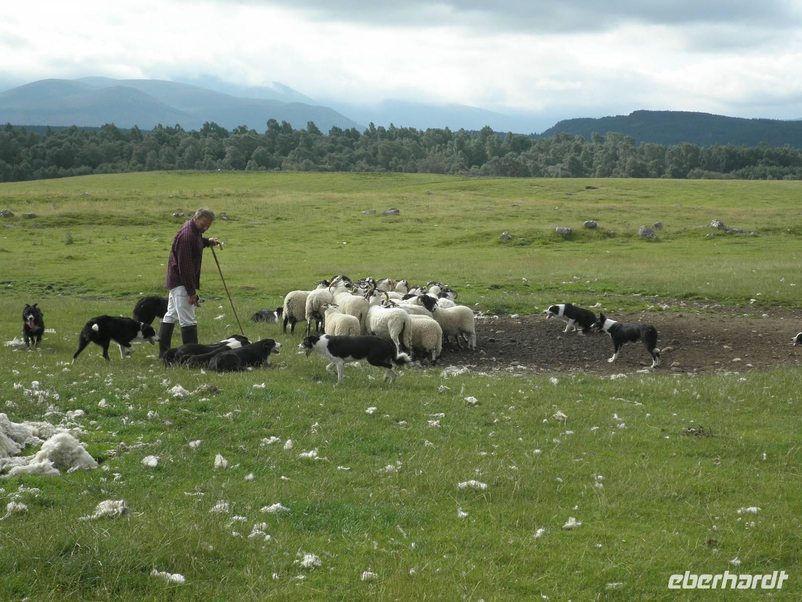 Dieser Tag hatte für alle etwas zu bieten: Tiere, beeindruckende Landschaft und Whisky. Zunächst besuchten wir die Schaffarm in Kincraig, auf der uns Neil Ross die Arbeit mit den Hütehunden vorführte. Besondere Freude bereiteten unseren Gästen die Lämmer, die sie selbst mit der Flasche füttern konnten, und ein paar kleine junge Hunde, die gern von uns Besuchern auf den Arm genommen werden wollten.