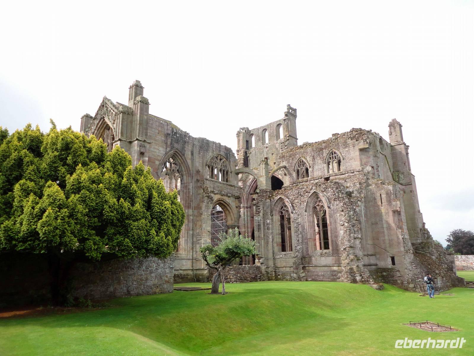 Auf die anmutigen Borders freuten wir uns, wir hatten sie ja auf der Hinreise bereits gestreift: Melrose zeigte sich uns noch von der trockenen Seite und wir bewunderten die noch als Ruine mächtige Abtei.