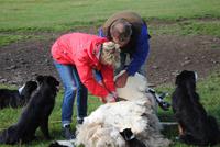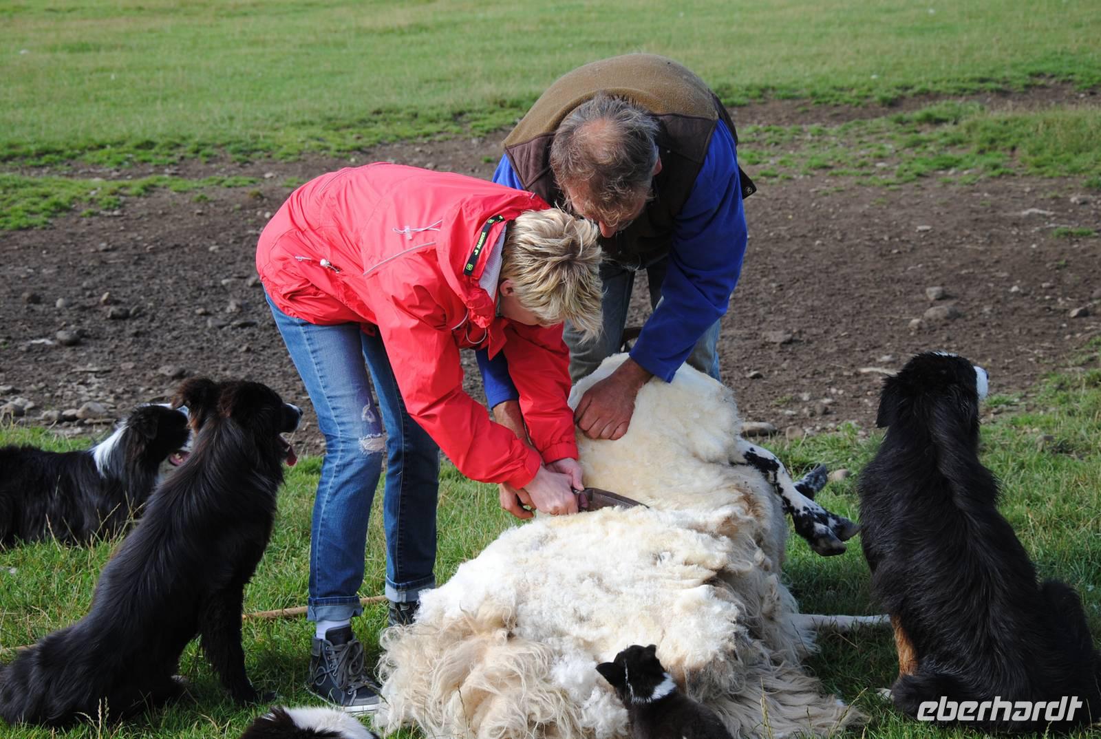 Nachts hatte es heftig geregnet und auch am Morgen war nicht klar, ob es beim Schäfer trockenen Fußes weiter geht. Glücklicherweise riss der Himmel auf und es war wunderschön, dem Schäfer bei seiner Aktion mit Hunden und Schafen zuzusehen: Schafe liefen Slalom, jeder Hund saß exakt auf seiner Position oder versuchte es zumindest, wenn er noch klein war. Den Welpen galt unser Herz, wir konnten sie nach Herzenslust streicheln und dann schoren wir Schafe und gaben Lämmern die Flasche. Peter ließ uns beim Einsteigen über 4 Abtreter laufen, dafür roch es dann im Bus normal ;-)