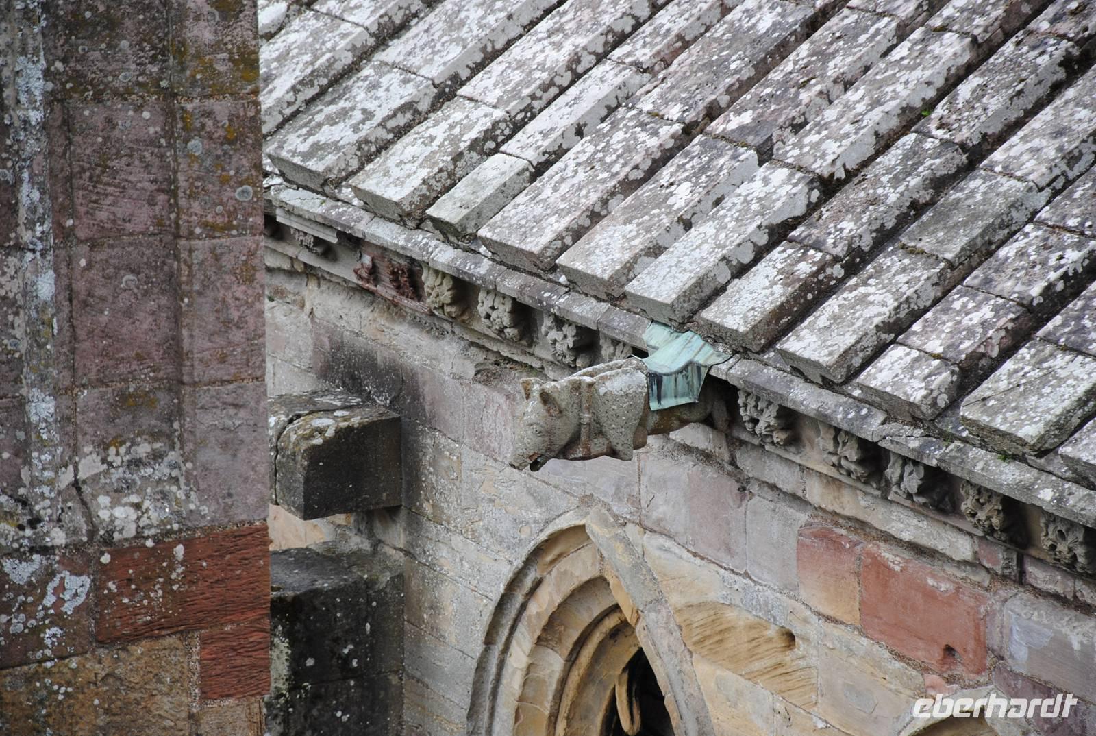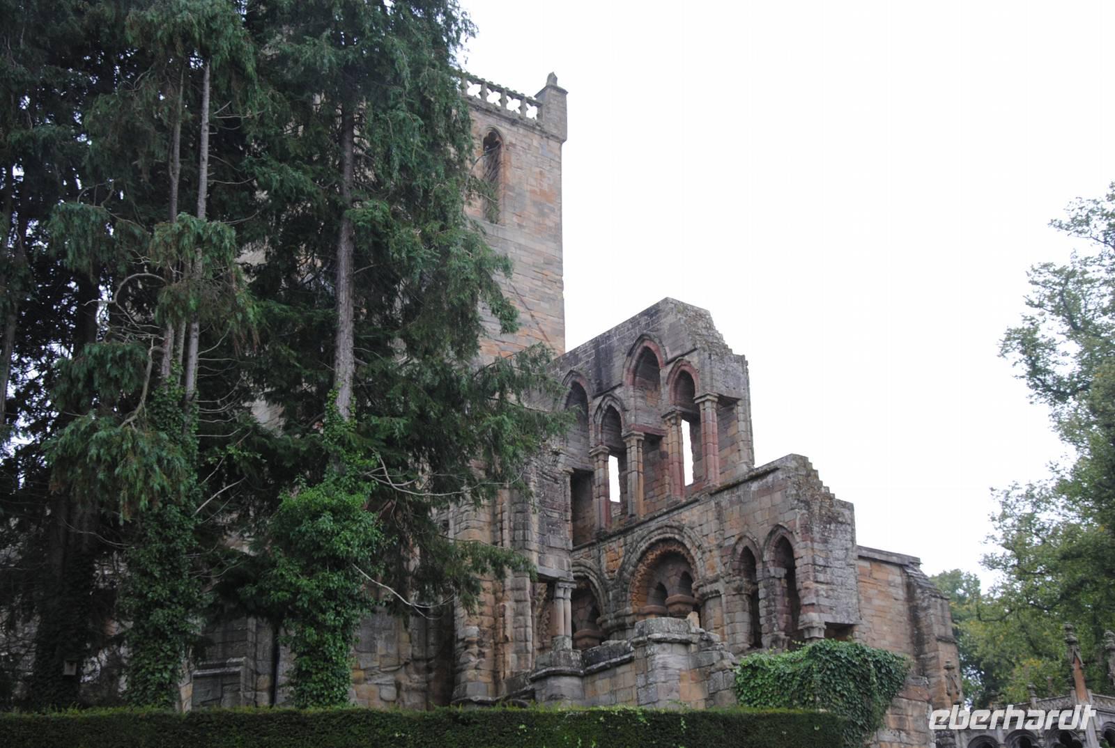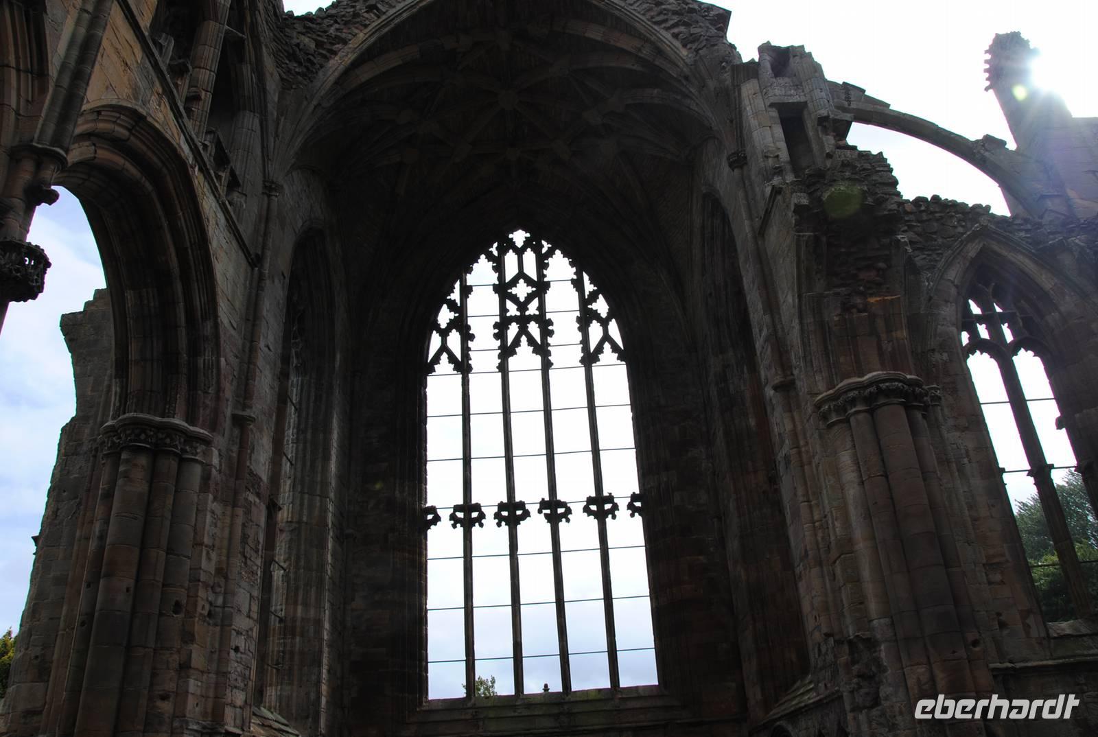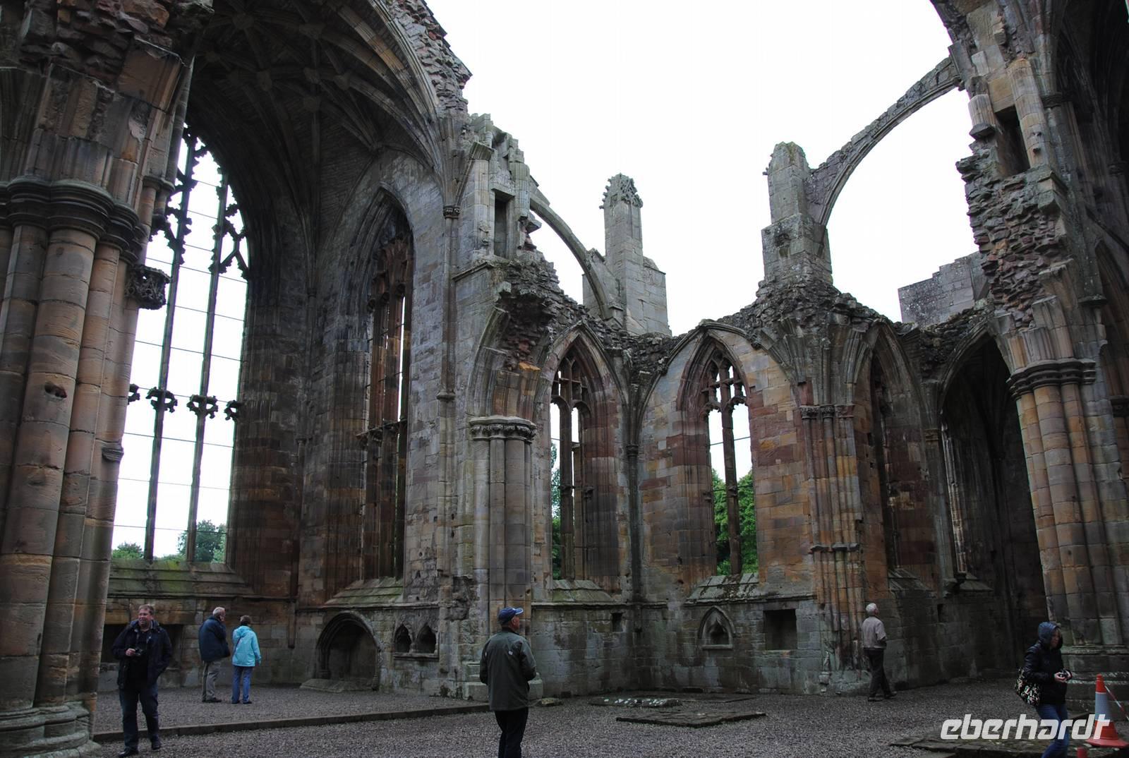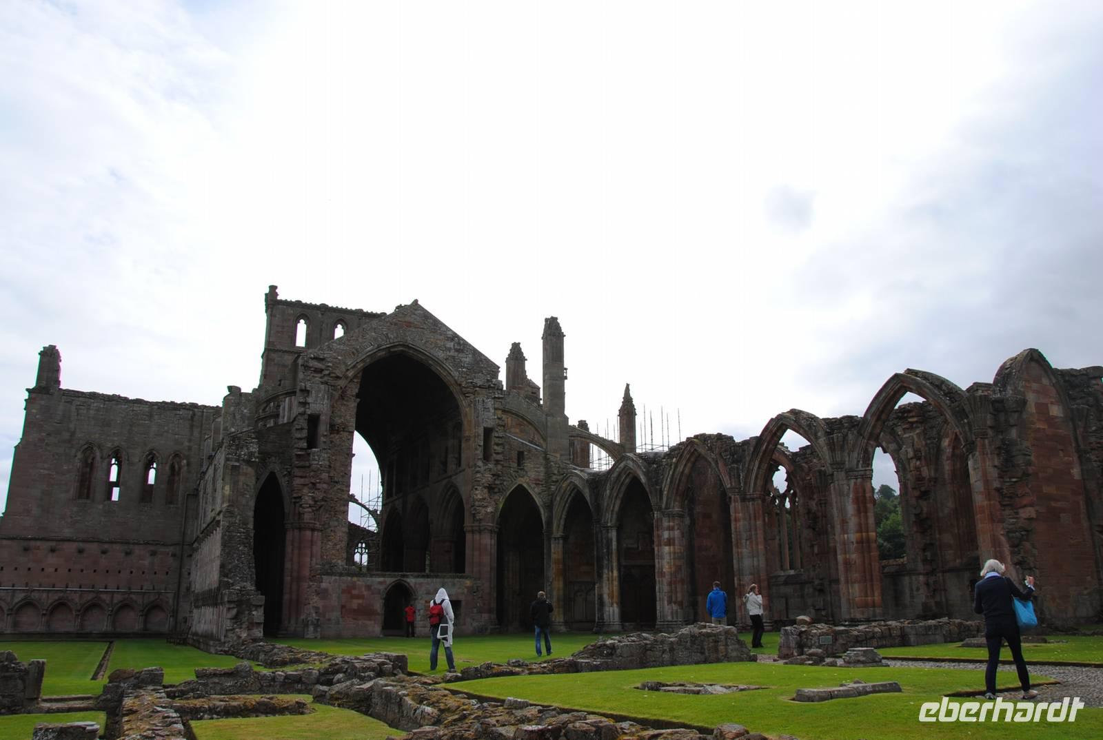 Auf die anmutigen Borders freuten wir uns, wir hatten sie ja auf der Hinreise bereits gestreift: Melrose zeigte sich uns noch von der trockenen Seite und wir bewunderten die noch als Ruine mächtige Abtei. Wir suchten im Rahmen eines Gewinnspiels die Begräbnisstelle für das Herz von Robert the Bruce und den Wasserspeier des Dudelsack spielenden Schweins.