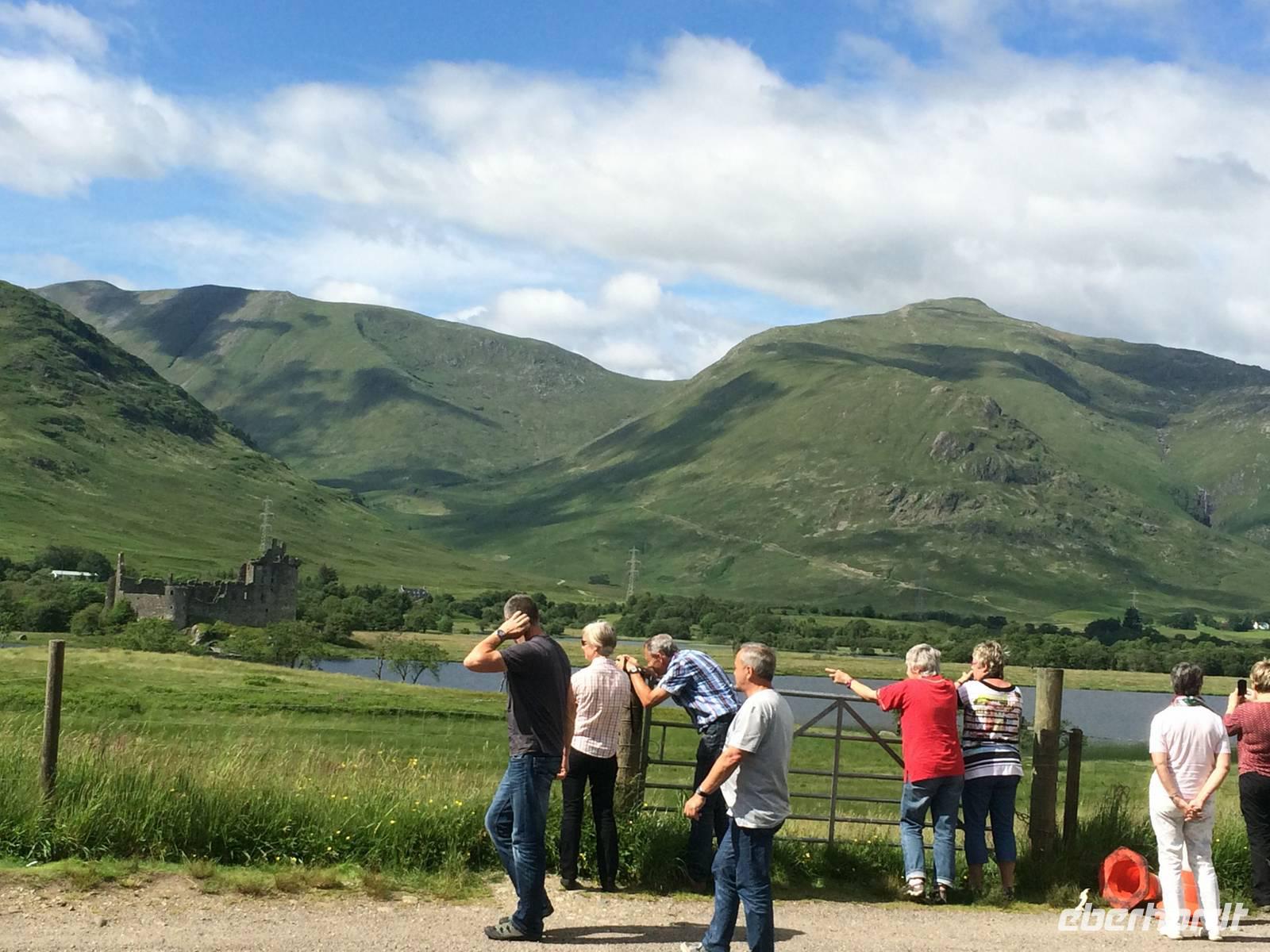 Wir hatten Glück und konnten kleine Schiffe bei der Fahrt durch die Schleusen beobachten. Ich nutzte die Gelegenheit, um den Gästen echte schottische Erdbeeren von einem Bauern zu kaufen. Wir legten einen Zwischenstopp am Commando Memorial kurz vor Spean Bridge und hatten einen wunderbaren klaren Blick auf die Spitze von Ben Navis, den höchsten Berg Schottlands. Wie konnte es anders sein, wir hatten Sonne und die Wolken wollten uns den Blick auf Ben Navis nicht vermiesen! Nach so viel Erlebnisse freuten sich alle auf das urige Hotel und auf das schmackhafte Abendessen.