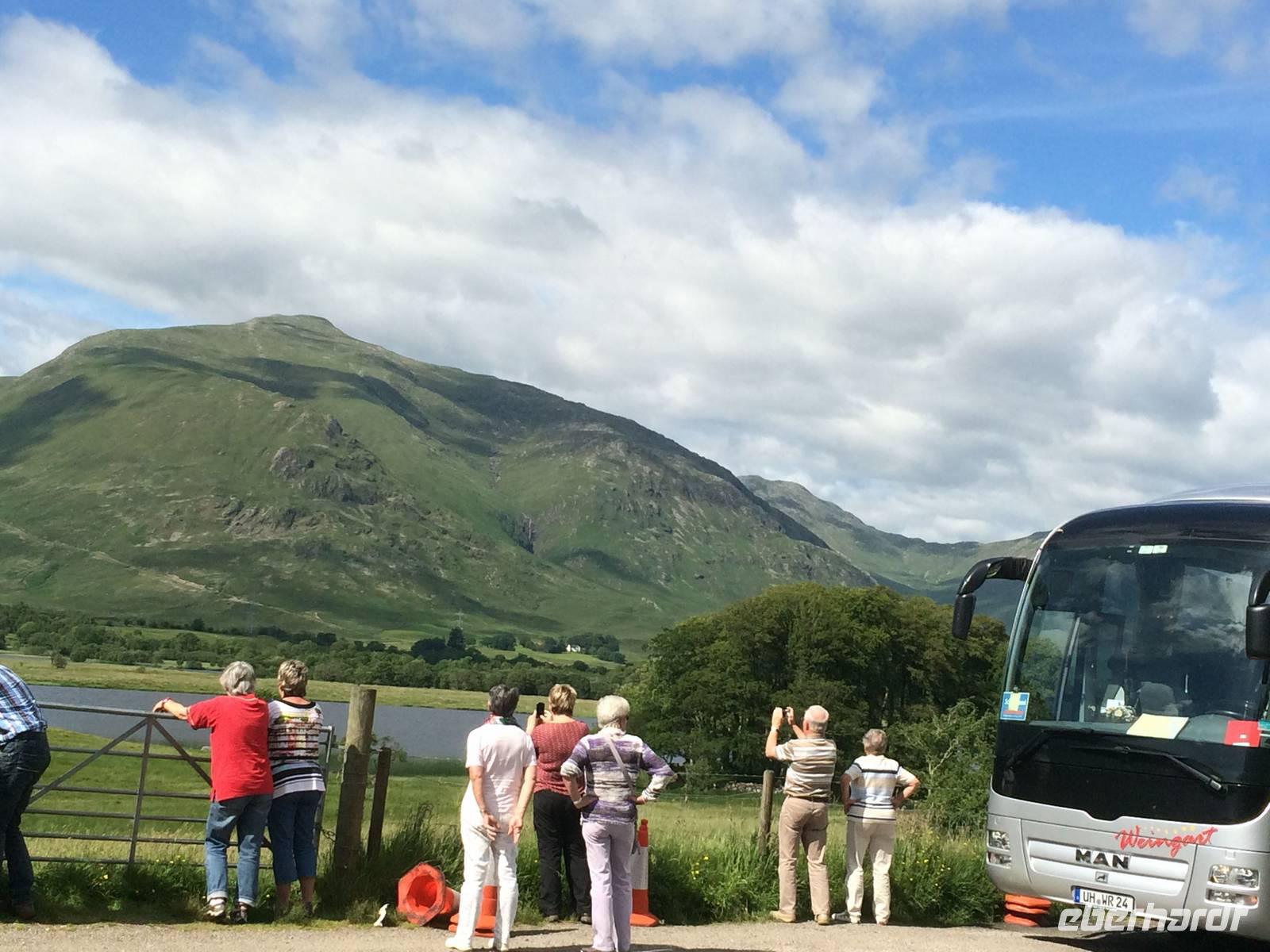 Nach einem guten Frühstück vom Büffet sind wir mit unserem Bus Richtung Loch Lomond, dem größten Binnensee Schottlands. Bei bestem Sonnenwetter haben wir in Tarbert, eine Ortschaft im Norden von Loch Lomond haben wir eine Pause eingelegt. Im Hintergrund des herrlichen Gewässers sah man die Berg- und Hügellandschaft der Trussachs. Weiterfahr durch eine herrliche Landschaft bei Sonnenschein Richtung Glen Coe. Einige Mailen vor Glen Coe haben wir an einem Parkplatz angehalten. Ich habe die Reisegäste zu einer kleinen Wanderung entlang eines kleinen Sees eingeladen. Alle waren begeistert und sind mitgelaufen. Der Bus sollte auf uns am nächsten Parkplatz warten. Nach einer wunderschönen Wanderung entlang des Sees, bei Sonnenschein und Temperaturen um die 25 Grad haben wir die Landschaft, die wunderbare Vegetation und die herrliche Natur genossen. Nach ca. 1 Stunde kamen wir am Bus an und wurden wir von einem kleinen Wasserfall im Hintergrund des Parkplatzes belohnt. Nach einem Gruppenfoto, sind wir zum Glen Coe Visitor Center gefahren. Nach einer Mittagspause mit dem berühmten Reiner 4-Gänge Menü Weiterfahrt Richtung Oban. Freizeit in Oban und die Möglichkeit zum Besuch der Nachbildung des Colosseums von Rom. Das Wetter war phantastisch, sonnig und warm. Weiterfahr Richtung Inveraray mit Fotostopp am Kilchurn Castle. Spaziergang in der Stadt und am schönen Strand. Rückfahrt nach Glasgow, nach dem Abendessen individuelle Zeitgestaltung bei dem warmen Wetter in Glasgow.