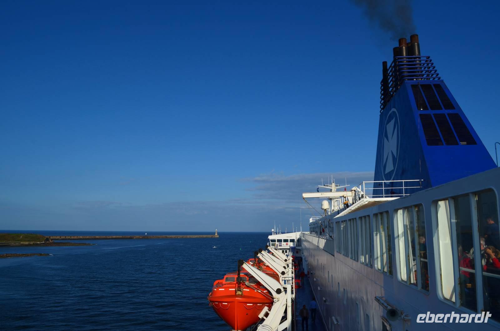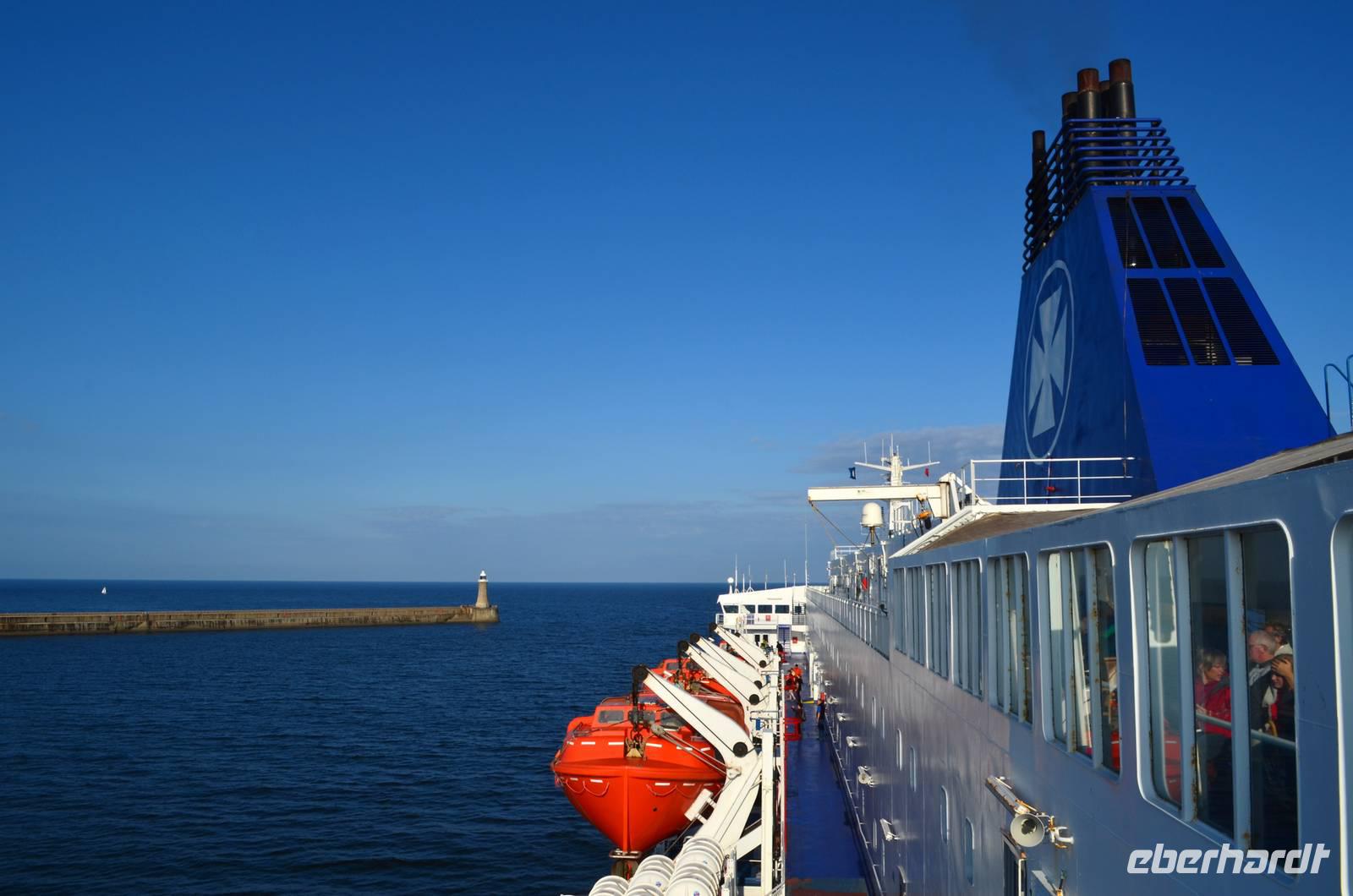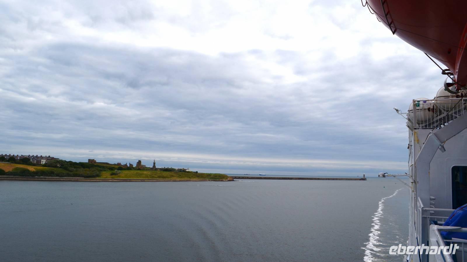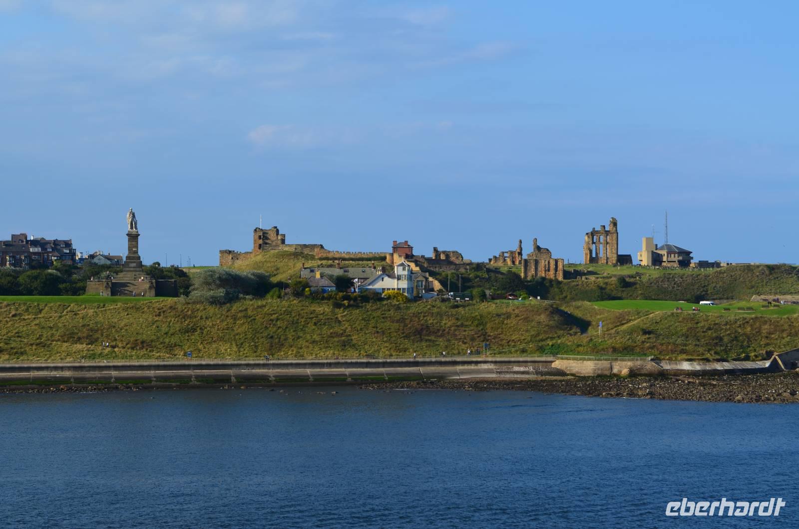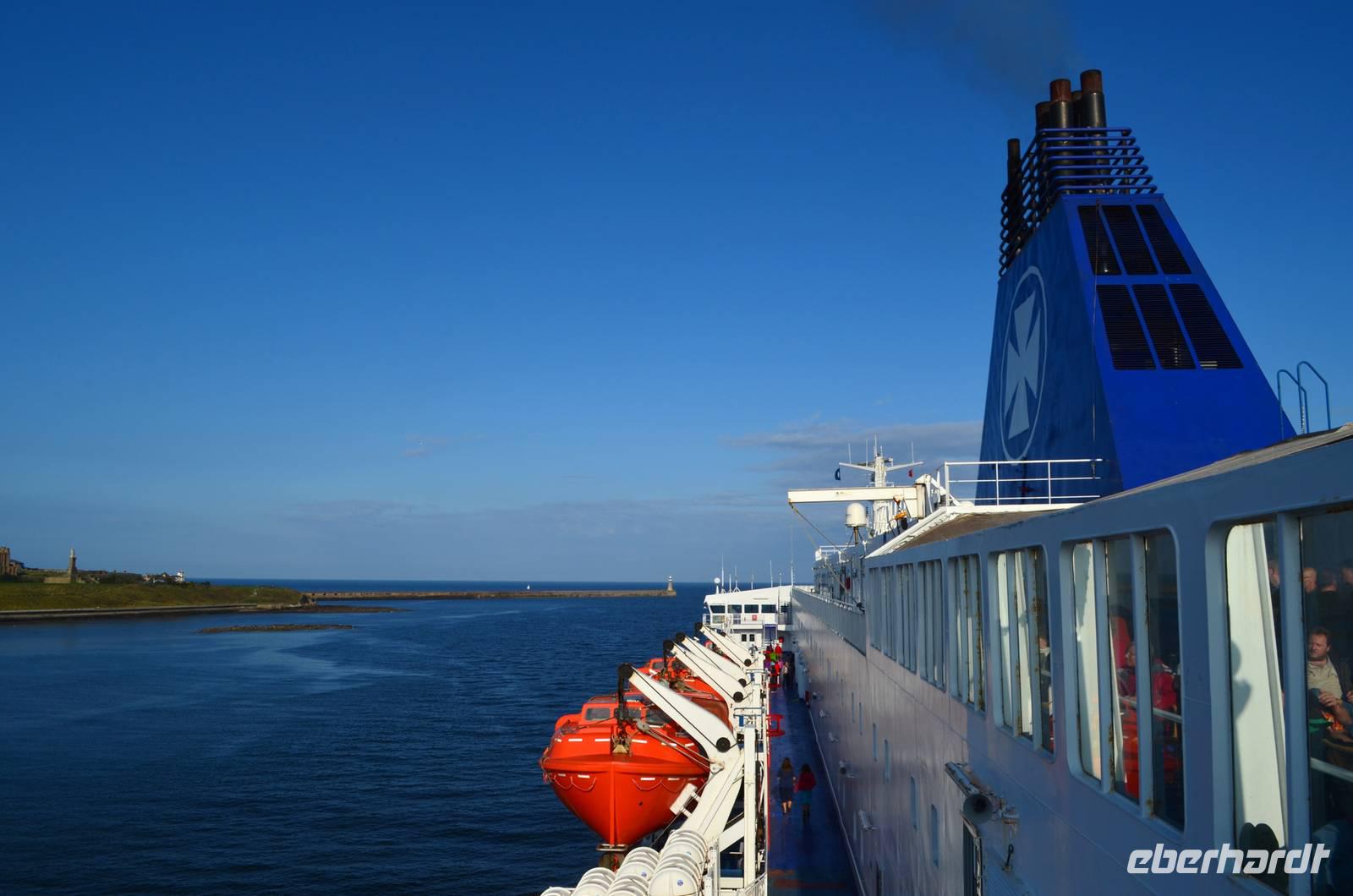 Ein leckeres Frühstück lässt den Tag mit Zufriedenheit beginnen. Wir erlebten die Einfahrt der Fähre in die Mündung des Tyne. Hoch oben auf dem Cliff grüßte das alte Castle und die Ruine des Klosters herüber.