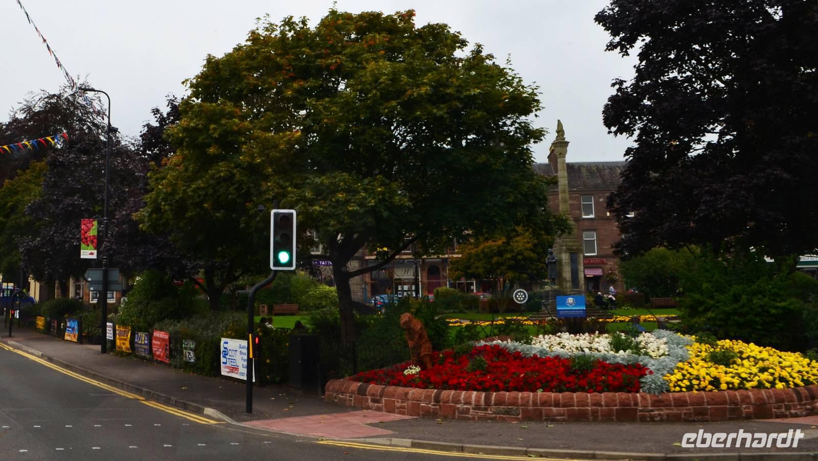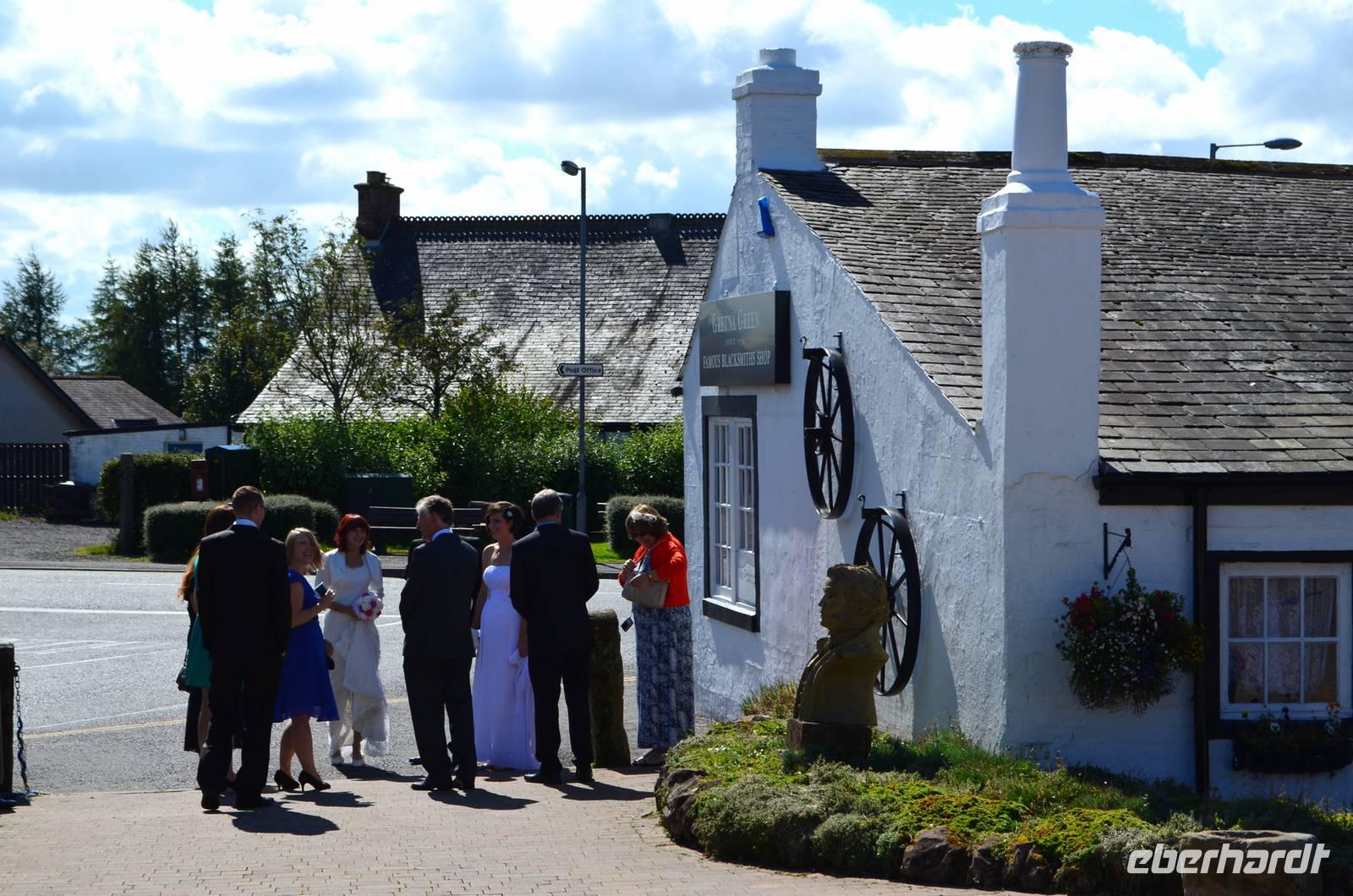 10:30 Uhr (GMT) saßen alle im Bus und die Fahrt begann, zuerst durch die englischen Lande entlang des Hadrianwalls, vorbei an Corbridge und durch die nördlichen Peninnen bis hinüber nach Carlisle. Von hier war dann die schottische Grenze schnell erreicht und auch unser erstes Ziel, die alte Hochzeitsschmiede in Gretna Green.
