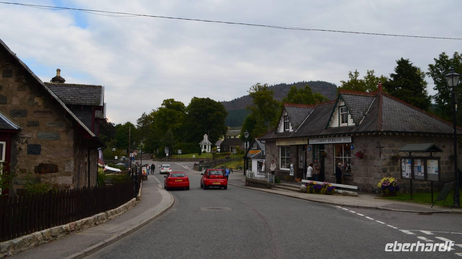 Schließlich ins schöne Tal des River Dee, vorbei an Balmoral Castle und Braemar Castle nach Braemar, wo wir Pause machen, um uns den Ort genauer anzusehen.