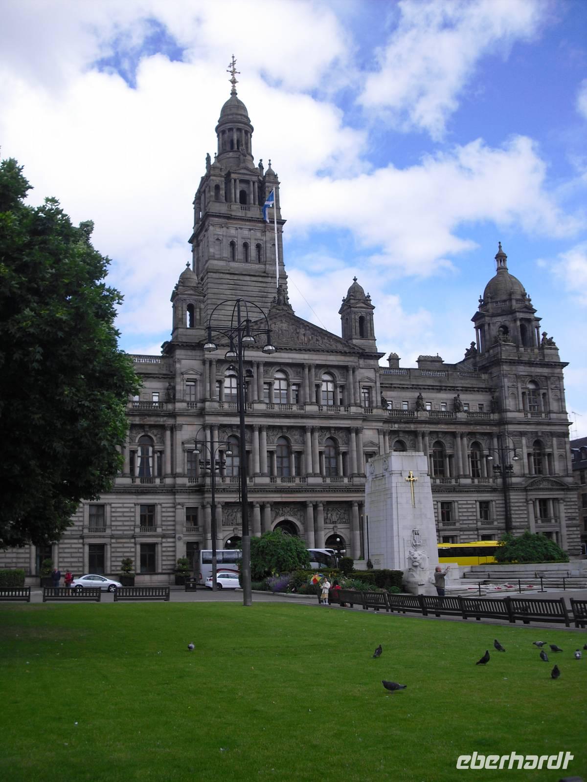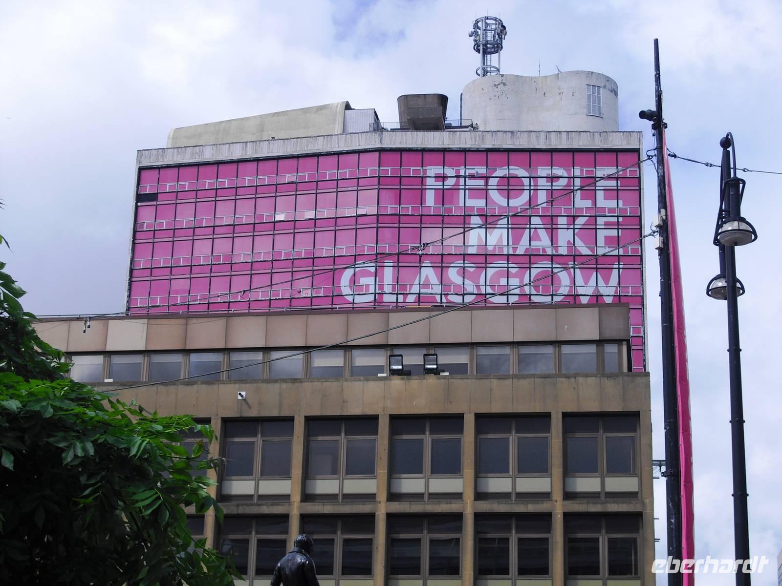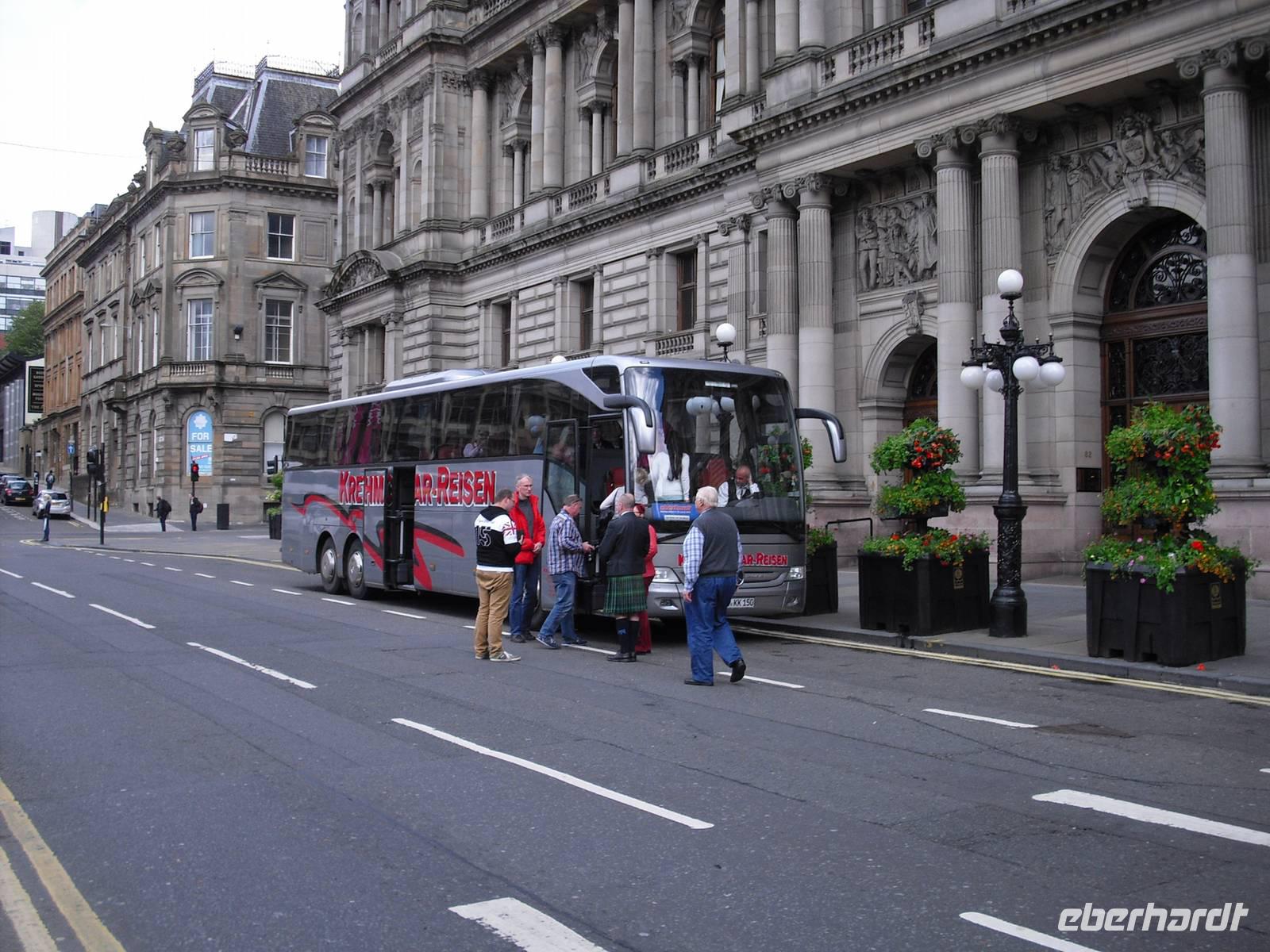 Nun wurde es Zeit nach Glasgow aufzubrechen denn dort warteten Flugreisegäste und unser Stadtführer Fraser Gordon auf uns. Mit großer Sachkenntnis und schottischem Humor machte er uns mit seiner Stadt bekannt. Wir sahen die eindrucksvolle gotische St. Mungo Kathedrale, den George Square mit dem Rathaus, Glasgow Green mit The People Palace, das Universitätsviertel, das rote Sandsteingebäude der Art Gallery and Museum Kelvingrove und auch die ehemaligen Werft- und Hafenanlagen am River Clyde.