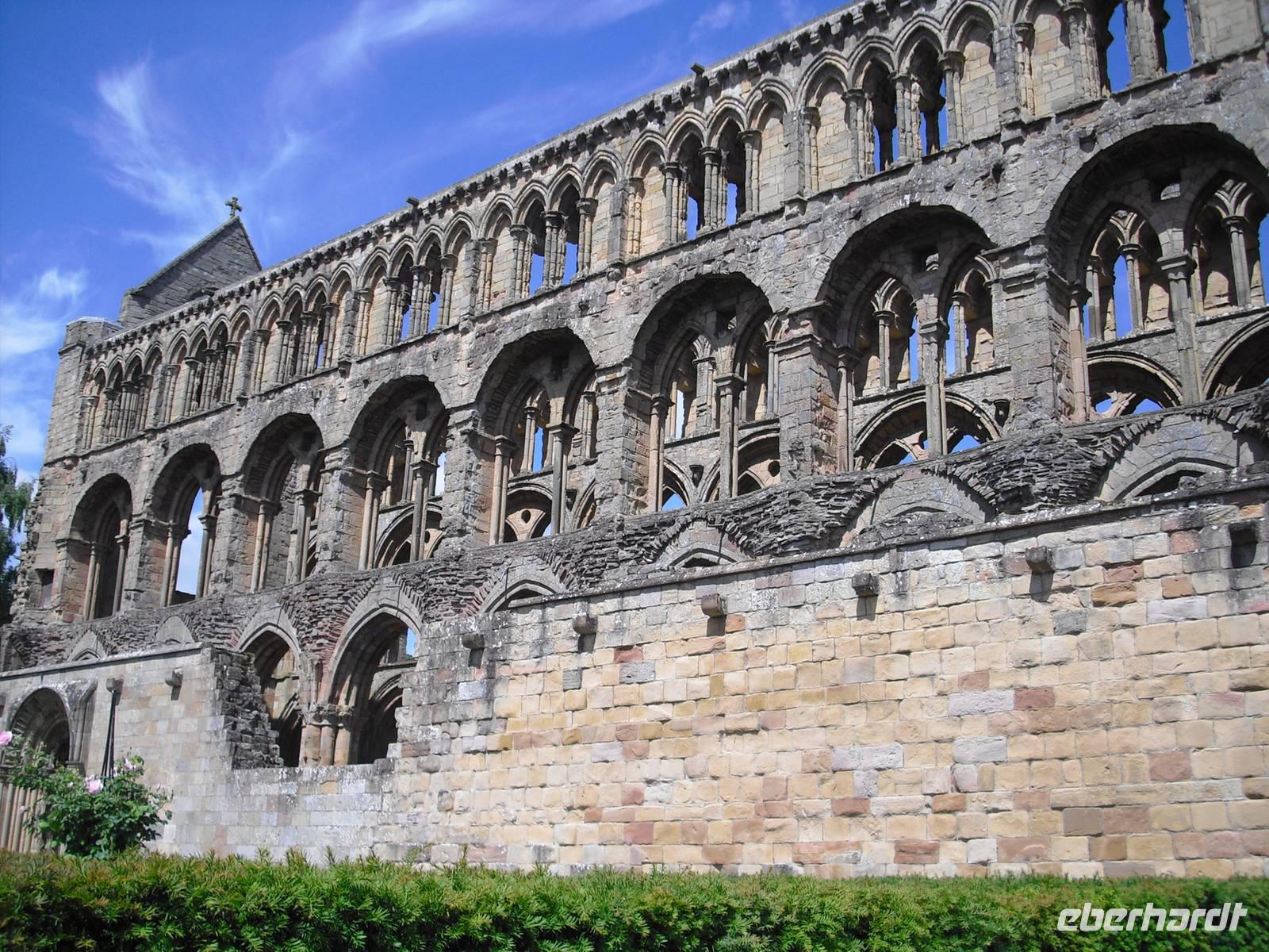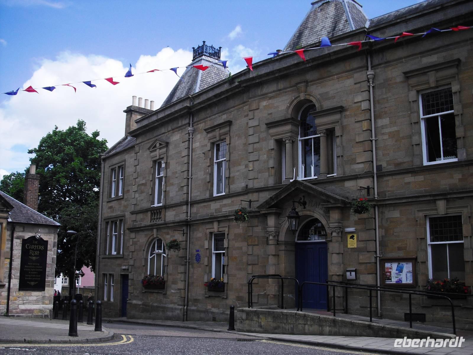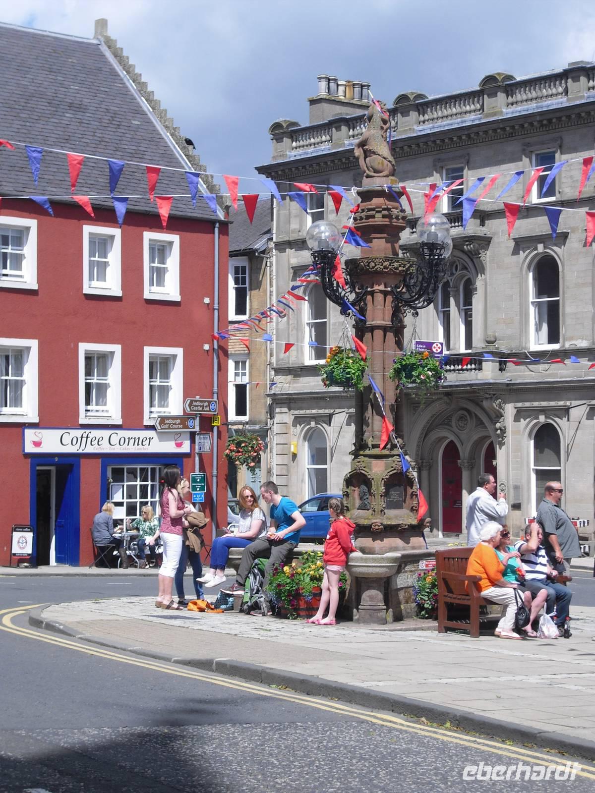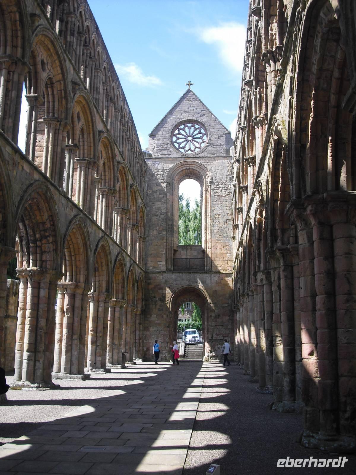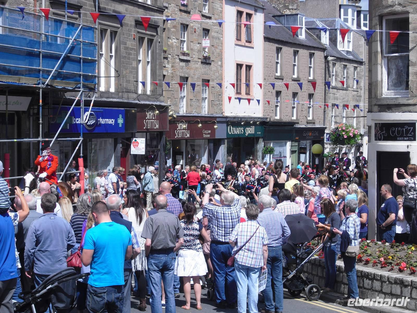 Nur wenige Meilen weiter erreichten wir Jedburgh und besichtigten dort eine weitere Grenzlandabtei - Jedburgh Abbey. Wiederum David I. gab 1138 den Auftrag zum Bau. Sein Sohn wurde in der Abteikirche 1153 als Malcolm IV. zum schottischen König gekrönt. Nach zahlreichen vorherigen Angriffen wurde die Abtei 1545 durch englische Truppen unter dem Grafen von Hertford zerstört. Klöster waren wirtschaftliche Zentren und sie zu zerstören, strategische Absicht. Wir hatten in Jedburgh auch noch eine Überraschung: Um 13.00 Uhr fand das Common Riding statt. Mit Piperband und vielen Schotten hoch zu Ross begann das alljährliche Fest, das zahlreiche Schaulustige und Interessierte ( so auch uns ) anzog.