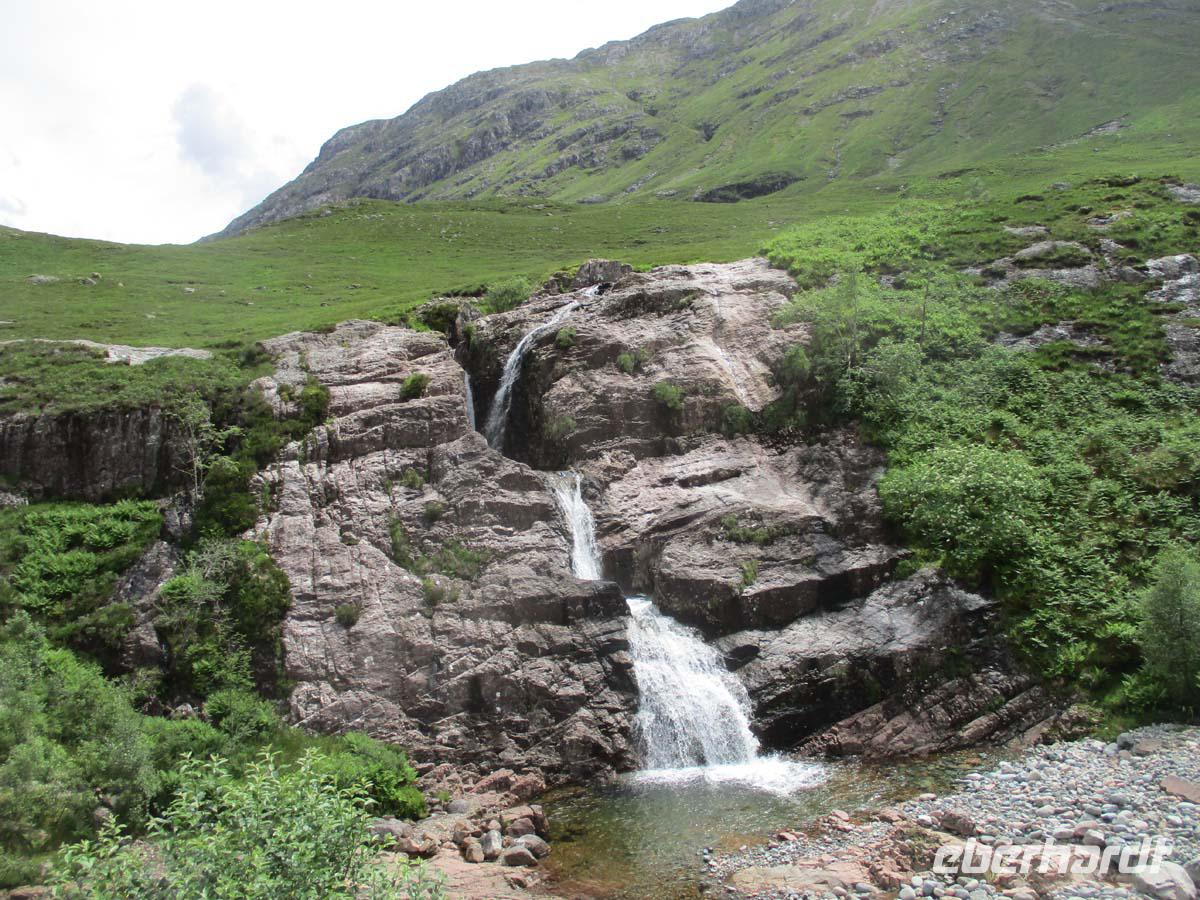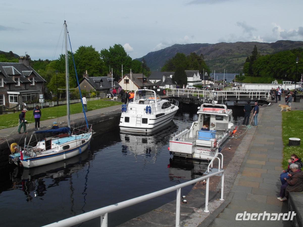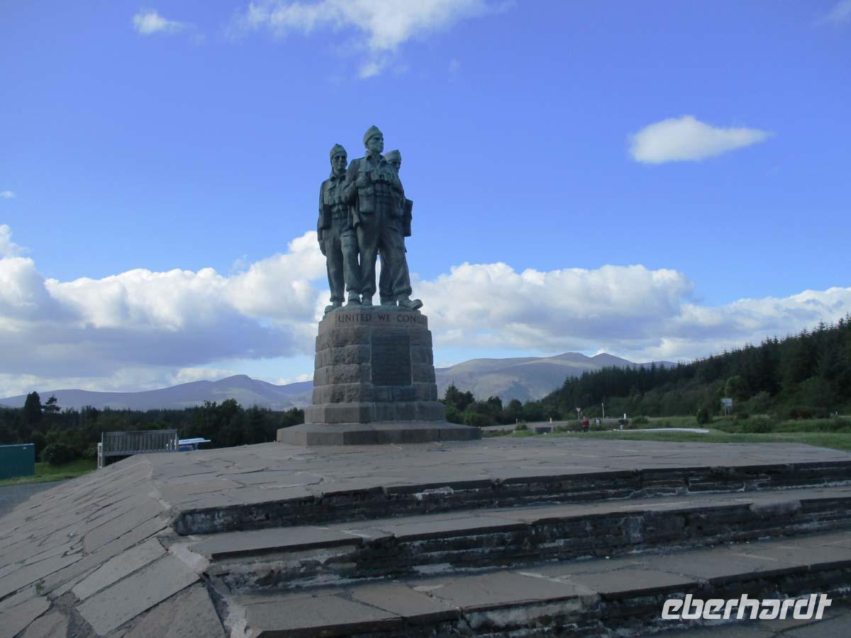 Fast ist es schon gute Tradition, das den Gästen auf Eberhardt Reisen etwas mehr geboten wird, als im Katalog steht. Also begeben wir uns zu den Morriston Falls. Hier rauscht das Wasser des Morriston schäumend vor einer uralten Brücke die Felsen hinab. Sogar Lachse sehen wir beim Versuch, die Fälle springend zu überwinden. Am Loch Lochy vorbei besichtigen wir schon auf der Rückfahrt zum Hotel die 5-stufige Schleusentreppe von Fort Augustus. Sie gehört zum Caledonian Canal, der Anfang des 19. Jahrhunderts von Thomas Telford entworfen wurde. Einen letzten Stop legen wir am Commando Memorial kurz vor Spean Bridge ein, denn von hier aus hat man einen sehr guten Blick auf den Ben Nevis, der mit 1343 m der höchste Berg Schottlands und auch der britischen Insel insgesamt ist. Seine Spitze steckt er heute jedoch in die Wolken. Nach so viel Gesehenem schmeckt das etwas späte Abendessen im Hotel noch einmal so gut.